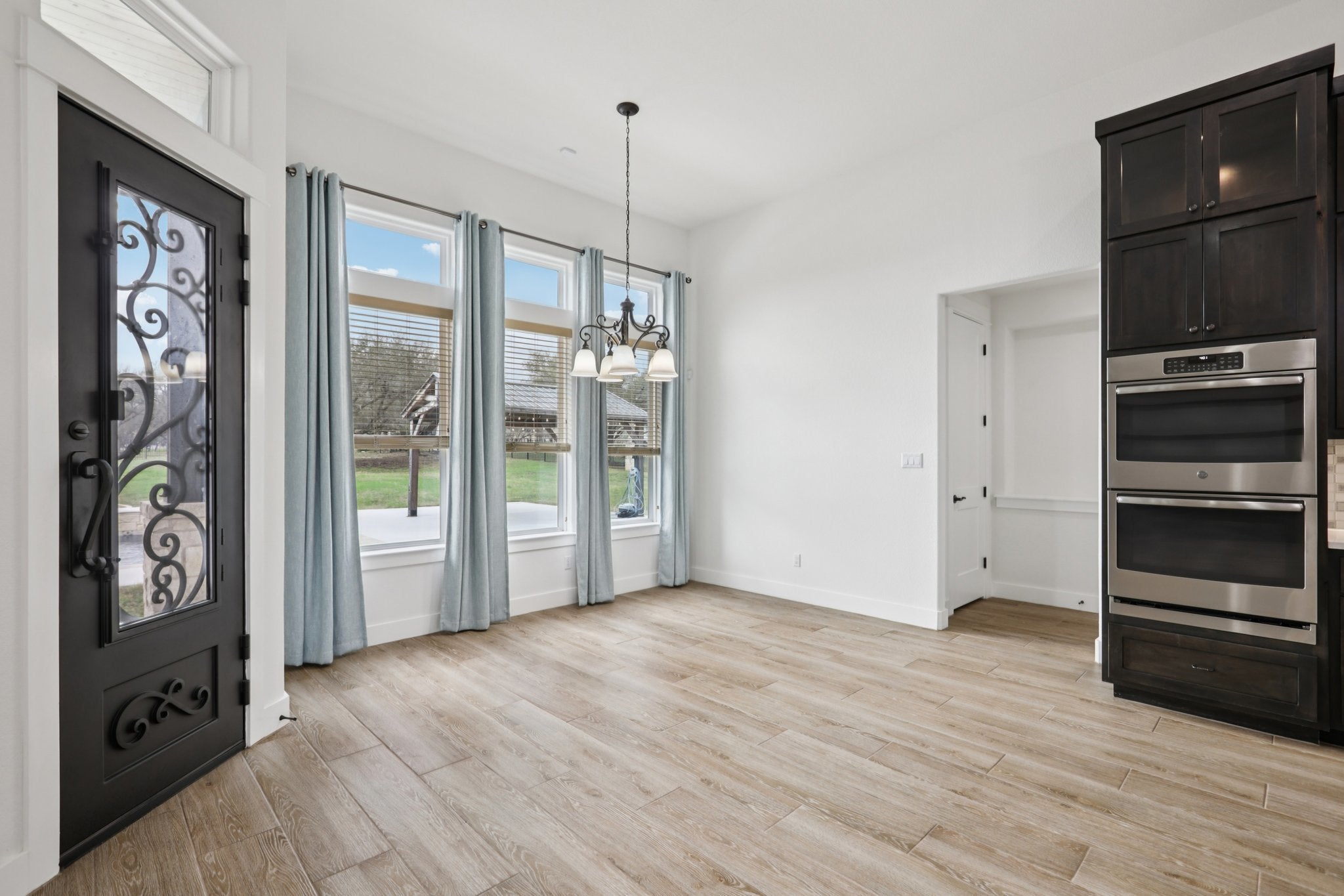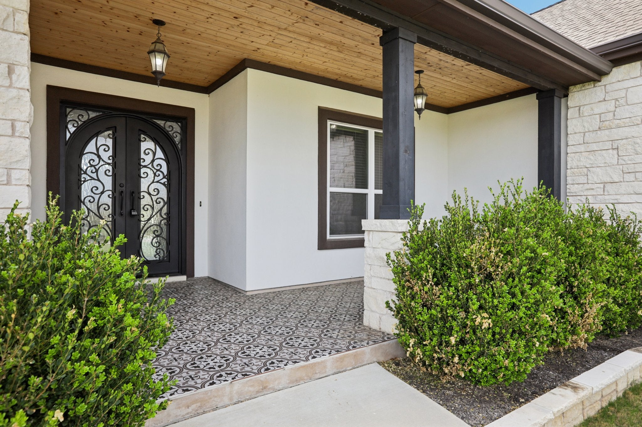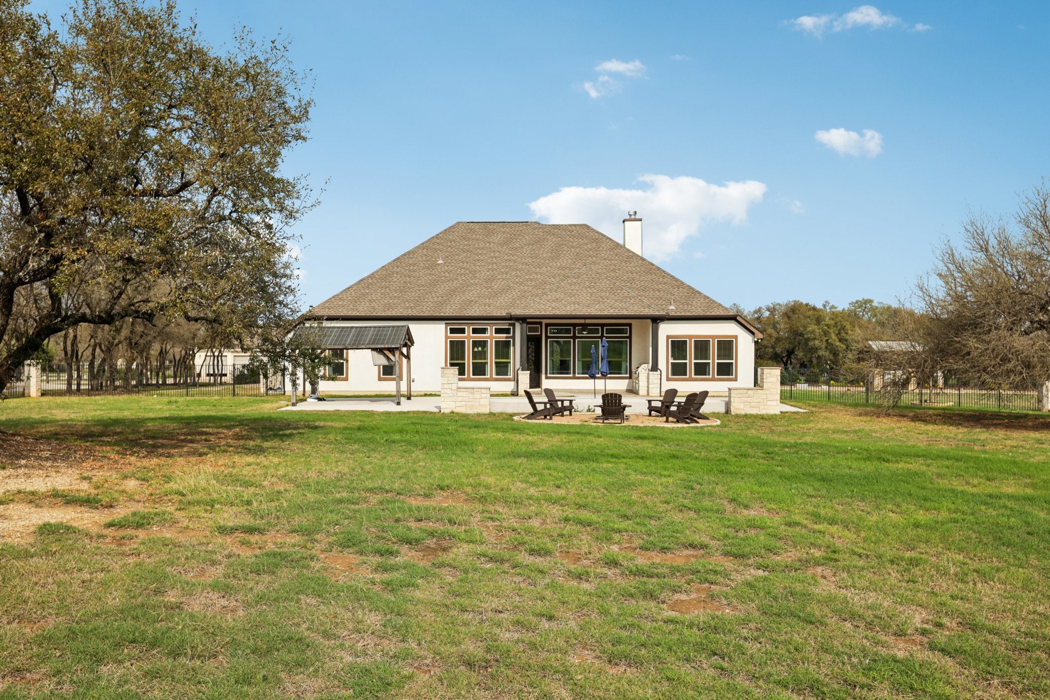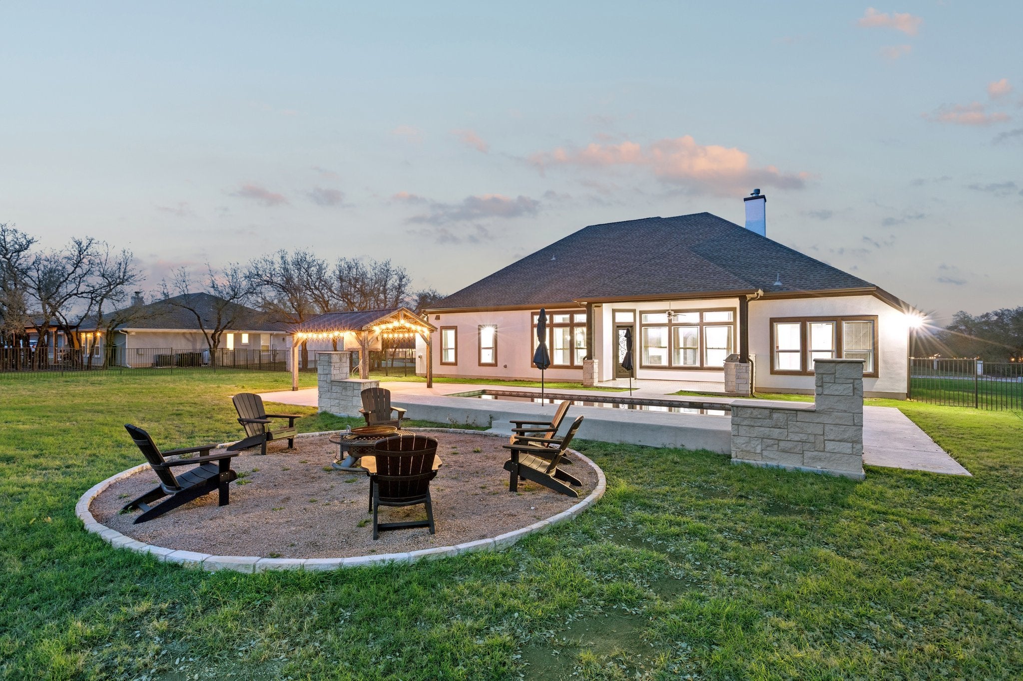 Situated on a beautiful 1 acre lot with mature trees, 112 Red Mulberry offers exceptional indoor and outdoor living in Leander. This thoughtfully designed home features 4 bedrooms, 3 bathrooms, a dedicated office, and a spacious 3 car garage with epoxied floors and built in storage. The interior showcases impressive ceiling heights, including 12 foot ceilings in the great room.The main living area is anchored by a floor to ceiling stone fireplace and enhanced with recessed LED lighting, custom light fixtures, and built in surround sound speakers.The gourmet kitchen is designed for both functionality and entertaining, featuring quartz countertops, cabinetry extending up to 10 feet, an induction cooktop, double ovens, a Blanco Silgranit 33 inch sink, and a spacious walk in pantry with a custom door. The primary suite offers a relaxing retreat with a large walk in shower, 6 foot soaking tub, and custom shelving in the primary closet. Additional bedrooms include custom closet shelving and generous storage throughout the home.Outdoor living is equally impressive with a heated and chilled pool, gazebo with power for lighting and television, fire pit area, and a fully equipped outdoor kitchen with built in grill and sink. The backyard is enhanced by mature trees, whole yard irrigation, and custom stone landscaping. Front and back porches feature custom tile and provide welcoming spaces to relax. Additional features include iron double entry doors, wood blinds throughout, water softener, whole house surge protector, alarm system, built in speakers on the back porch, and a mud bench area.This property offers a rare combination of acreage, custom finishes, and thoughtfully designed indoor and outdoor spaces.