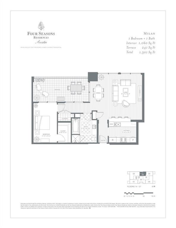 Four Seasons residences. Large one-bedroom with spacious living area and walls of windows overlooking the city. Dramatic views. Recessed terrace serves as a versatile outdoor living/dining area. Open gourmet kitchen with Wolf/Sub-Zero range and refrigerator. Spa-like bathroom. Four Seasons services and amenities including concierge, valet and room service.* Washer/dryer and second parking space negotiable. 12-month lease minimum. Admin fees to HOA at move in/move-out - inquire. 24-hour notice to show required. Text or call agent for appointment.
