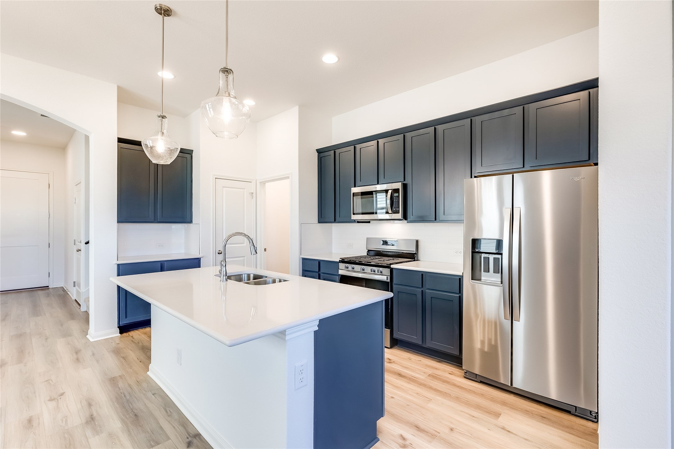 This charming townhome with 3 bedrooms, 2.5 bath + loft features luxury vinyl flooring in entry, living, dining, family, and the primary bedroom. Large, oversized shower with bench, seamless shower glass, and many designer touches throughout the home. The kitchen opens to the living area and features beautiful quartz countertops. Stainless steel Whirpool appliance package includes vented microwave, dishwasher, and a 5 burner gas stove. Upper level overlooks pool and pickleball court. Full 2-car garage with garage door opener. Situated just minutes from Old Settlers Park and downtown Round Rock, this thoughtfully designed gated community is a mix of cottages and townhomes, each with its own private fenced yard.