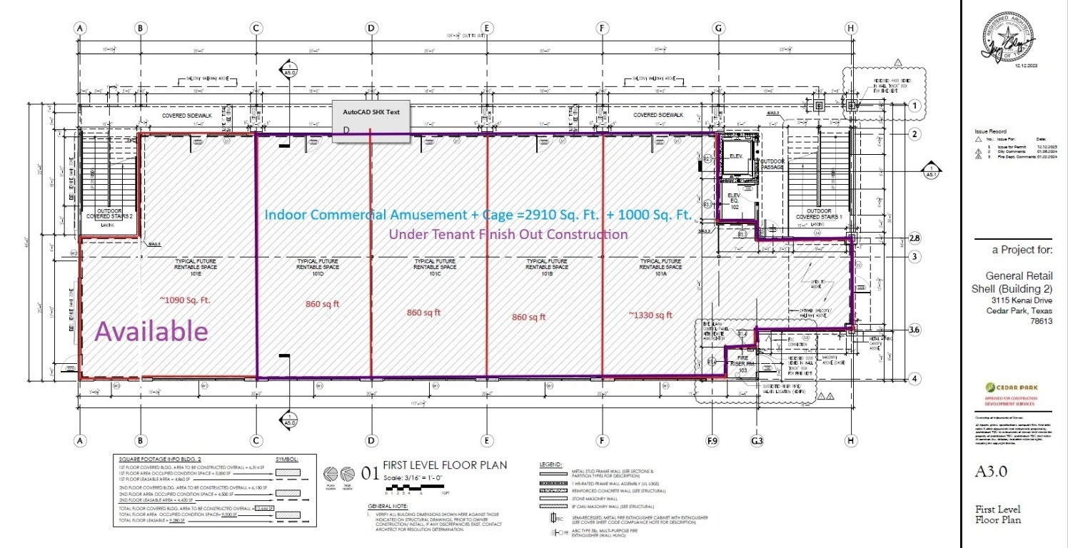 This is a shell building, completed on October 30, 2025, and is ready for occupancy with tenant finish-out. It is a very sought out great location in front of "The Ranch At Brushy Creek" and in "Breakaway Park" neighborhoods. The suites in the building is offered at a great rates of $32/sf. first floor + $10/sf NNN and $30/sf. second floor + $10/sf. NNN. Tenant incentive allowance is negotiable and free rent during construction. There is elevator to go to second floor. This building has 10 suites with minimum of 860 square feet (20 ft width x 43 ft depth) of lease space with 39 parking spaces and 1 loading zone with 45 ft depth by 12 ft width. The shopping center will have 9500 square feet (first floor 5000 sq. ft. and second floor 4500 sq ft.) of leasable retail spaces and office spaces. It is zoned LR (Local Retail). As permitted under LR zone, it can be leased for mixed usage such as grocery store, other retail store, restaurant and medical offices or other offices. Common rest rooms are provided to tenants.