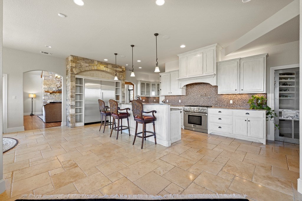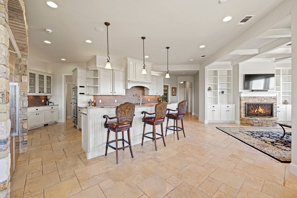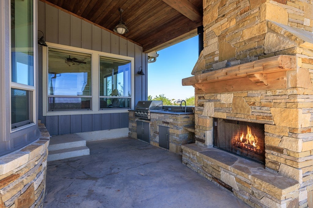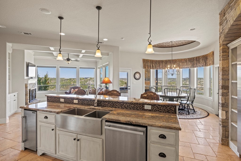 Stunning Hill Country Estate with Breathtaking Views! Nestled atop a scenic hill in the gated Eagles Crest Subdivision, this custom 4,000+ sq. ft. home on 7+ acres (two lots) offers serene country living just 7 miles from Fredericksburg, TX. Located at the end of a quiet cul-de-sac, the property features exceptional curb appeal, custom fencing, and elegant landscaping. Inside, the Great Room showcases soaring cathedral ceilings with exposed beams, a grand rock fireplace, formal dining area, and a wall of windows capturing sweeping Hill Country views. Travertine flooring adds timeless warmth throughout. The chef’s kitchen boasts Thermador stainless appliances, gas range, ice maker, custom cabinetry, oversized island with seating for six, and a large walk-in pantry. It opens to a cozy den with stone fireplace and access to the outdoor patio complete with built-in grill and rock fireplace—perfect for entertaining or relaxing. The primary suite is a private retreat with stunning views, patio access, and a luxurious bath featuring an outdoor shower—ideal for a future hot tub. Two guest bedrooms share a Jack & Jill bath, while upstairs includes a fourth bedroom, bath, flex room, office/sitting area, and storage. Additional highlights: dedicated study, utility room with sink and extra fridge/freezer space, 20KW generator, sprinkler system, garden shed, security system, and ample room for a future guest house or workshop. An extraordinary Hill Country residence offering privacy, elegance, and breathtaking views.