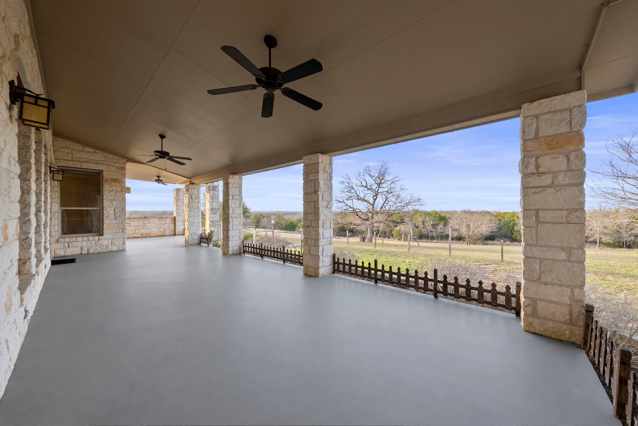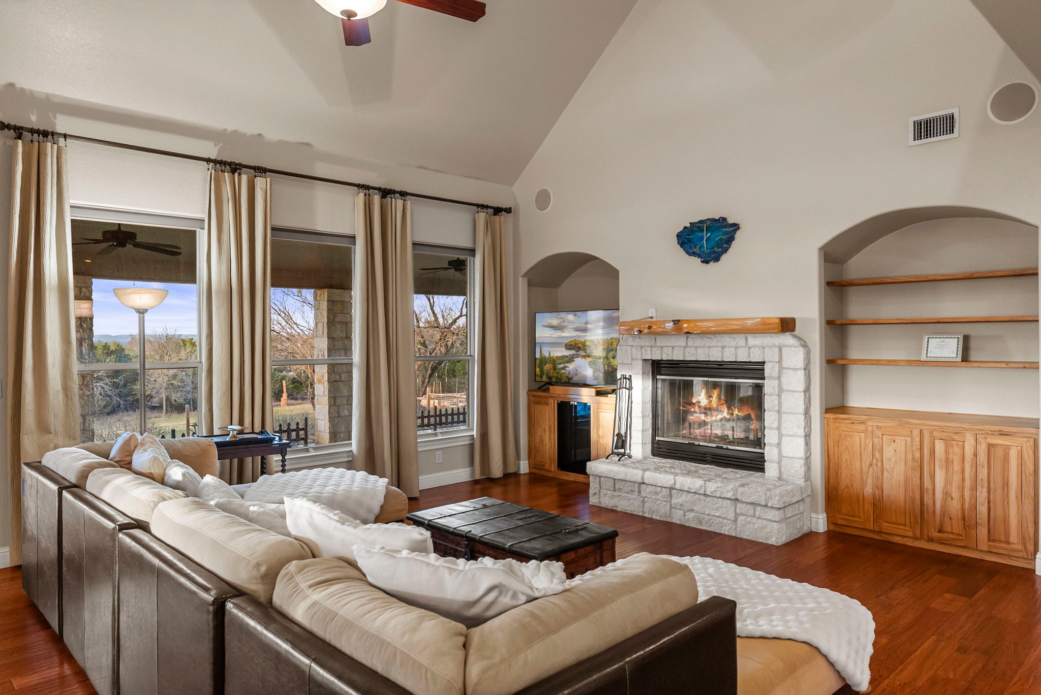 Live at the top and have the views and all the lifestyle options. Priced well below Burnet CAD taxable value. This end of the road, cul-de-sac 3.44 acre lot is choice. Enjoy floorplan flexibility and lots of opportunity for hobbies. Home features one story living with large primary suite and secondary bedroom suite downstairs. Additional bedrooms/office/game room/media room space upstairs. Huge conditioned, easily accessible storage space or future living space expansion upstairs. No carpet, with wood and tile floors throughout. Large covered back porch and upstairs porch to take in ALL the views. Oversized attached, two car garage PLUS huge detached garage for RV, boat, ATV, equipment, toys or all of those. Includes attached workshop for workout area, studio, or whatever you need it to be. Fruit trees, garden areas already in place. Rainwater catchment off of home and detached garage. High speed internet allows for working from home, and running today's technology and devices. Double Horn is a gated subdivision, with a hill country feel, without being too far from conveniences. Double Horn features a community amenity center with pool, pavilion, restrooms, playground, sport courts and pond. 25 to 30 minutes into Bee Cave and Lakeway. 15 to 20 into Marble Falls.