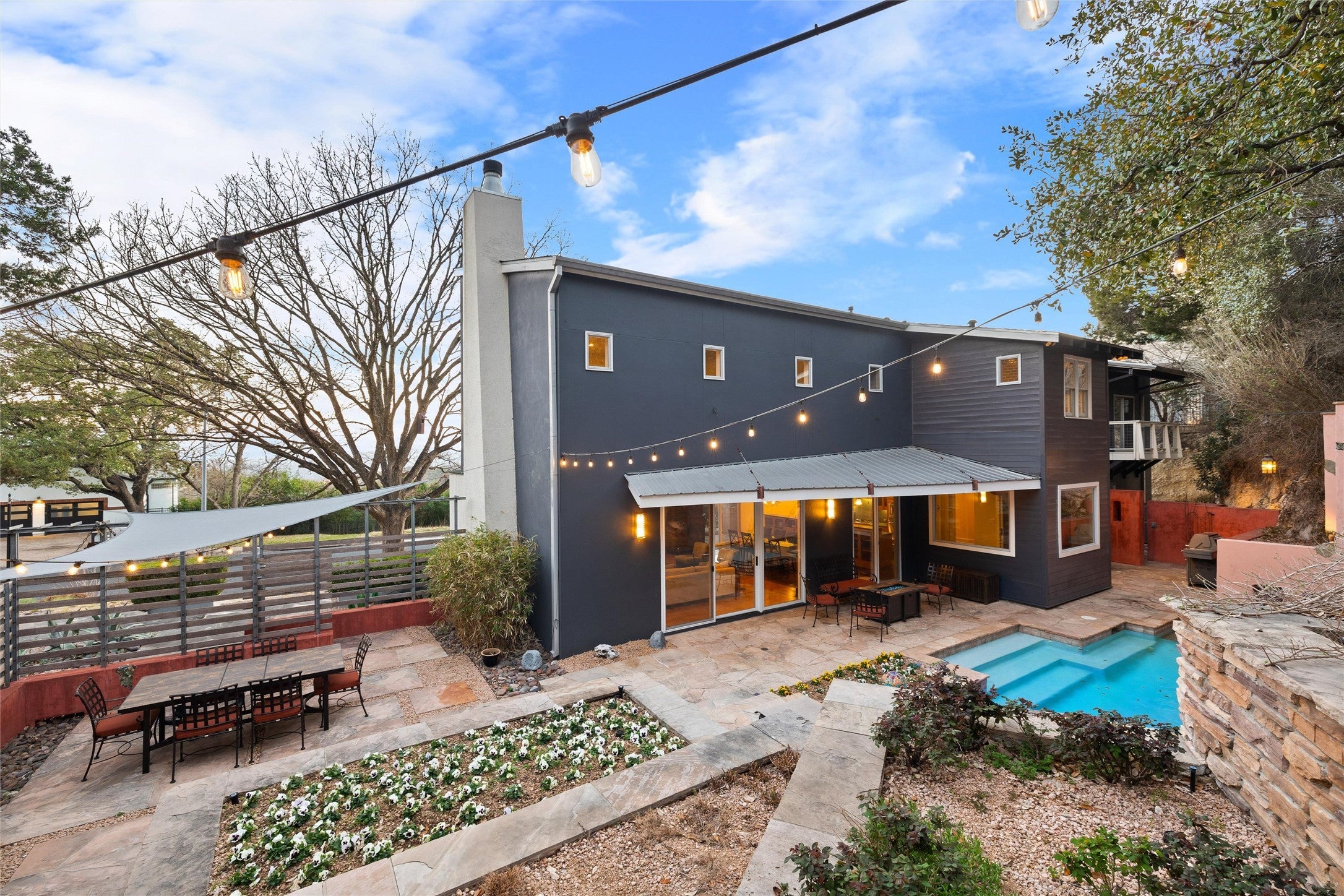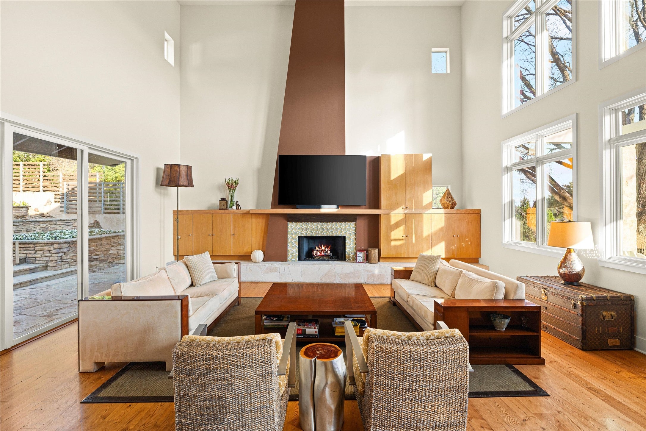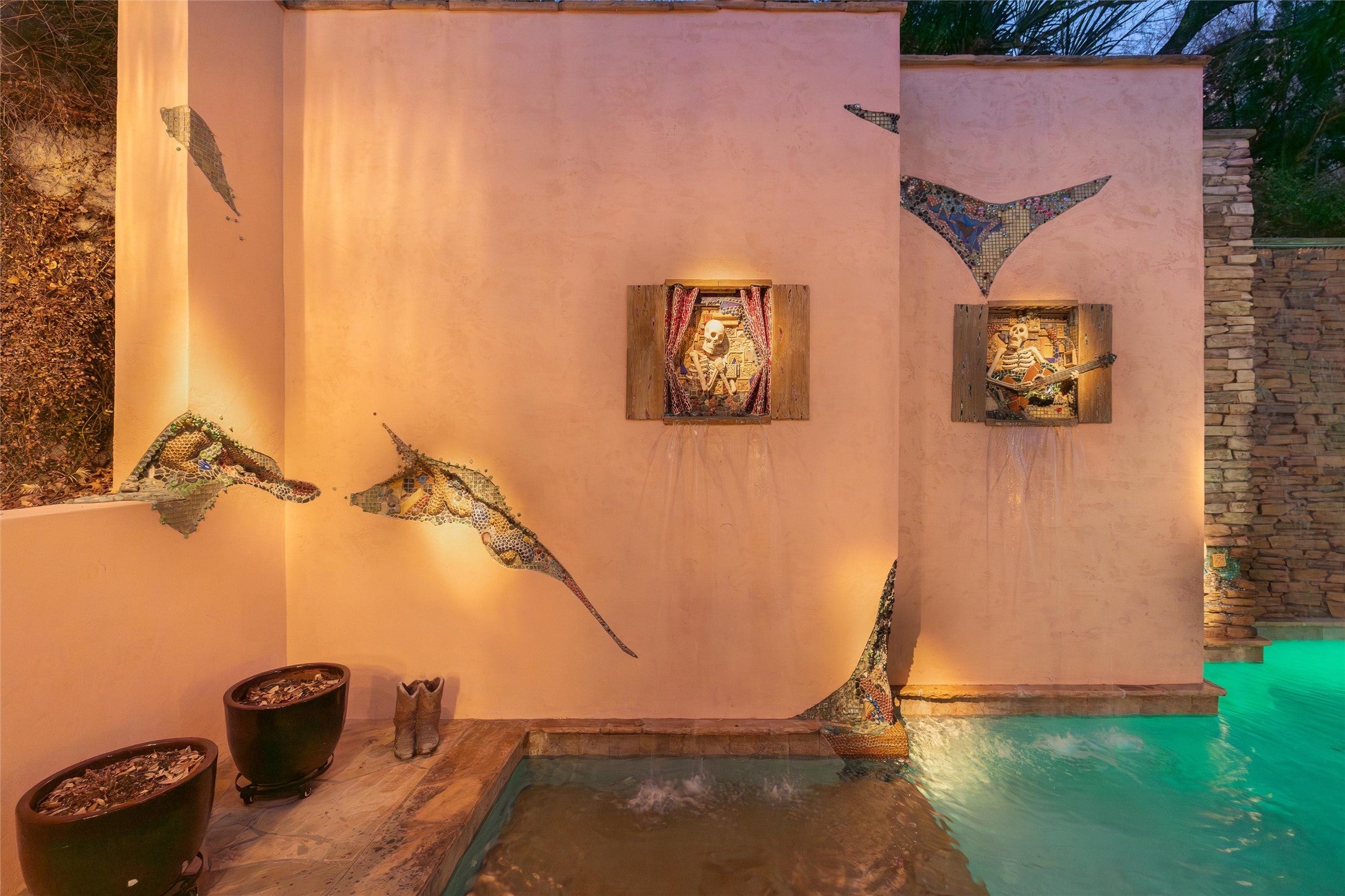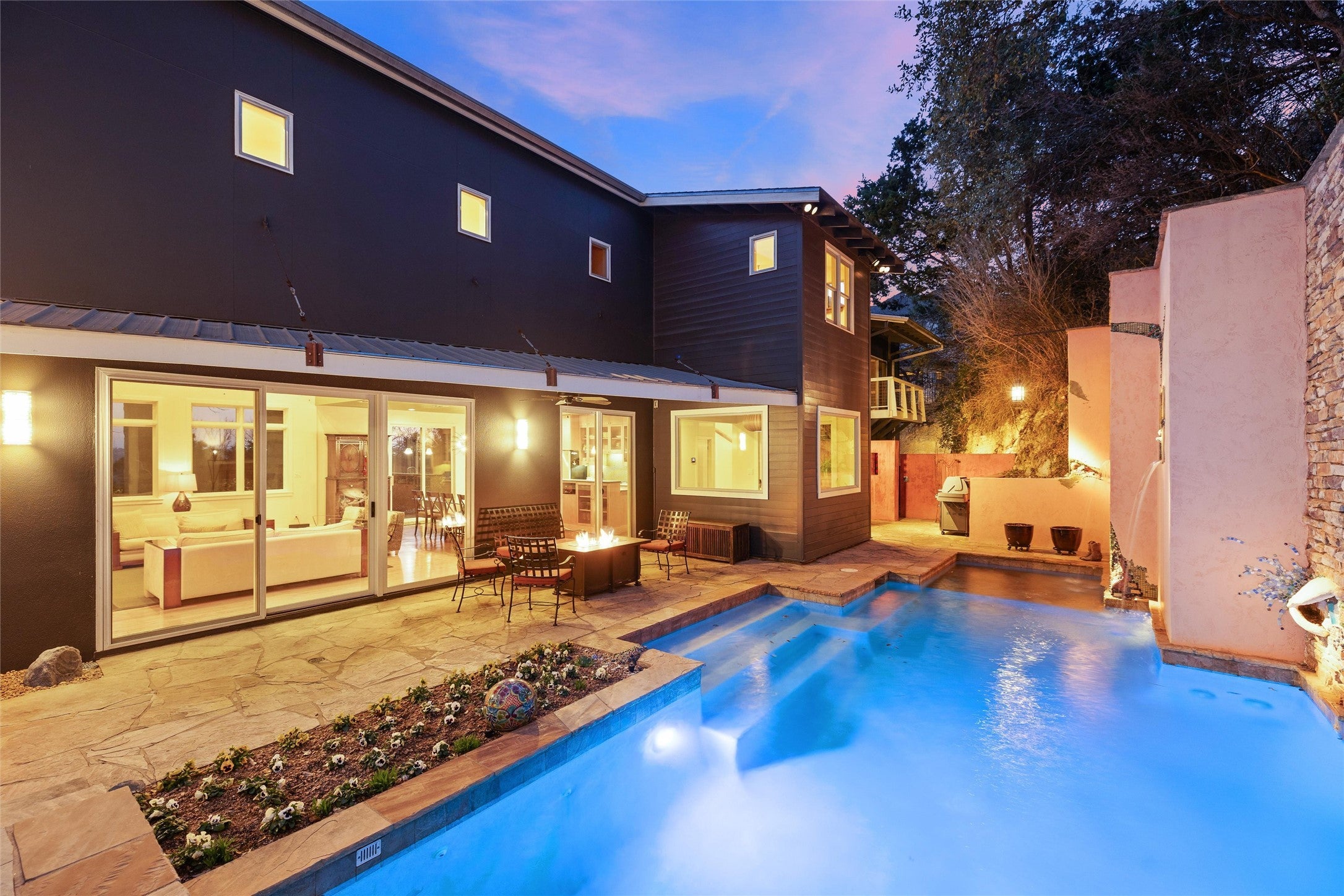 Experience elevated living in this striking contemporary home in Cat Mountain, nestled within Northwest Hills and showcasing sweeping views of the Texas Hill Country and Lake Austin. A dramatic 25-foot living room welcomes you inside, filled with natural light and centered around a statement fireplace with custom built-ins. The backyard is an artistic retreat, complete with a beautifully designed pool, cascading waterfall feature, limestone walls, and curated art elements that create a truly one-of-a-kind outdoor setting. The open-concept design flows effortlessly into a chef-inspired kitchen with expansive counters, stainless steel appliances, and a wine and beverage cooler, while glass doors frame seamless indoor-outdoor entertaining. A main-level bedroom and full bath offer flexibility for guests. Upstairs, a second living area wrapped in windows captures greenbelt and Hill Country views, alongside a serene primary suite with private balcony and spa-like bath featuring a soaking tub and oversized shower. Two additional bedrooms, a shared bath, and an upstairs laundry room complete the level. Recent improvements include a new roof and wiring for a standby generator. For expanded privacy, the adjacent Lot #30 (.376 acre) and an additional .419-acre lot are available separately and may be combined for over three-quarters of an acre of professionally landscaped grounds. Ideally located between downtown Austin and The Domain, this is a rare opportunity in one of the city’s most coveted settings.