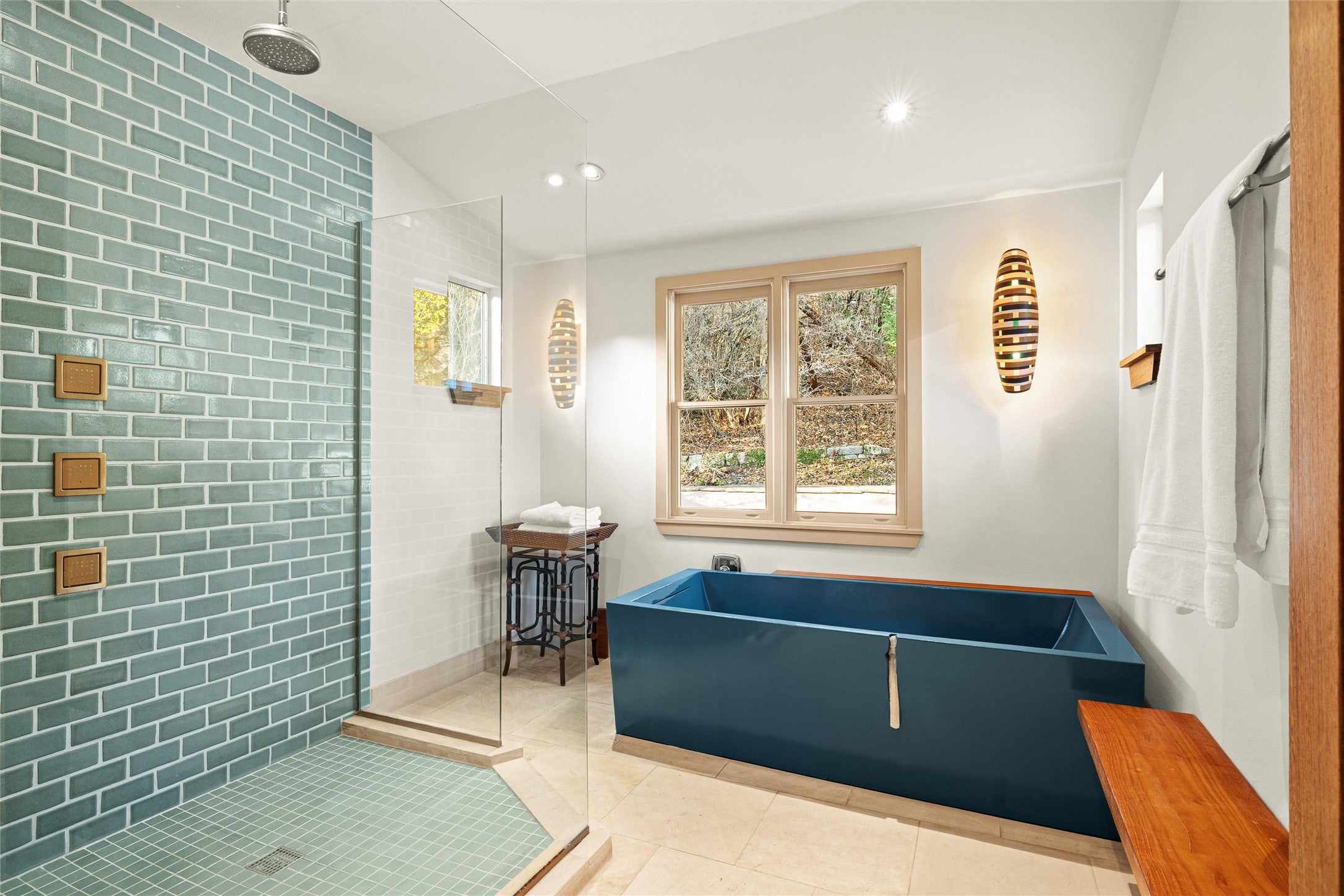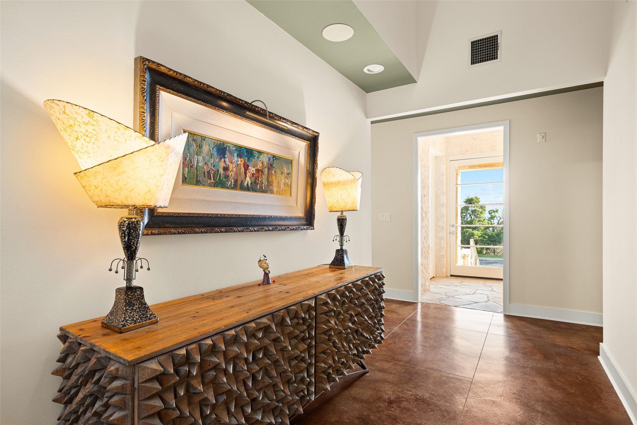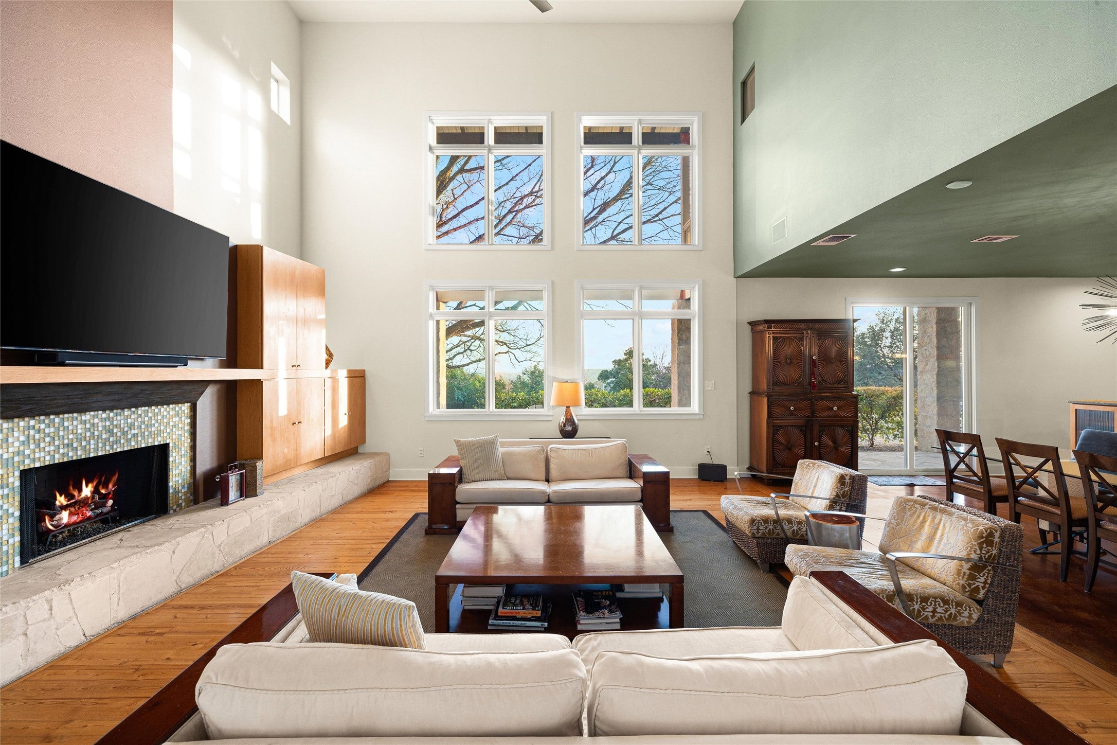 Experience elevated living in this striking contemporary home in Cat Mountain, nestled within Northwest Hills and showcasing sweeping views of the Texas Hill Country and Lake Austin. A dramatic 25-foot living room welcomes you inside, filled with natural light and centered around a statement fireplace with custom built-ins. The backyard is an artistic retreat, complete with a beautifully designed pool, cascading waterfall feature, limestone walls, and curated art elements that create a truly one-of-a-kind outdoor setting. The open-concept design flows effortlessly into a chef-inspired kitchen with expansive counters, stainless steel appliances, and a wine and beverage cooler, while glass doors frame seamless indoor-outdoor entertaining. A main-level bedroom and full bath offer flexibility for guests. Upstairs, a second living area wrapped in windows captures greenbelt and Hill Country views, alongside a serene primary suite with private balcony and spa-like bath featuring a soaking tub and oversized shower. Two additional bedrooms, a shared bath, and an upstairs laundry room complete the level. Recent improvements include a new roof and wiring for a standby generator. For expanded privacy, the adjacent Lot #30 (.376 acre) and an additional .419-acre lot are available separately and may be combined for over three-quarters of an acre of professionally landscaped grounds. Ideally located between downtown Austin and The Domain, this is a rare opportunity in one of the city’s most coveted settings.