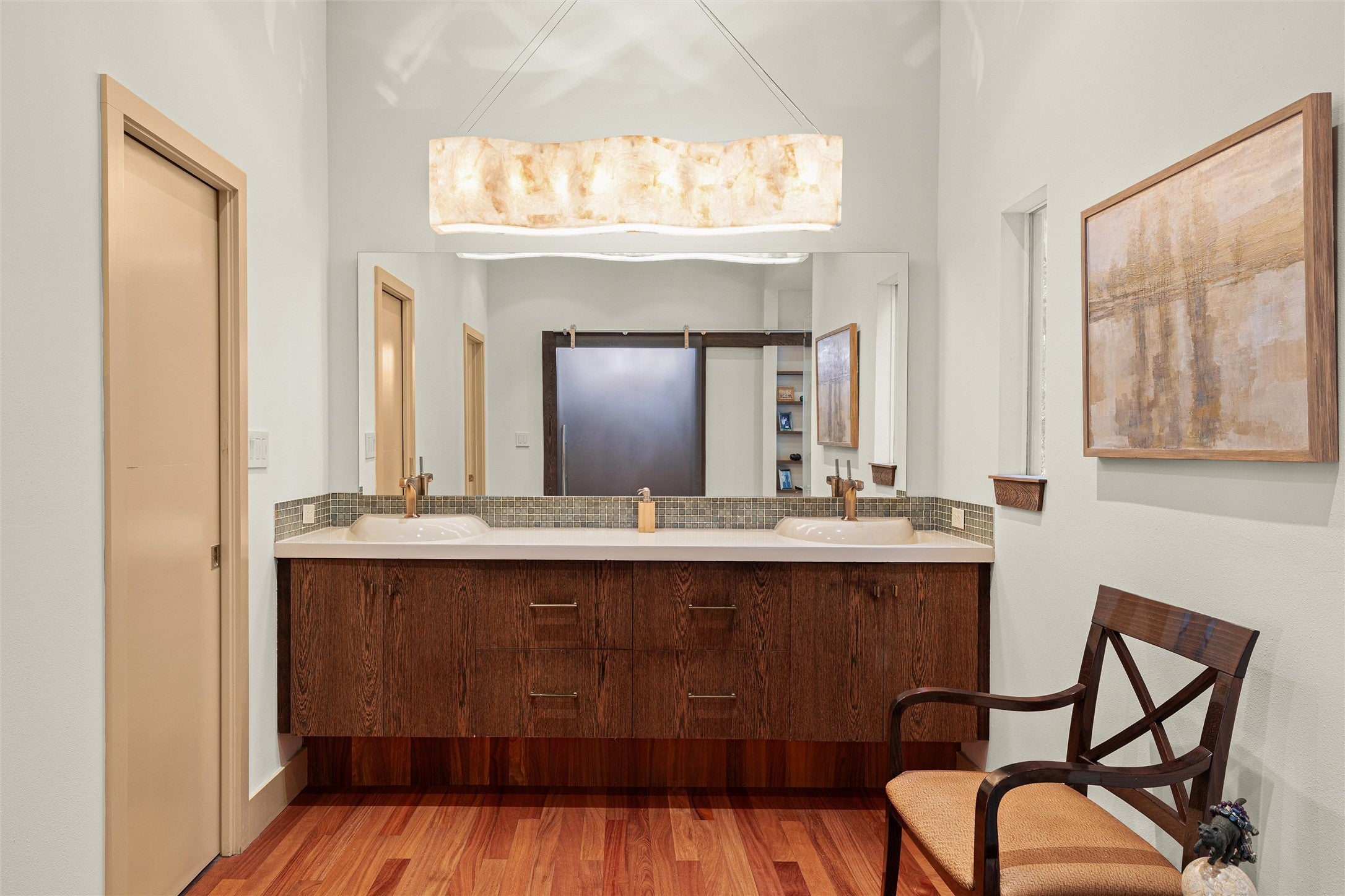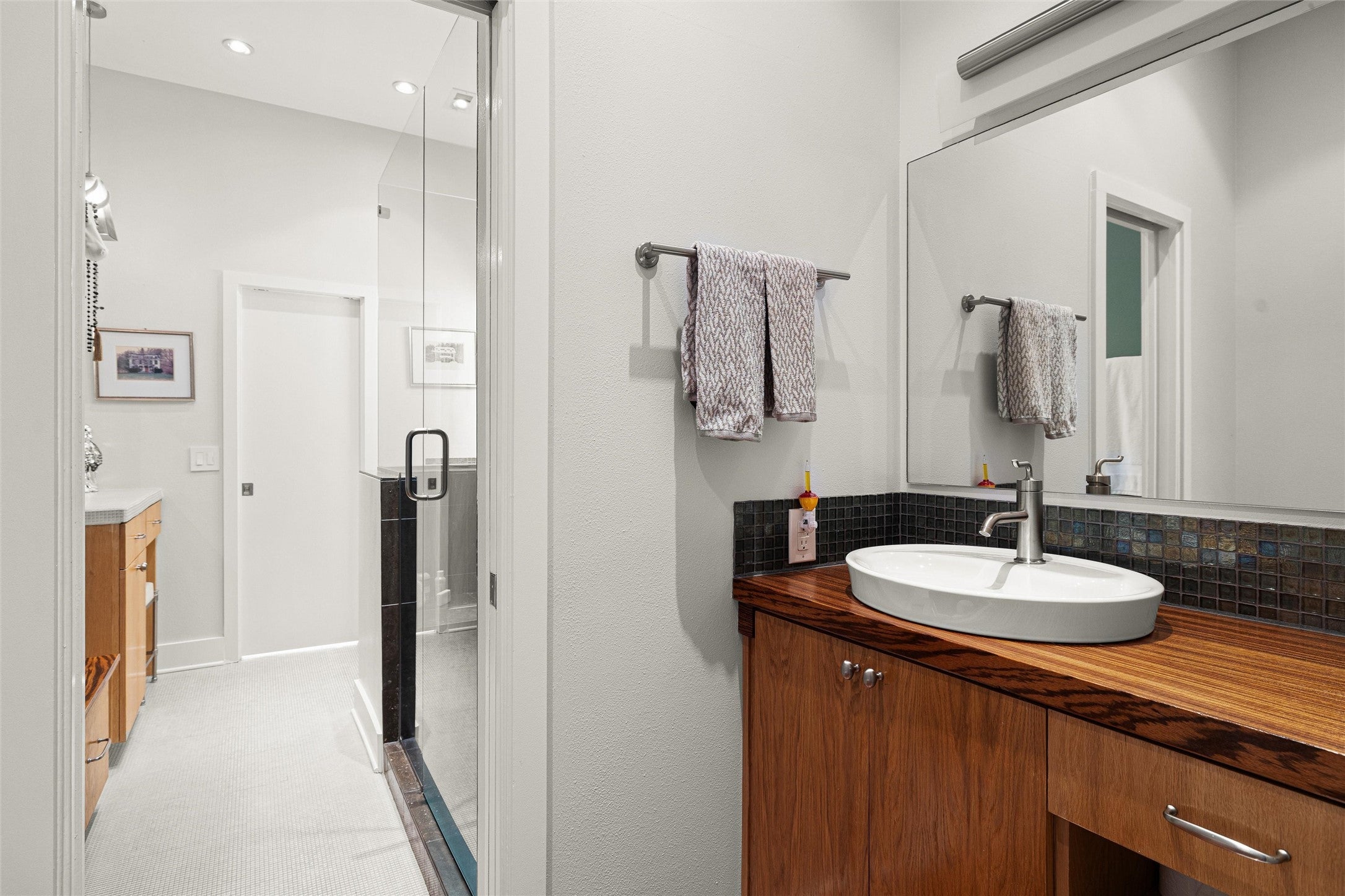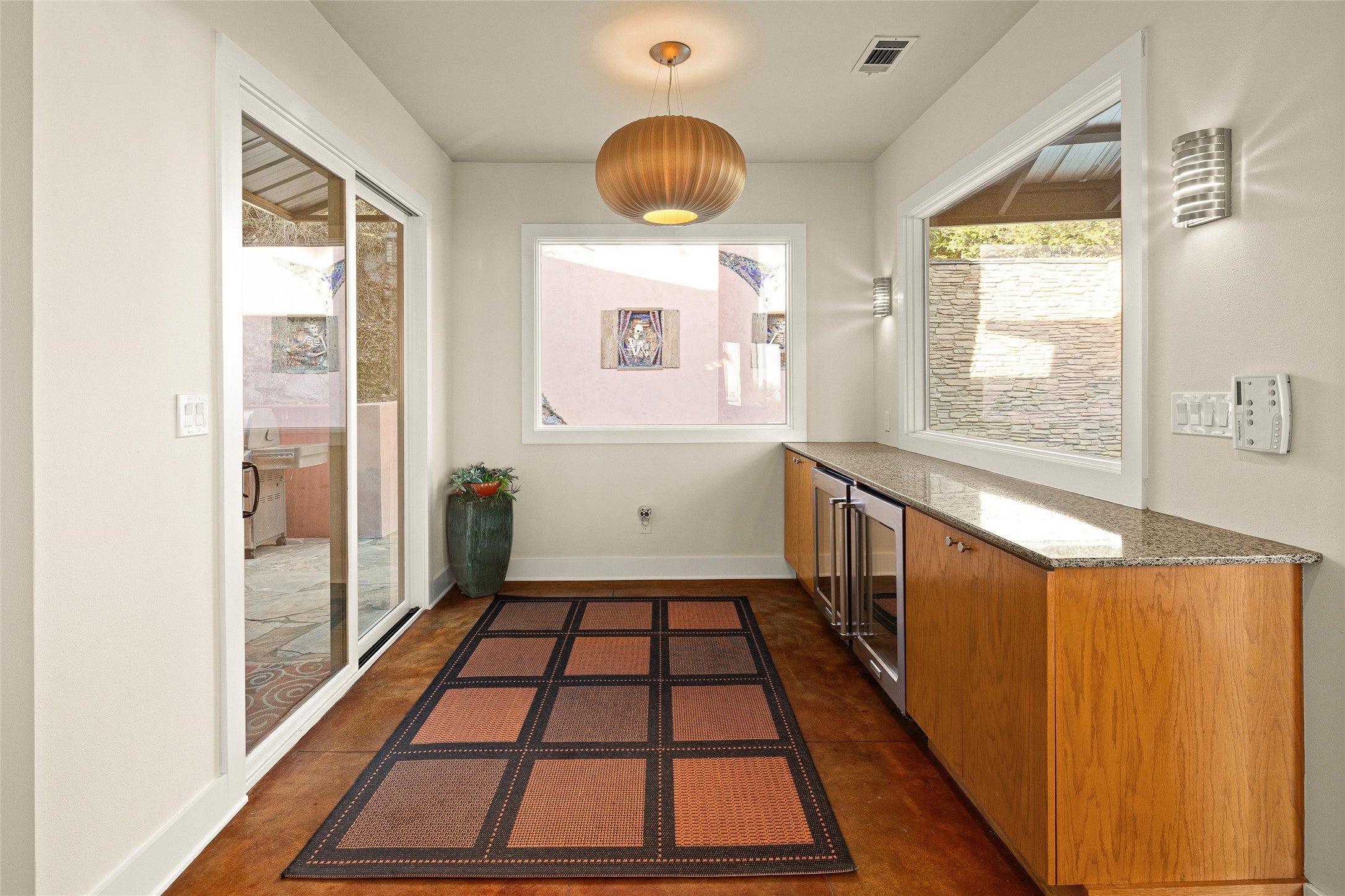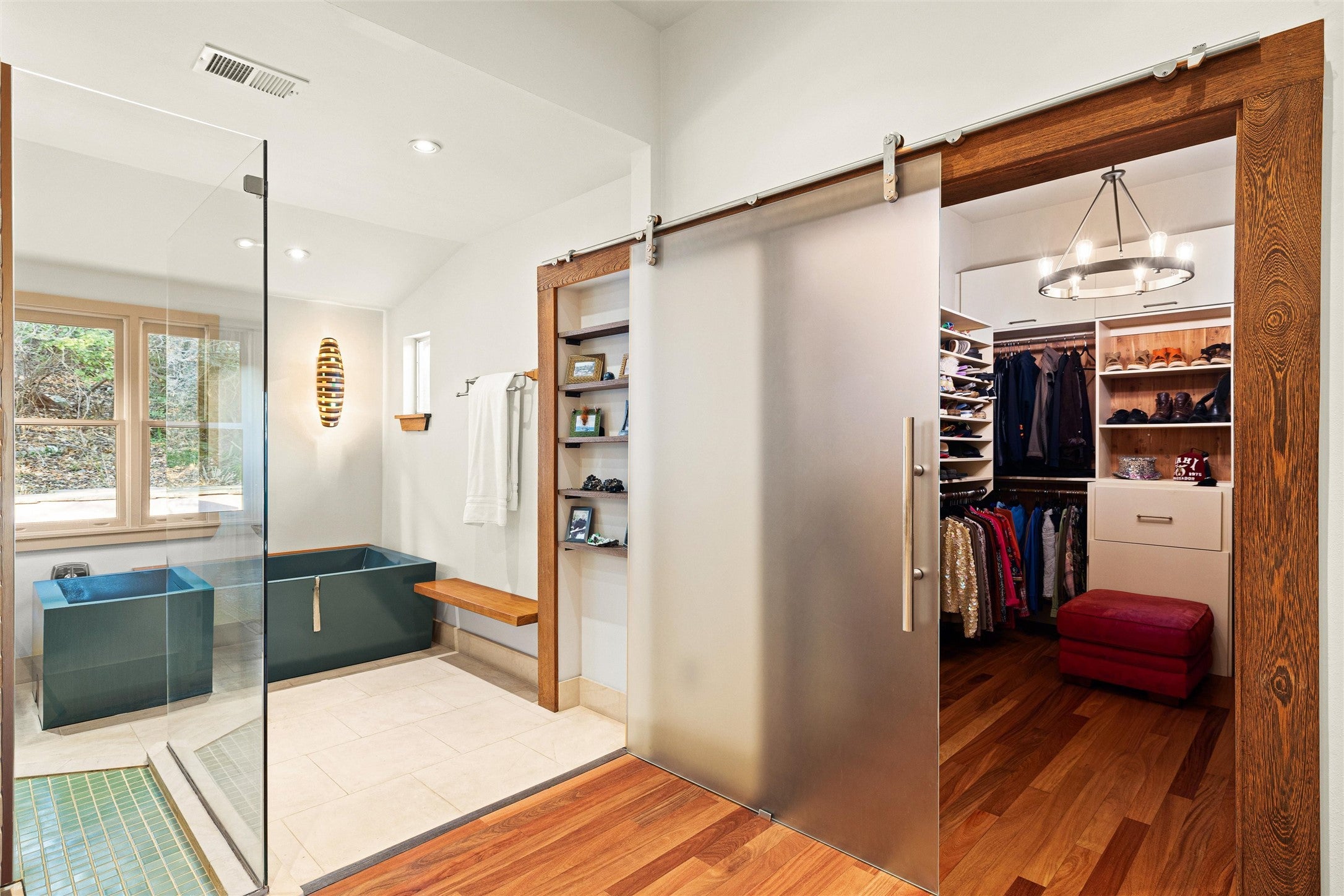 Experience elevated living in this striking contemporary home in Cat Mountain, nestled within Northwest Hills and showcasing sweeping views of the Texas Hill Country and Lake Austin. A dramatic 25-foot living room welcomes you inside, filled with natural light and centered around a statement fireplace with custom built-ins. The backyard is an artistic retreat, complete with a beautifully designed pool, cascading waterfall feature, limestone walls, and curated art elements that create a truly one-of-a-kind outdoor setting. The open-concept design flows effortlessly into a chef-inspired kitchen with expansive counters, stainless steel appliances, and a wine and beverage cooler, while glass doors frame seamless indoor-outdoor entertaining. A main-level bedroom and full bath offer flexibility for guests. Upstairs, a second living area wrapped in windows captures greenbelt and Hill Country views, alongside a serene primary suite with private balcony and spa-like bath featuring a soaking tub and oversized shower. Two additional bedrooms, a shared bath, and an upstairs laundry room complete the level. Recent improvements include a new roof and wiring for a standby generator. For expanded privacy, the adjacent Lot #30 (.376 acre) and an additional .419-acre lot are available separately and may be combined for over three-quarters of an acre of professionally landscaped grounds. Ideally located between downtown Austin and The Domain, this is a rare opportunity in one of the city’s most coveted settings.
