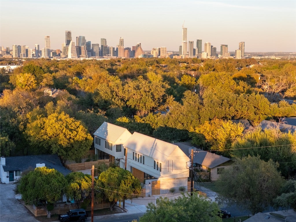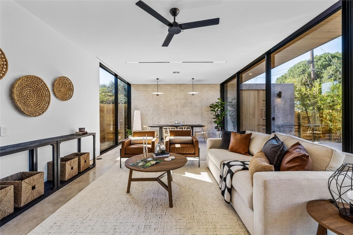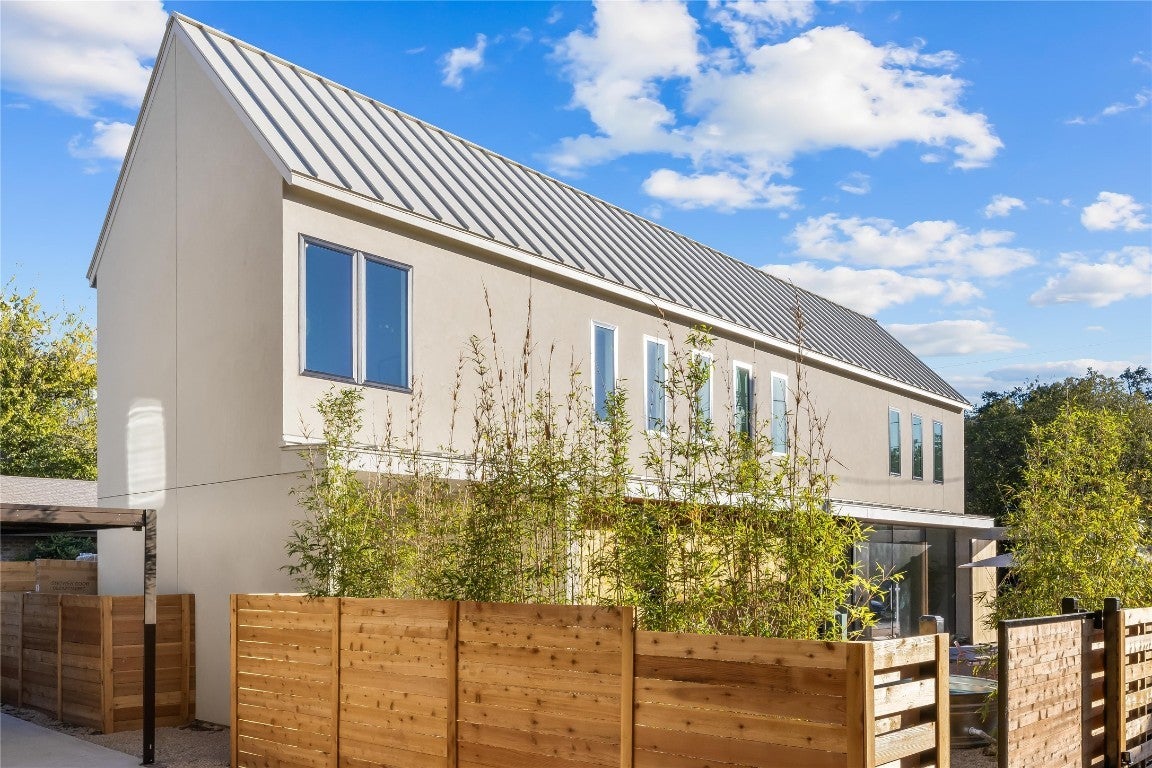 Experience the best of South Austin living in this modern architectural gem, perfectly situated in the heart of the iconic 78704 zip code. Designed with intention and artistry, this brand-new two-story home fuses the quiet harmony of Japanese minimalism with the relaxed warmth of Balinese design—creating a space that feels both calming and effortlessly livable. From the moment you step inside, natural light pours through an entire wall of glass and expansive floor-to-ceiling windows, illuminating polished concrete floors and an open-concept layout that feels both airy and grounded. The main level invites connection—whether gathered around the sleek quartz-wrapped kitchen island, enjoying a meal in the framed dining nook, or relaxing in the spacious living area that flows seamlessly toward the private, fully fenced yard. Every detail has been considered: custom cabinetry, tile backsplash, concealed curtain tracks, USB-integrated bedside outlets, recessed lighting, frameless doors, and Wi-Fi-enabled switches—all designed for an uncluttered, functional aesthetic. A dedicated workspace offers flexibility for creative pursuits or remote work, with discreetly integrated outlets and thoughtful proportions. Upstairs, solid oak floors lead to three serene bedrooms and spa-inspired baths featuring terracotta-toned tile, floating vanities, and hidden toilet tanks for a crisp, modern finish. The primary suite evokes resort-style tranquility—an ideal retreat balancing texture, tone, and simplicity. Outside, the oversized yard offers room to lounge, entertain, with an easy to maintain cowboy pool for refreshing dips. Minimalist yet soulful, this home is more than new construction—it’s a modern sanctuary crafted for how people want to live in 78704 today.
