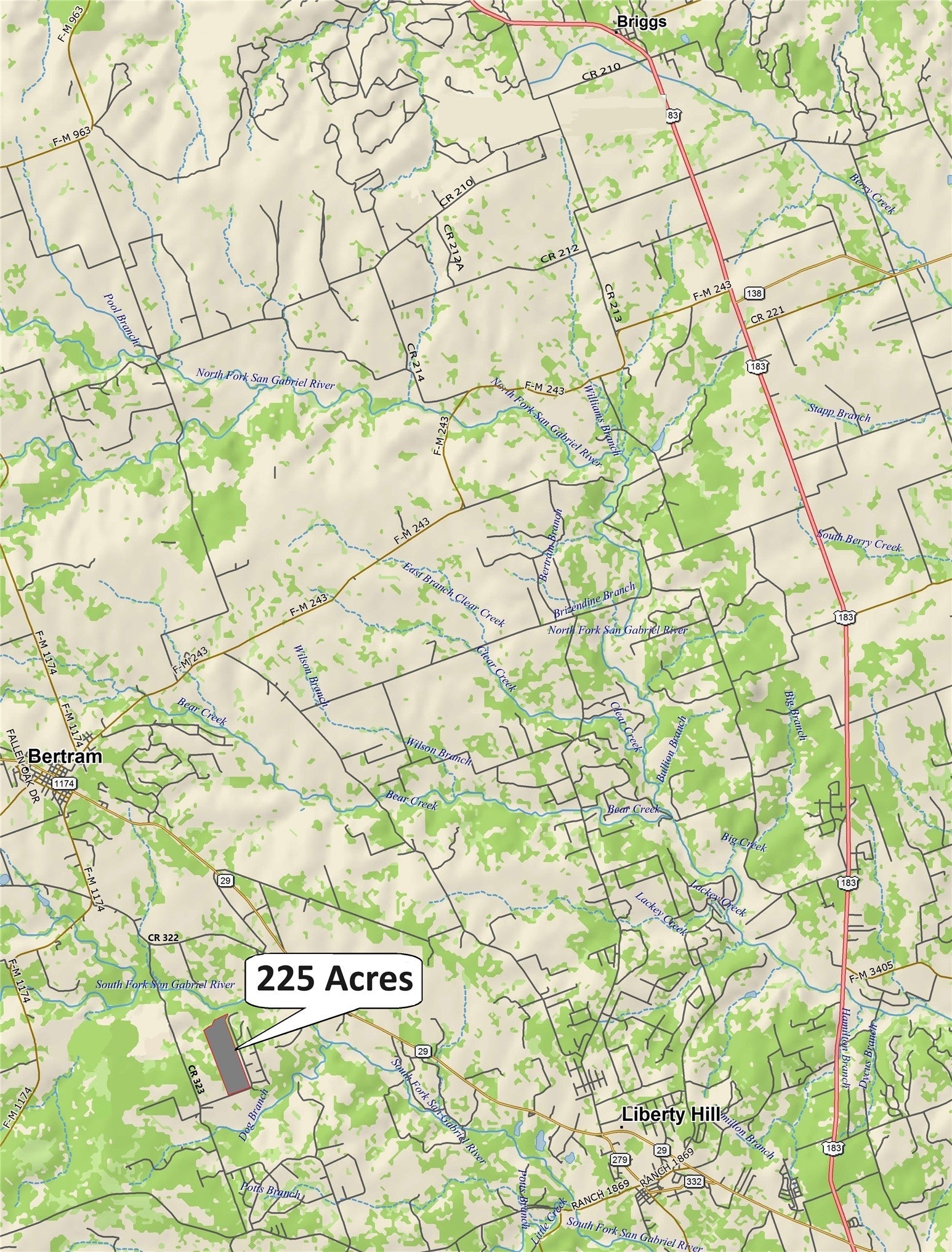 225 acres near Liberty Hill. This ranch has excellent cover including a variety of oaks and other hardwoods. Additionally, several grazing fields provide just the right mixture of cover and open land for an ideal wildlife habitat. Four ponds provide ample water. The property has been under wildlife management for many years producing an excellent stock of whitetail deer, axis deer and turkey. The terrain is mostly flat before dropping off into a valley towards the back. This transition in terrain provides nice views of the distant hills. Located in a high growth area, the property is only 5 miles from Hwy. 29 and 43 miles to downtown Austin. *NOTE: This property is partially in the Liberty Hill School District & Burnet School District*