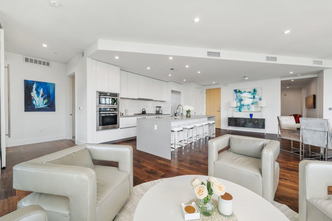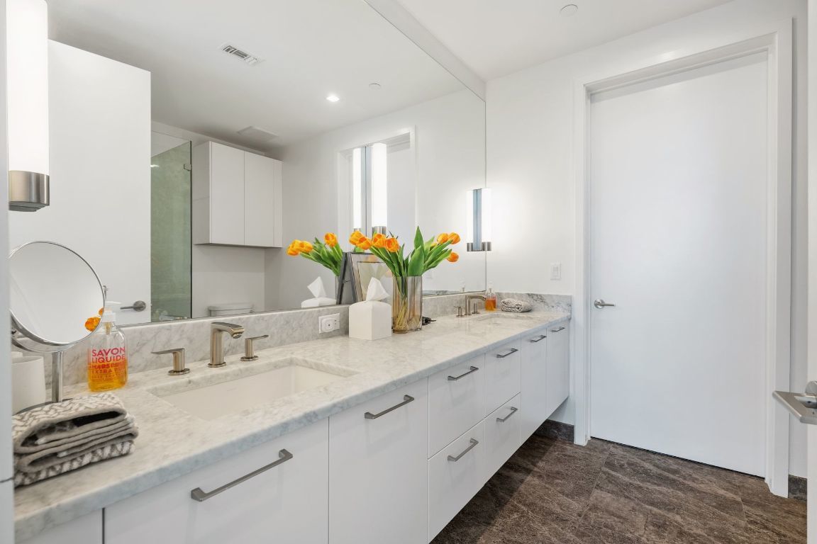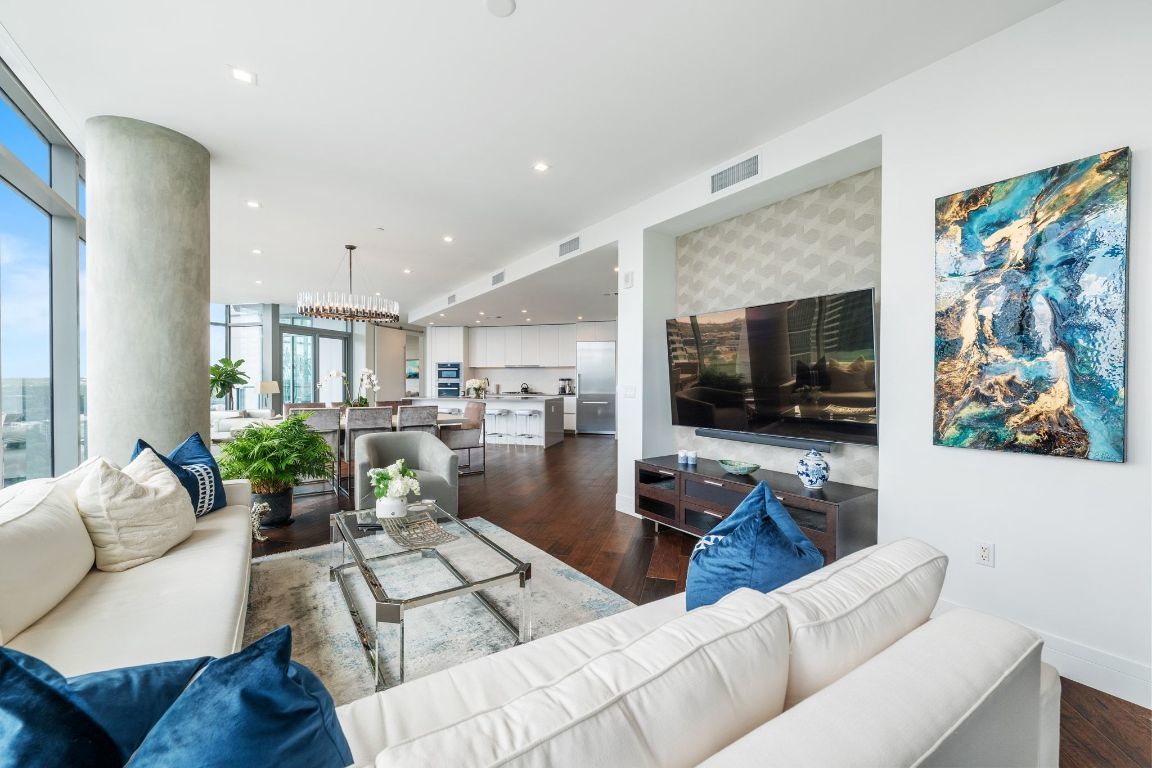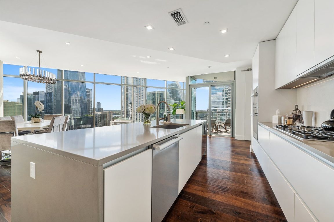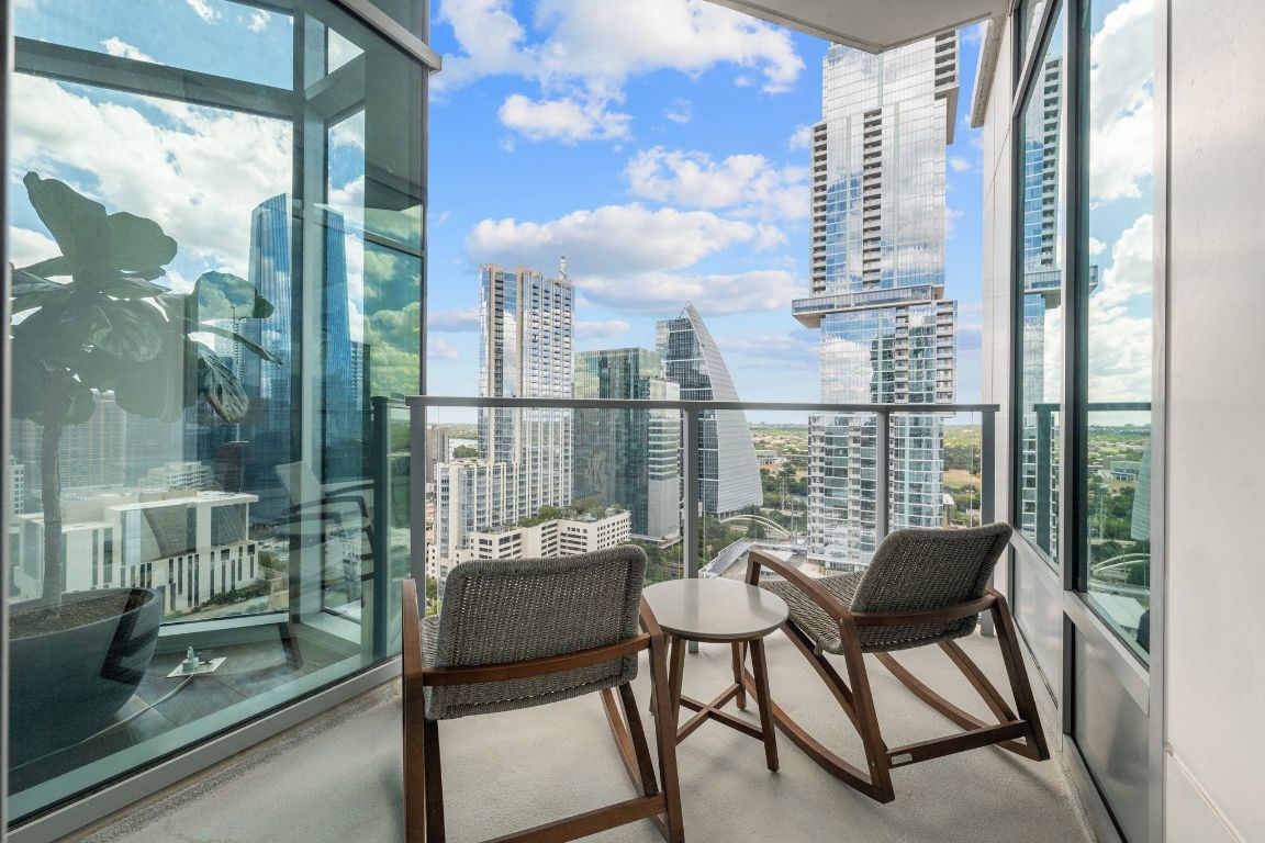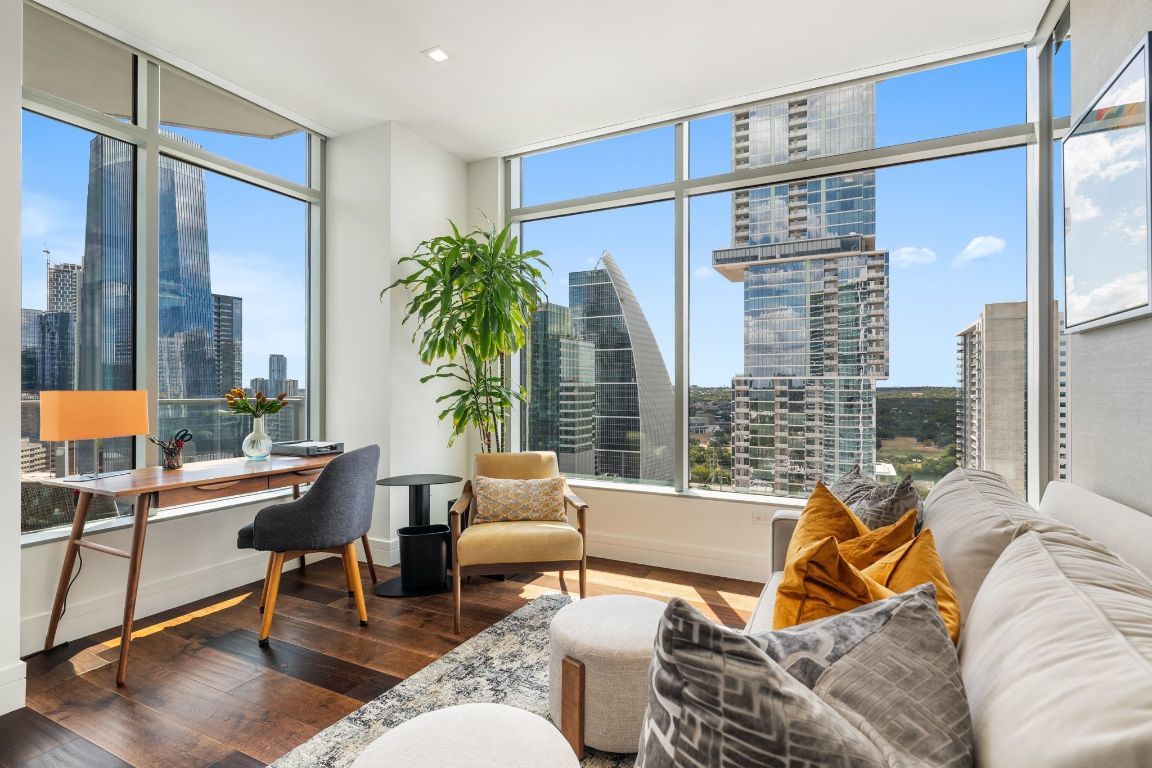 Experience premier downtown living in this expansive 3-bedroom, 3-bathroom residence at Fifth & West. Floor-to-ceiling windows frame sweeping city views, while an open-concept layout creates a seamless flow for both everyday living and entertaining. Hardwood floors, recessed lighting, and refined modern finishes are complemented by clean architectural lines and thoughtful design in every room. The pristine kitchen features high-end stainless-steel appliances, a wine cooler, a breakfast bar, and stunning skyline vistas that transform cooking into a memorable experience. The primary suite is a private retreat, complete with a sitting room that could serve as an office with dramatic downtown views. The spa-inspired en-suite bath offers dual vanities, stone countertops, a soaking tub, and a glass-enclosed shower. A junior primary suite includes its own private terrace and a luxurious en-suite bath. All three bedrooms conveniently offer walk-in closets and en-suite bathrooms. There is also a well-appointed laundry room in the unit. At Fifth & West, residents enjoy fantastic amenities, including concierge service, a pool, elegant community lounges, and pet-friendly features. The unit features two premium reserved parking spots on the first level of the garage. Perfectly positioned between the acclaimed dining of West 6th and the Seaholm District, as well as shopping on North Lamar, this residence offers the best of Austin’s urban lifestyle, wrapped in sophistication and style. Tax and assessed values are estimates for illustration purposes only. All figures should be independently verified.