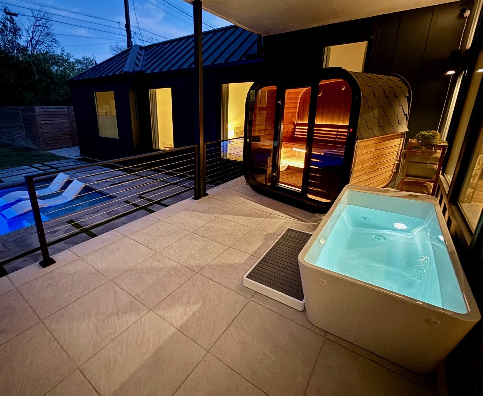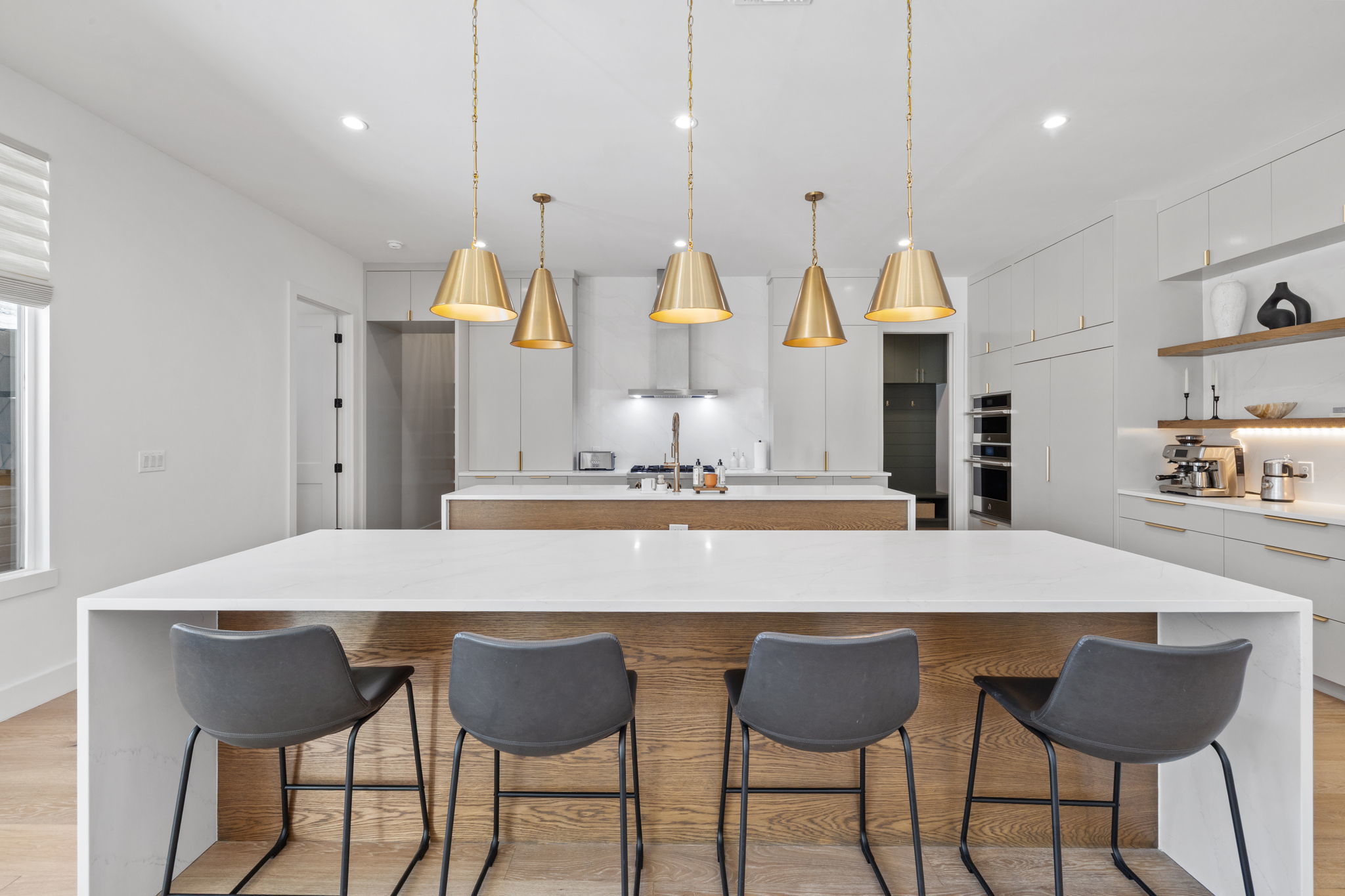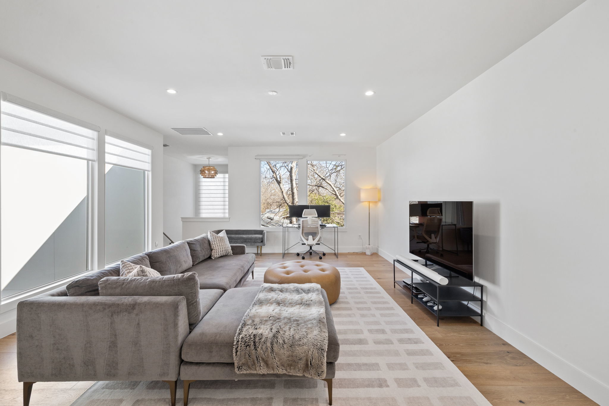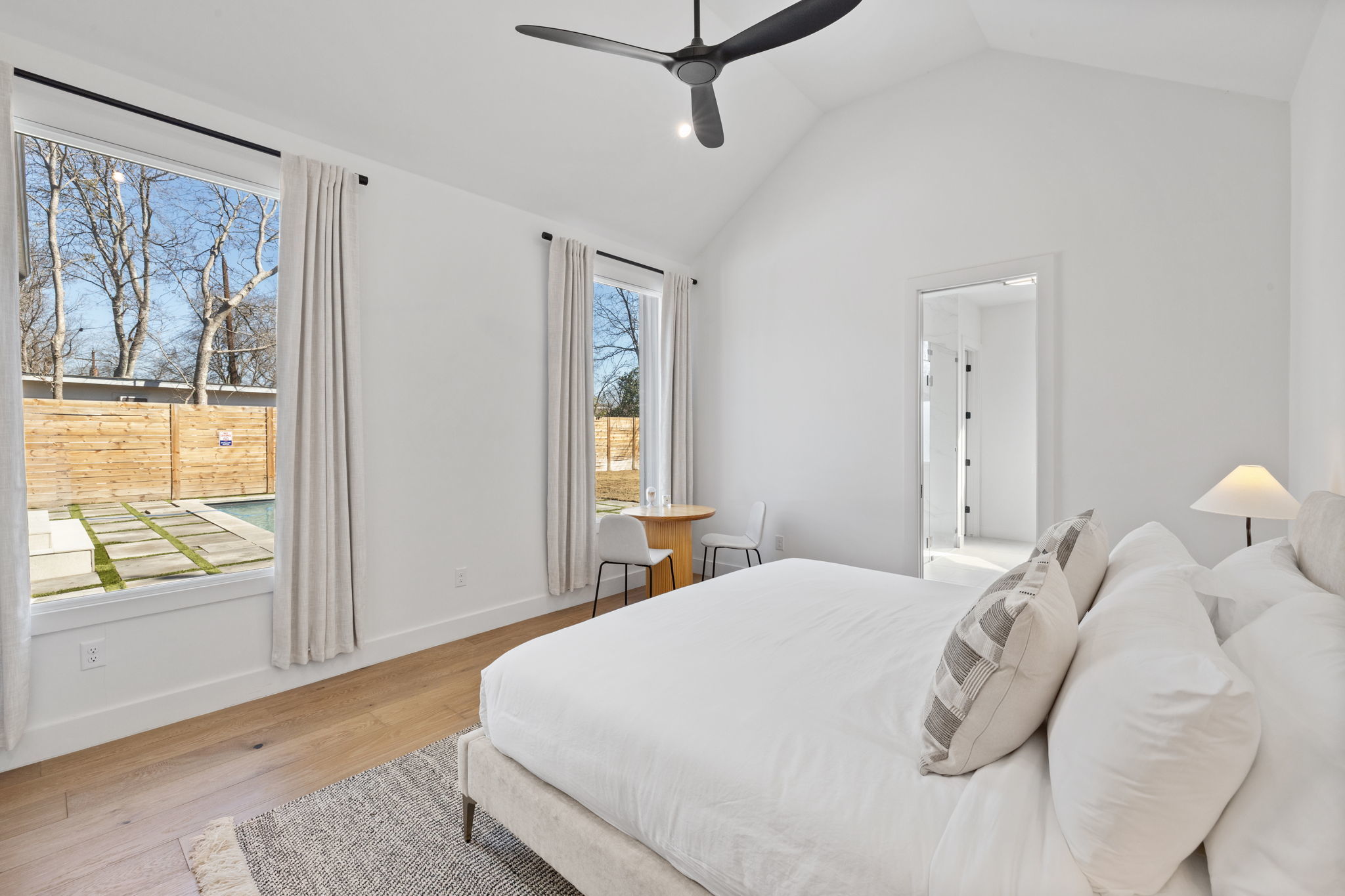 Gorgeous new construction designed by Etch Design Group, completed in 2024, blending elevated design with everyday livability in one of South Austin’s most desirable pockets. This thoughtfully designed five-bedroom home features two primary suites—one on the main level and one upstairs—offering exceptional flexibility for guests or multi-generational living. Step inside to soaring 20-foot ceilings and an open-concept living space filled with natural light from expansive windows overlooking the pool and oversized backyard. The chef’s kitchen is a true centerpiece, showcasing dual islands, designer finishes, and seamless flow into the main living and dining areas—ideal for both entertaining and daily living. The main-level primary suite is privately situated and features vaulted ceilings, a spa-inspired bath with a digitally programmable double shower, freestanding soaking tub, dual vanities, and an oversized walk-in closet. A secondary bedroom on the main floor doubles perfectly as a dedicated home office. Upstairs, you’ll find a spacious second living area along with an additional primary suite, creating a versatile retreat for family or guests. Designed for a true at-home wellness experience, the backyard is a standout with a large pool, covered patio, custom sauna by SaunaLife, and a fully equipped outdoor kitchen featuring a premium DCS built-in grill. The quarter-acre lot offers ample space to unwind, complete with modern landscaping and elevated steel garden beds. Motorized Hunter Douglas shades throughout the main living areas and select bedrooms provide effortless light control, privacy, and smart home integration. Located just a short walk to Del Curto Park and minutes from South Congress and downtown, this home offers the perfect balance of tranquility and urban convenience.