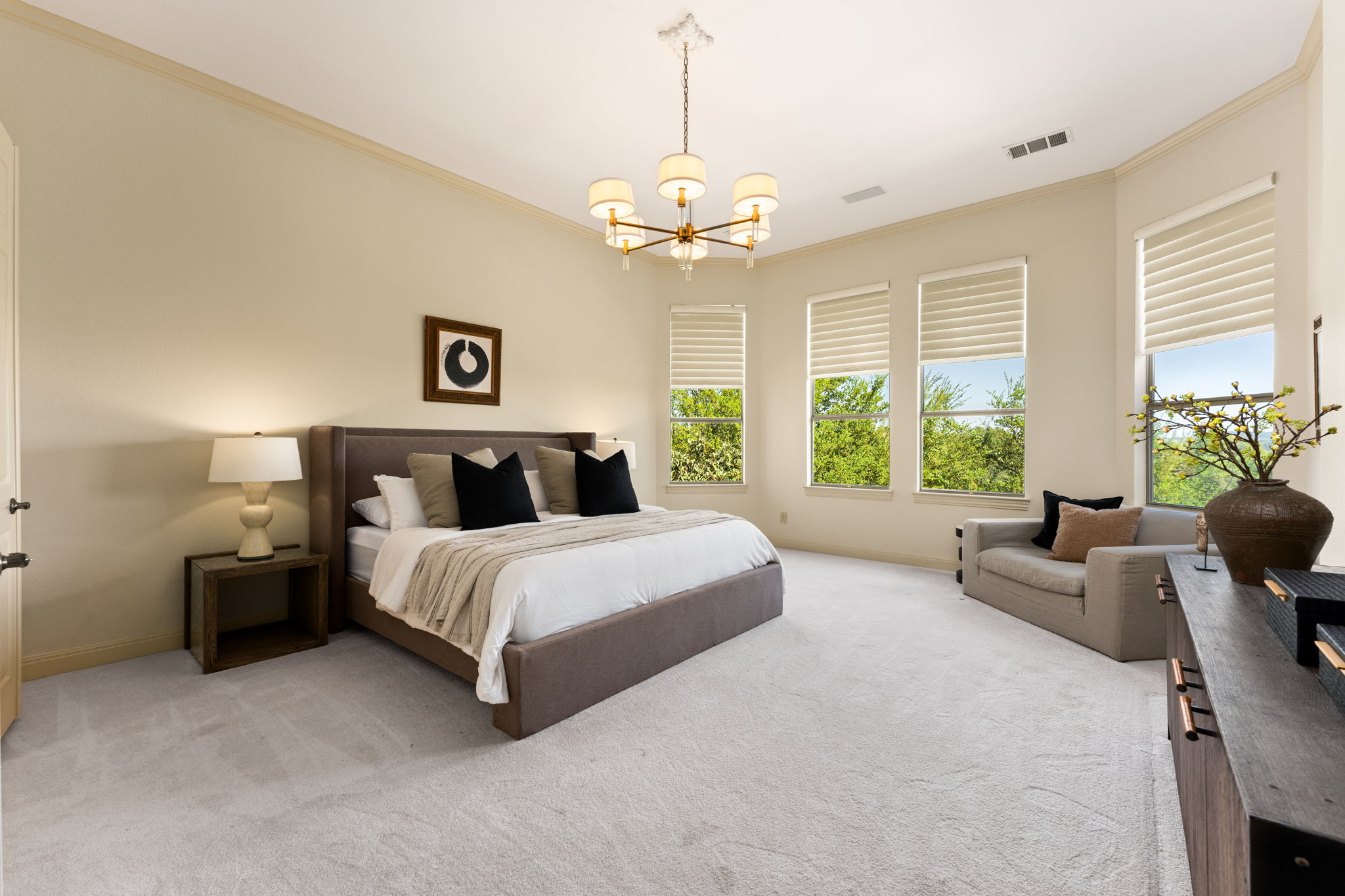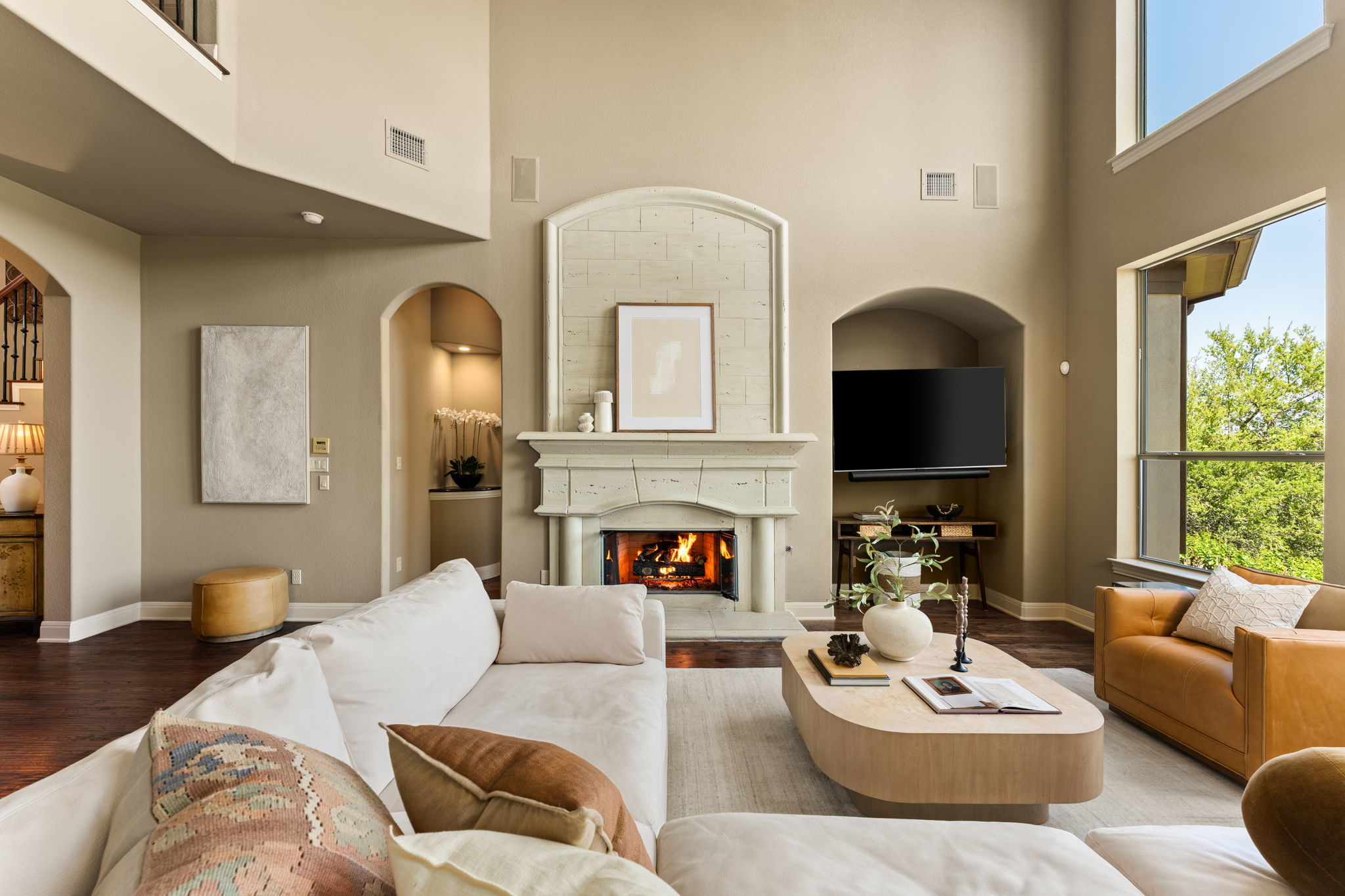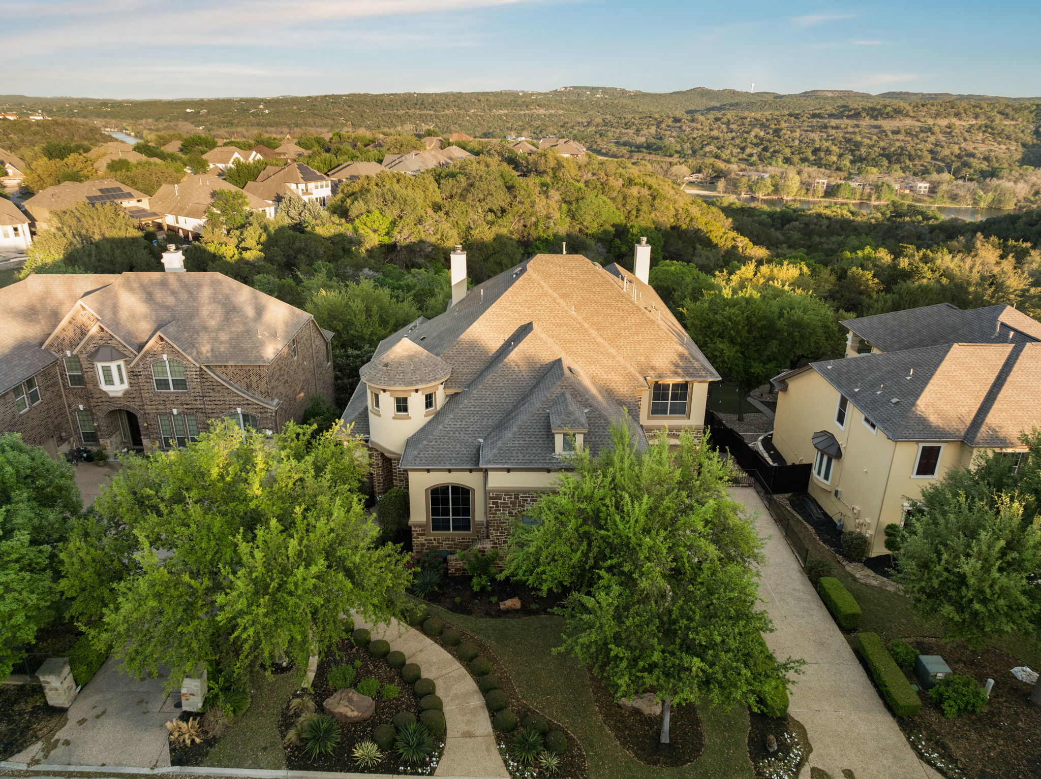 Sweeping Hill Country views set the tone for this stunning 4,555-square-foot home in the highly sought-after Bella Mar enclave of Steiner Ranch. Thoughtfully designed to balance timeless elegance with everyday comfort, the home offers a refined yet inviting atmosphere highlighted by expansive picture windows, wood flooring, custom millwork, crown molding & multiple generously sized living spaces. The main level boasts a beautiful entry featuring soaring ceilings, a curved staircase, a formal dining room, private office, 2 spacious living areas, a well-appointed kitchen with an adjoining breakfast area & a serene primary suite. Upstairs, you’ll find 3 generously sized bedrooms, 3 full bathrooms, game room, a dedicated theater room designed for ultimate entertainment & a covered balcony with breathtaking distant views. At the heart of the home is the gourmet kitchen with granite countertops, butcher block center island, ss built-in appliances, gas range & a breakfast area overlooking the backyard/pool. The primary suite also captures the stunning views, offering a peaceful retreat with a light-filled spa-like bathroom with dual vanities, a walk-in shower, soaking tub & walk-in closet. Step outside to the covered outdoor living area, where breathtaking panoramic views set the backdrop for year-round enjoyment. This inviting space is equipped with a gas fireplace, built-in grill & dining area ideal for entertaining or simply relaxing. Step down to your resort-style pool & spa, perfectly complemented by a pergola & multiple lounge areas all set against the privacy & natural beauty of the greenbelt. Experience the ultimate outdoor lifestyle in this remarkable property & community. Enjoy resort-style amenities, including pools, parks & tennis courts. Just minutes away, you’ll find the UT Golf Club, along with dining & shopping. You are moments away from Lake Austin & the public boat ramp & there are more than 20 miles of scenic trails to explore throughout the community.