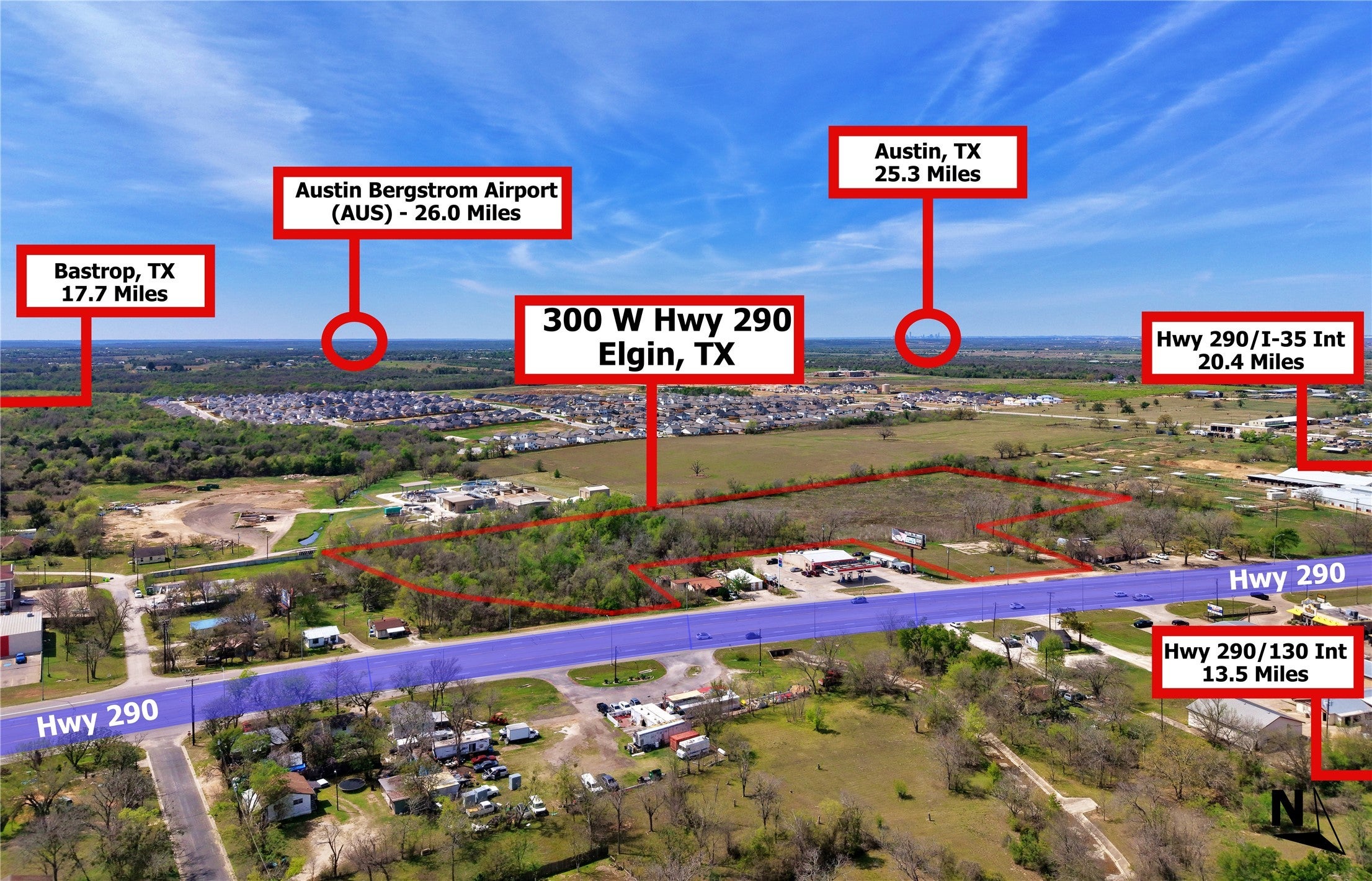 300 W US 290 A, Elgin, TX offers excellent frontage, strong visibility, and prime positioning along one of the area’s fastest-growing corridors. According to TxDOT, this stretch of US 290 carried approximately 41,695 vehicles per day in 2023, providing substantial daily exposure for retail, restaurant, service, or other commercial uses. Based on the steady upward traffic trend in recent years, current traffic is reasonably projected to be above 50,000 vehicles per day in 2026, further highlighting the strength of the location and the continued growth of the corridor. With additional residential development taking shape in the surrounding area, the property may also be well suited for future home development, while its frontage, access, and location could make it an excellent fit for storage units, RV parking, or other flexible development uses. The sellers are also willing to subdivide the front commercial pad, which offers approximately 212 feet of road frontage, creating an excellent standalone opportunity for a retail, restaurant, or service user.