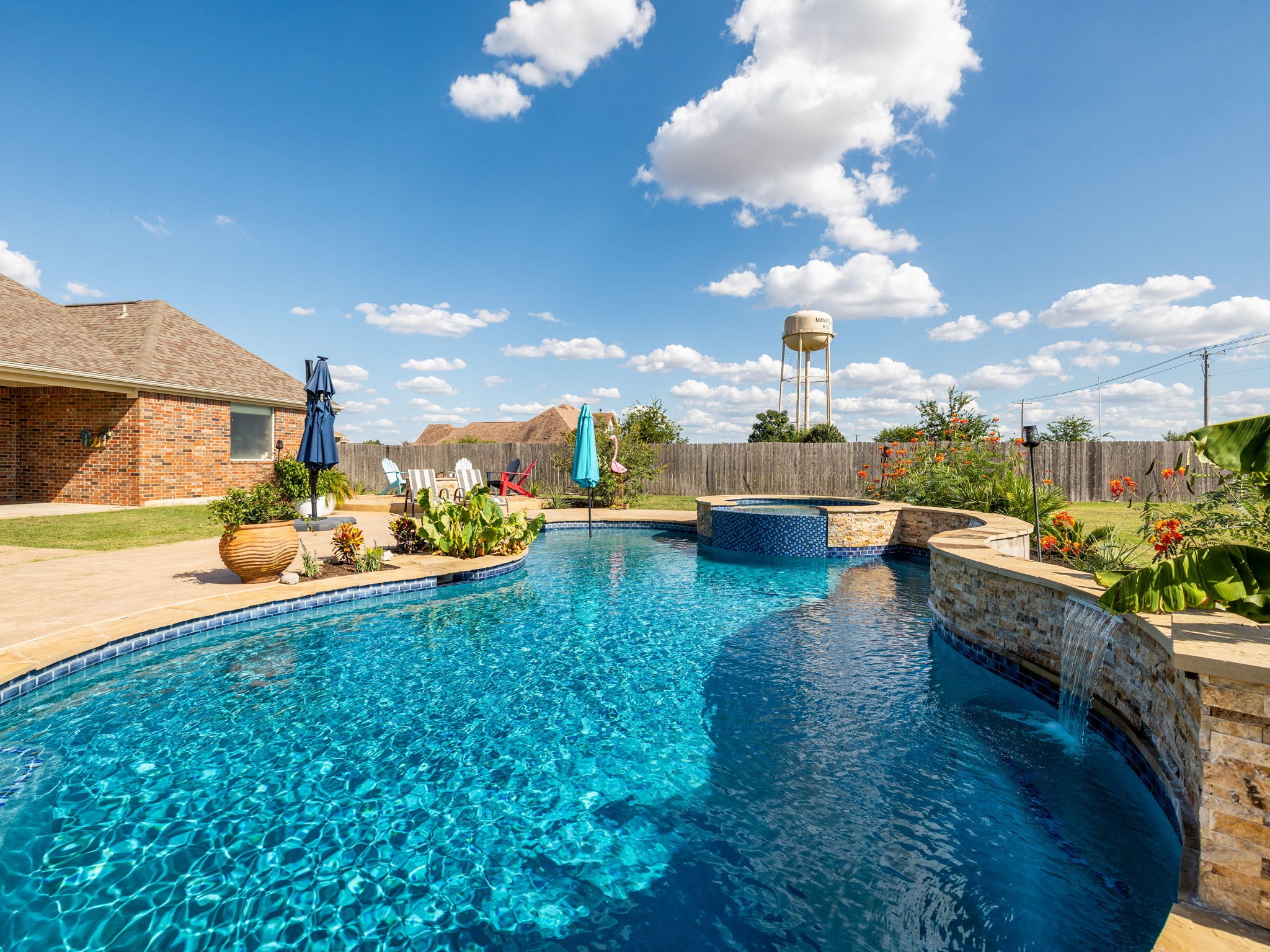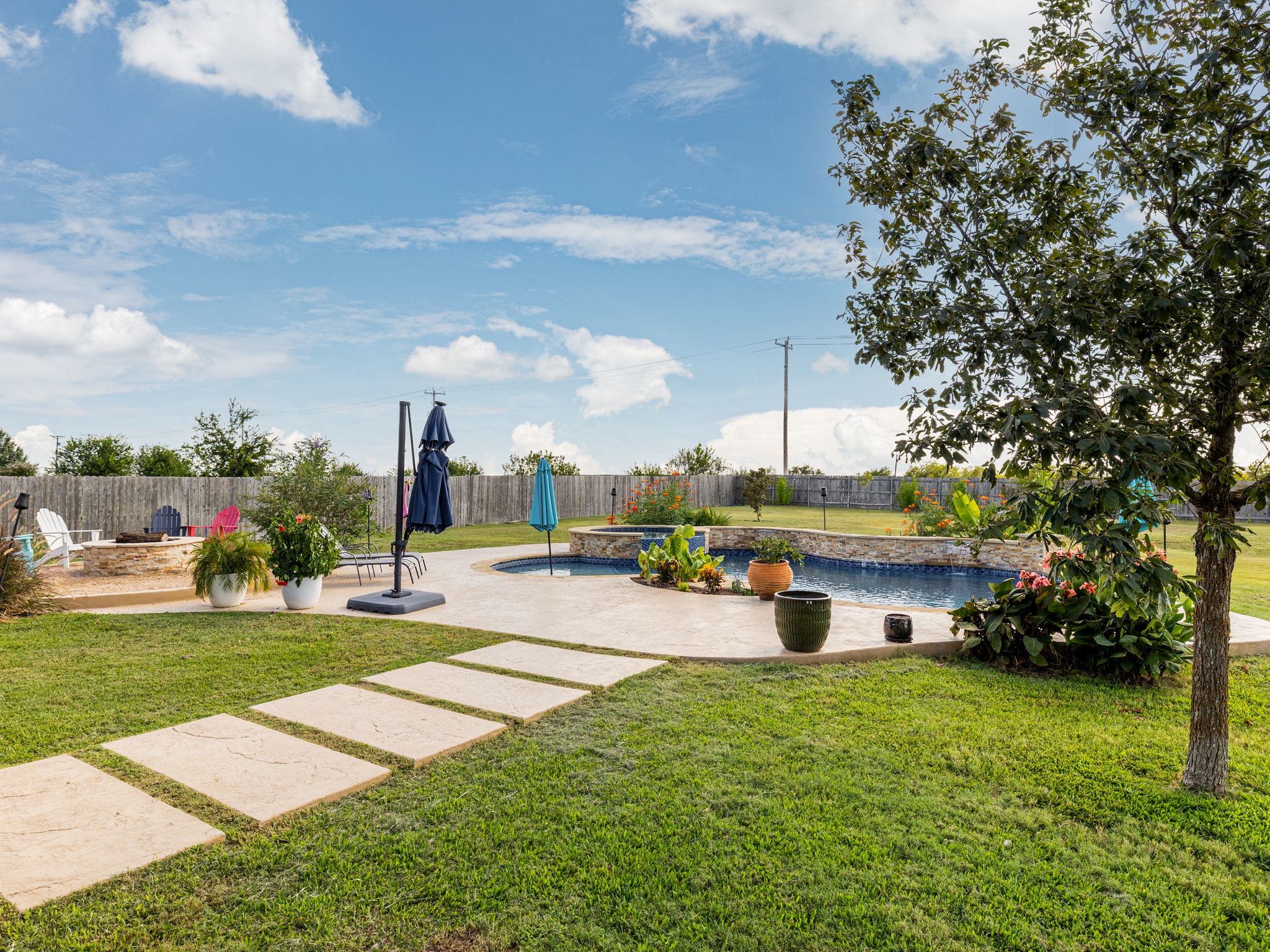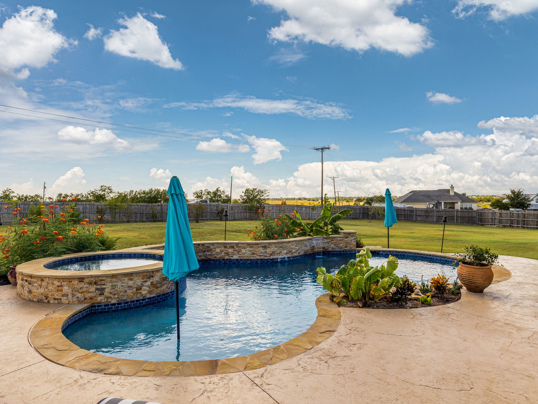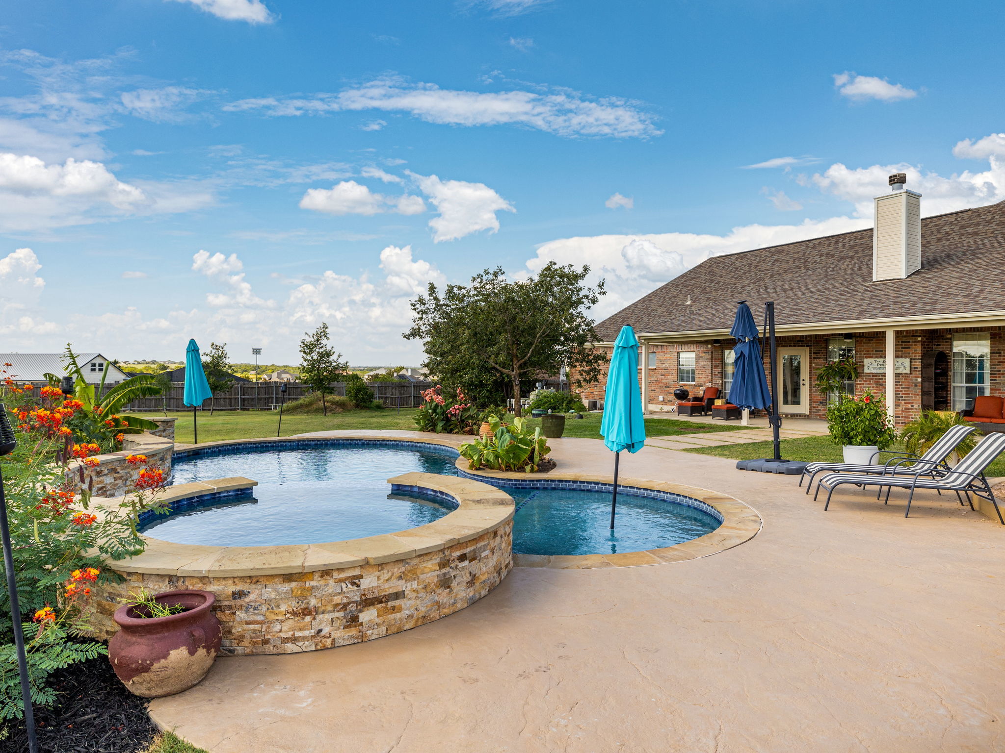 This is your Texas resort-style paradise on 1-acre! PRICE REDUCED & features a 2023-built custom heated pool/spa in the prestigious Lookout at Brushy Creek community and close to Samsung*A spacious 3,255 sq. ft. custom 5/3.5/2/2 home and private retreat sits at the end of a stunning curb appeal a peaceful cul-de-sac*The entry features beautiful wood columns lg wood fireplace* Living, kitchen and breakfast area overlook the gorgeous pool and large backyard* This home is open w/tall ceilings, 5 spacious bedrooms, 3.5 baths, 2 Owner’s suites-strategically placed on opposite ends of the home for privacy* The oversized laundry room is plumbed for a sink and wired for a full-size refrigerator or freezer that adds ease to daily living*Upstairs is a private, spacious game-room/office and features a huge “walk-in” storage area that creates endless possibilities for hobbies, storage or Christmas closet *Easy to maintain floors are stained concrete, tile and wood laminate (no carpet) * The heart of this home is the outdoors for entertaining your friends and family in your expansive backyard oasis, complete with a 2023 heated pool, spa, cascading waterfalls, an expansive covered patio that is cooled by three ceiling fans and is fully fenced yard *The entire 1-acre has an automatic sprinkler system to keep your oasis pristine year-round with ease * As the sun begins to set, gather around the large custom stone firepit with family and friends to take in breathtaking Texas sunsets against a backdrop of wide-open spaces, lush landscaping and star gaze * Close to the community pond for neighborhood fishing or BBQ cookouts. With its timeless 4-sides brick exterior, fresh paint, and curb appeal that shines, this property is more than a home—it’s a lifestyle *Enjoy quiet evenings by the fire, weekends entertaining poolside, or mornings sipping coffee on your private patio, this home is where everyday feels like a get-a-way! 2018 roof provides peace of mind*Low taxes/No city taxes
