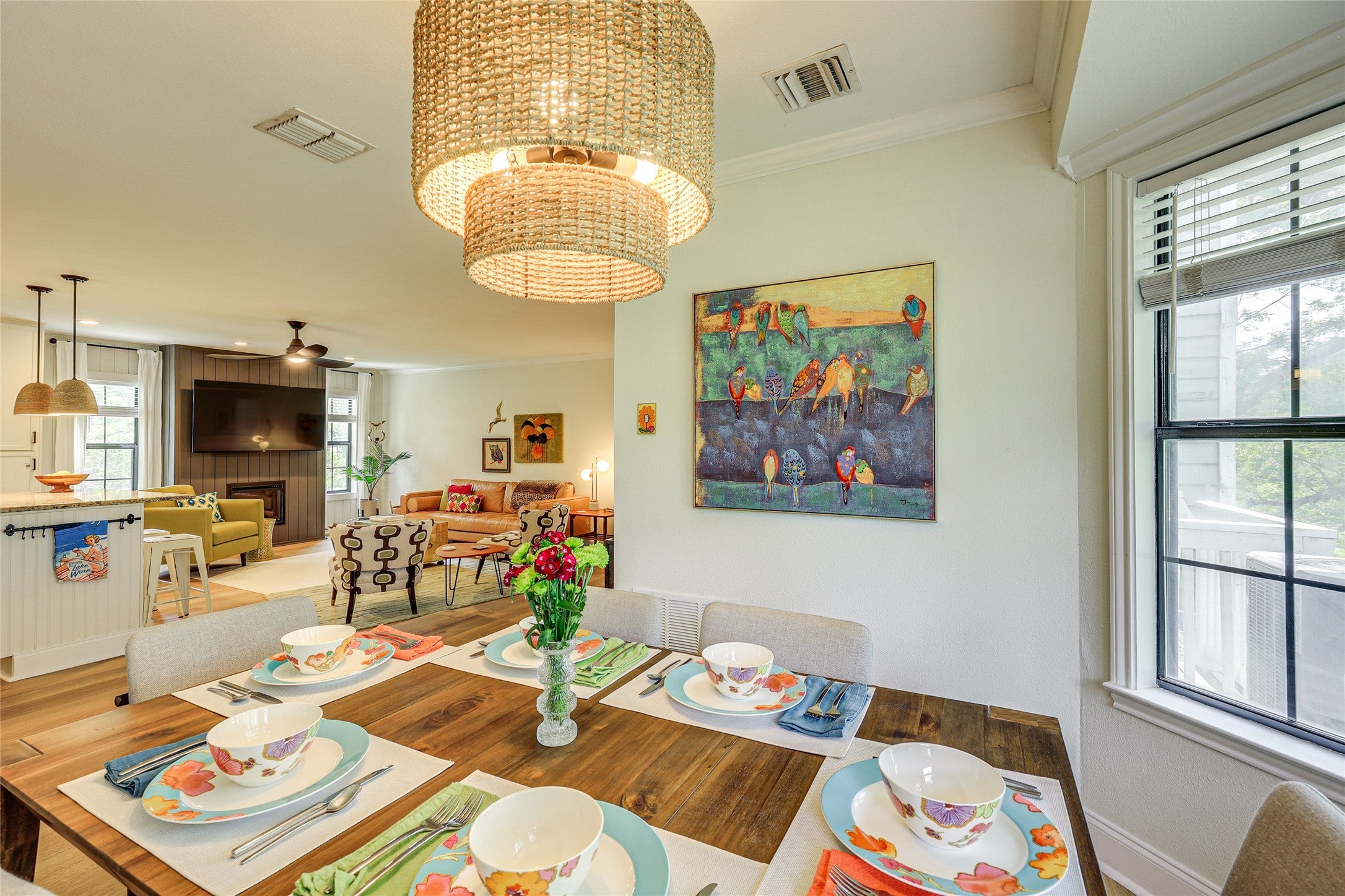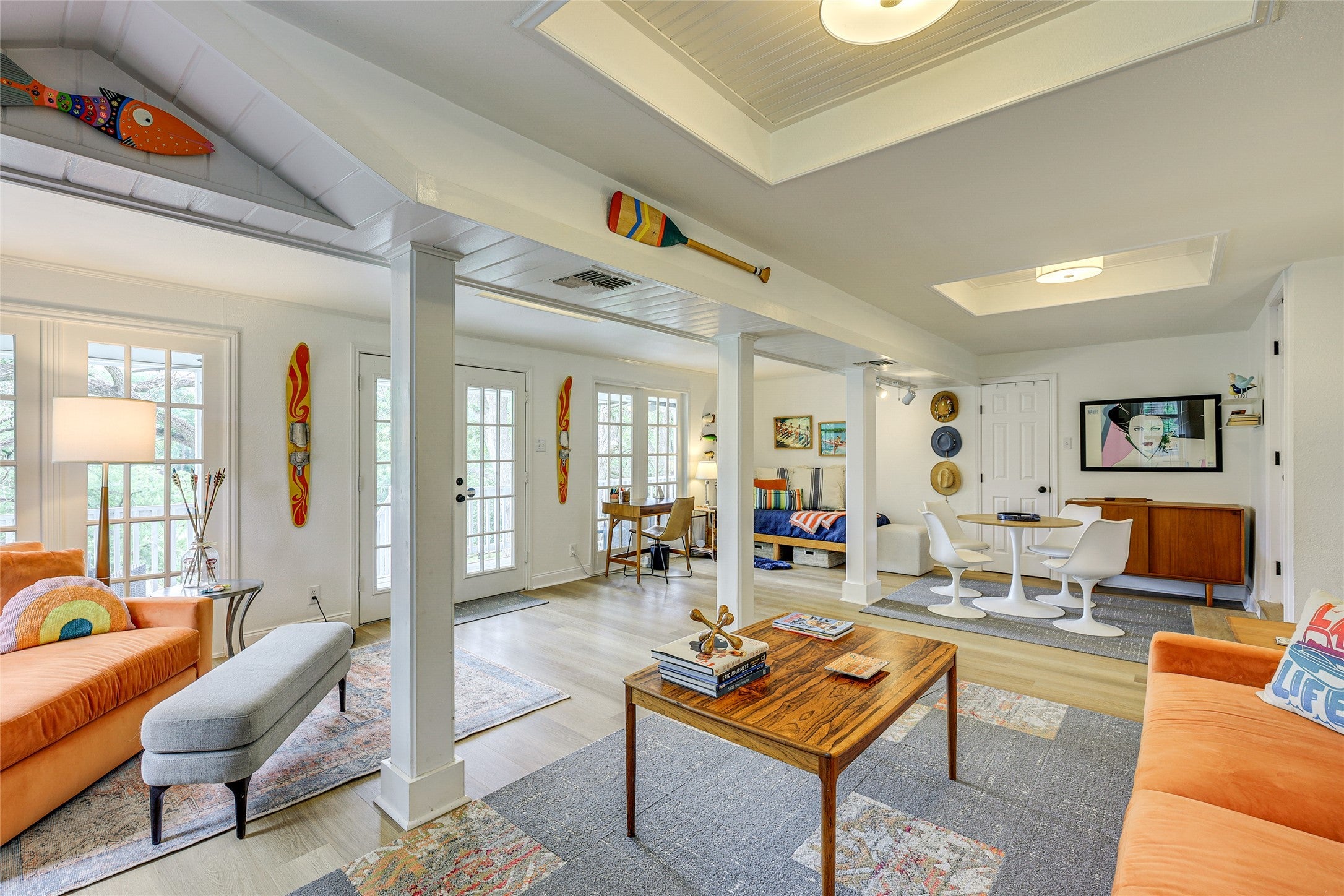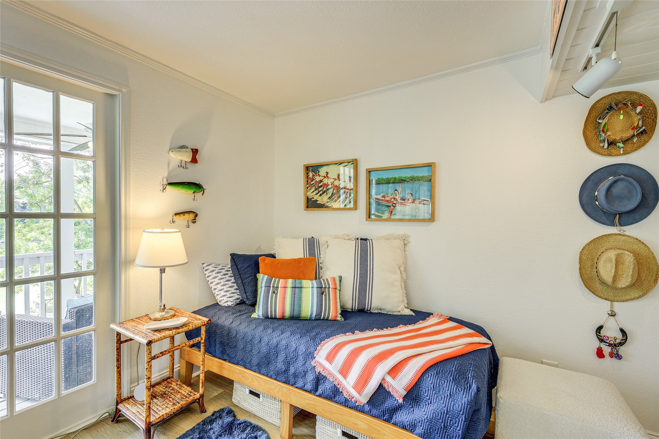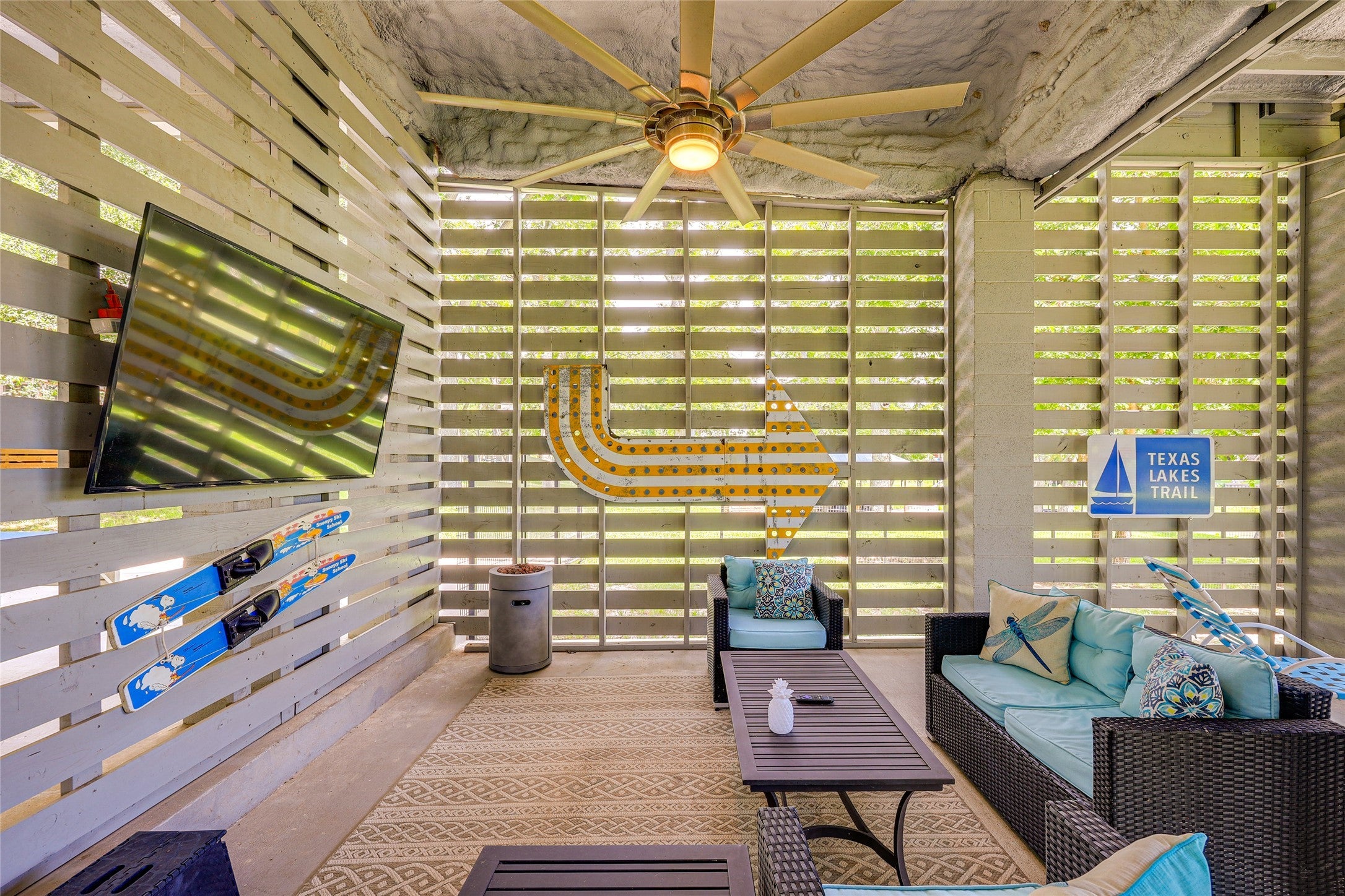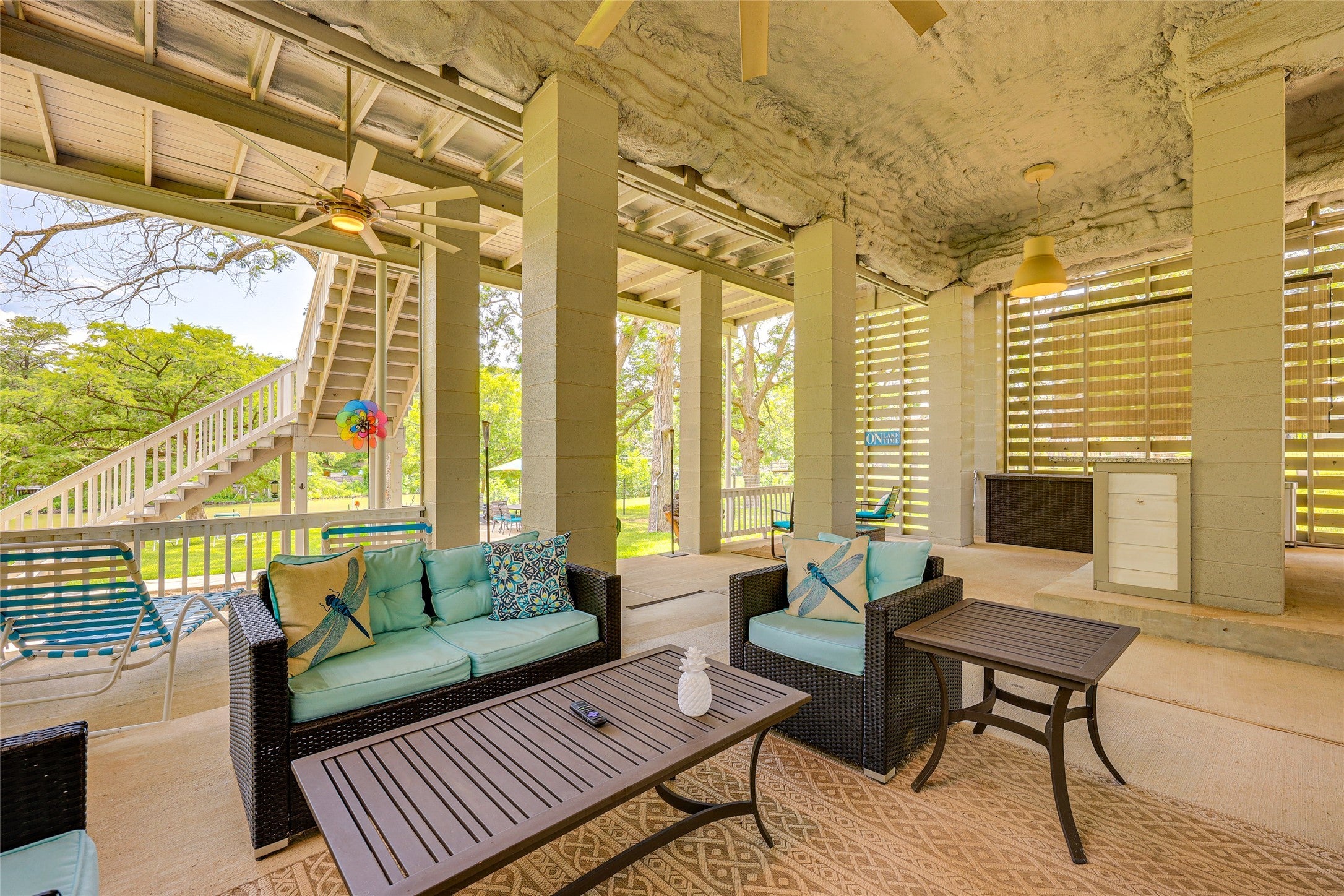 Waterfront living on Lake McQueeney for under $1M! Beat the rush—the lake is scheduled to return to full boating, fishing, and fun this March with completion of the new dam. Whether you’re looking for a weekend escape, full-time lake living, or a short-term rental, most of the furnishings are negotiable—you can start enjoying lake life (or hosting guests) right away! This updated 2,079 SF lakehouse, “Mod on the Guad,” sits on a usable lot with a flat backyard, tucked along a private road of waterfront homes. The home has been extensively updated and well maintained, with major improvements already completed: new $40K seawall and boat slip, aerobic septic system, AC, fence, flooring, remodeled downstairs bath, stainless fridge and range, modern lighting, and more. Outdoor living is what this place does best! Enjoy coffee on the covered balconies; deer and bird watching beneath pecan and bald cypress trees, hanging out under the elevated home with ping-pong, game-day TV, and grilling; or s’mores and stargazing around the fire pit. And whether you travel by ski boat, pontoon boat or jet ski, it's a short ride to the famed Lake Breeze Ski Lodge. And yes—the inside is just as inviting, with a cool midcentury modern vibe. The main level was designed for entertaining, with a modern kitchen and two living areas: a cozy space with a fireplace and 65" TV, plus a light-filled great room with panoramic lake views and dedicated spaces for relaxing, card games, catching up on email, curling up with a book or sneaking in a nap. Upstairs is the quiet zone with two bedrooms (one with bunk beds), each with three spacious closets. Add three covered parking spaces, a storage shed, and a well for yard watering. No HOA, and just 10 miles to Gruene, New Braunfels and Seguin.