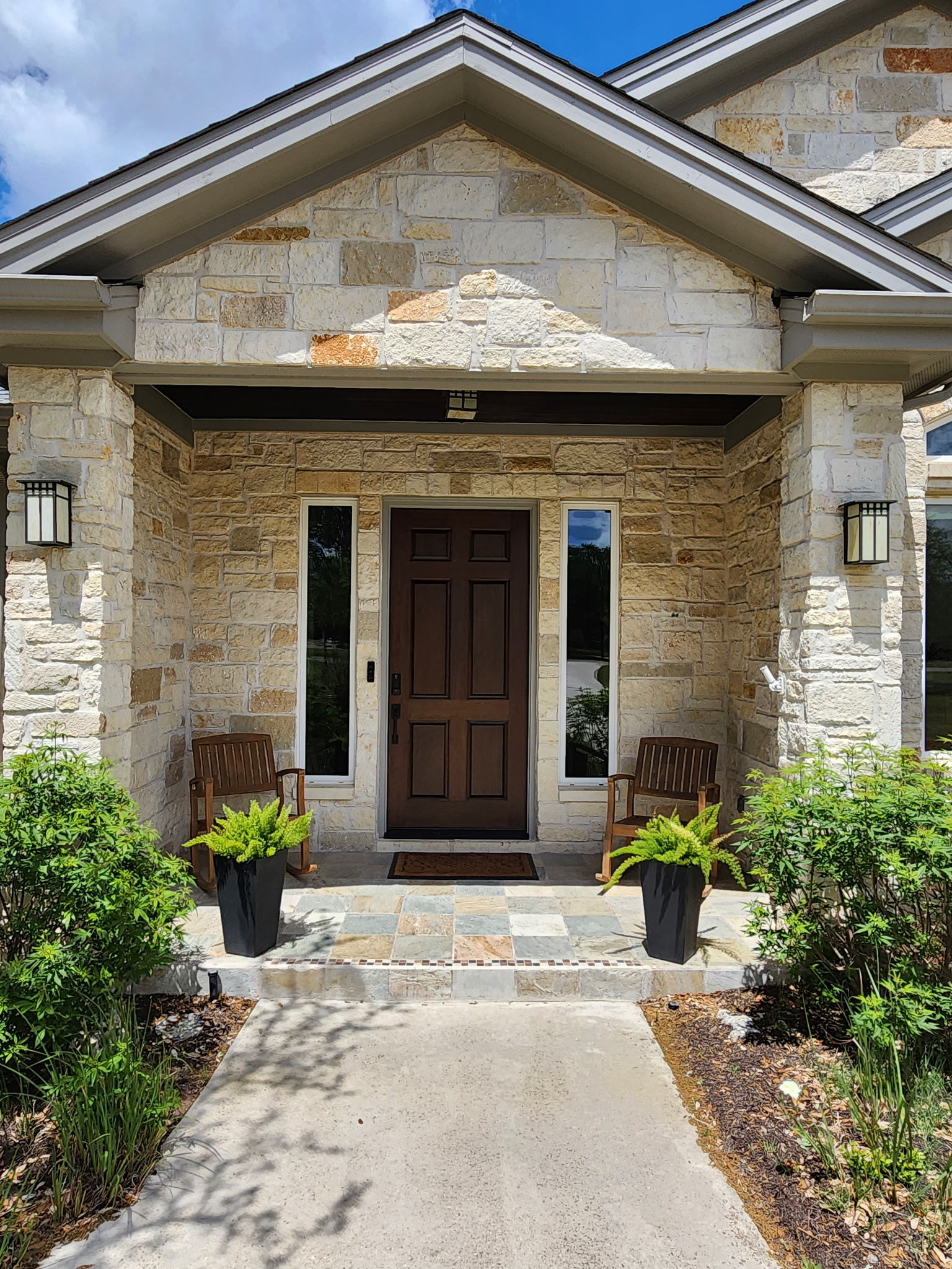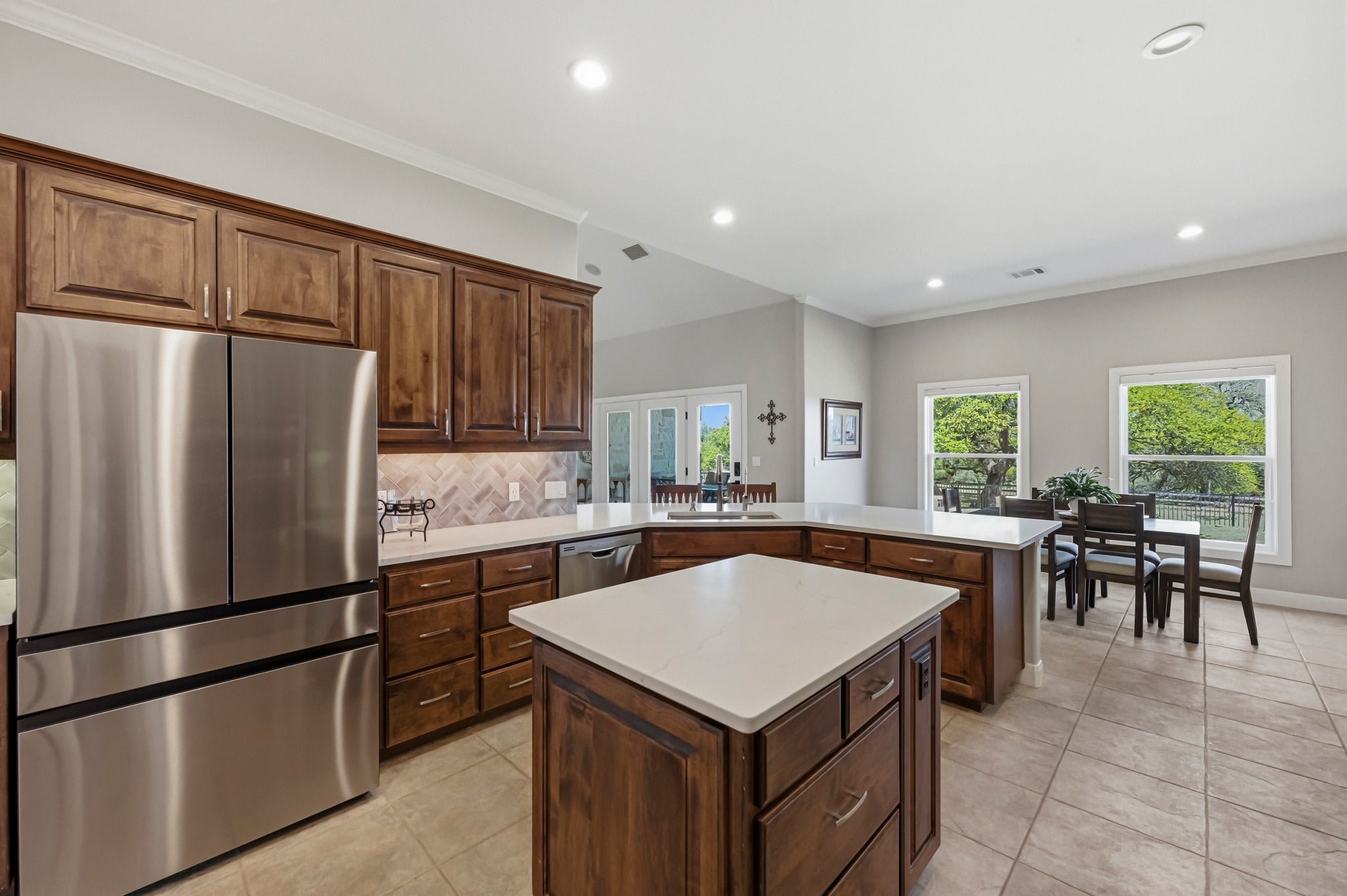 Welcome to your serene retreat in the highly coveted La Ventana gated community. Set on a peaceful 1-ac lot, this charming single-story stone home perfectly blends authentic Hill Country tranquility with modern comfort. Mature Live Oaks provide graceful shade, established landscaping adds timeless beauty and abundant wildlife enhances the serene surroundings. Wide, tree-lined strolling streets and the soft sounds of nature create an idyllic escape. Step inside to an inviting open-concept floor plan flooded with natural light. Vaulted high ceilings in the great room create an airy, spacious feel. A separate formal dining room offers elegant space for family meals. The recently remodeled kitchen is a chef's dream, featuring quartz countertops, premium stainless-steel appliances, abundant cabinetry and seamless flow into the living areas. Rustic tile and warm wood floors add character and warmth throughout the home. The spacious primary suite on the main level includes a luxurious spa-inspired bath with a deep soaking tub, frameless walk-in shower, dual vanities and generous storage. Three additional bedrooms and 2.5 baths provide ample room for family, guests, or a dedicated home office. Entertainment flows effortlessly with a built-in surround sound system in the great room and extending to the outdoor patio—perfect for relaxing or gatherings amid the oaks. The garage setup features a large 2-car connected garage and a separate 1-car garage linked by a porta-cochere. La Ventana offers upscale rural living at its finest: tree-lined landscapes, longhorns grazing in front fields, and custom homes on acreage. Enjoy gated privacy, equestrian trails and corral, plus clubhouse with fitness center, event space and full kitchen; tennis/pickleball courts, basketball court, golf driving range, playscape, park with Flat Creek access, and hiking trails. The welcoming community fosters connection through a variety of social activities.