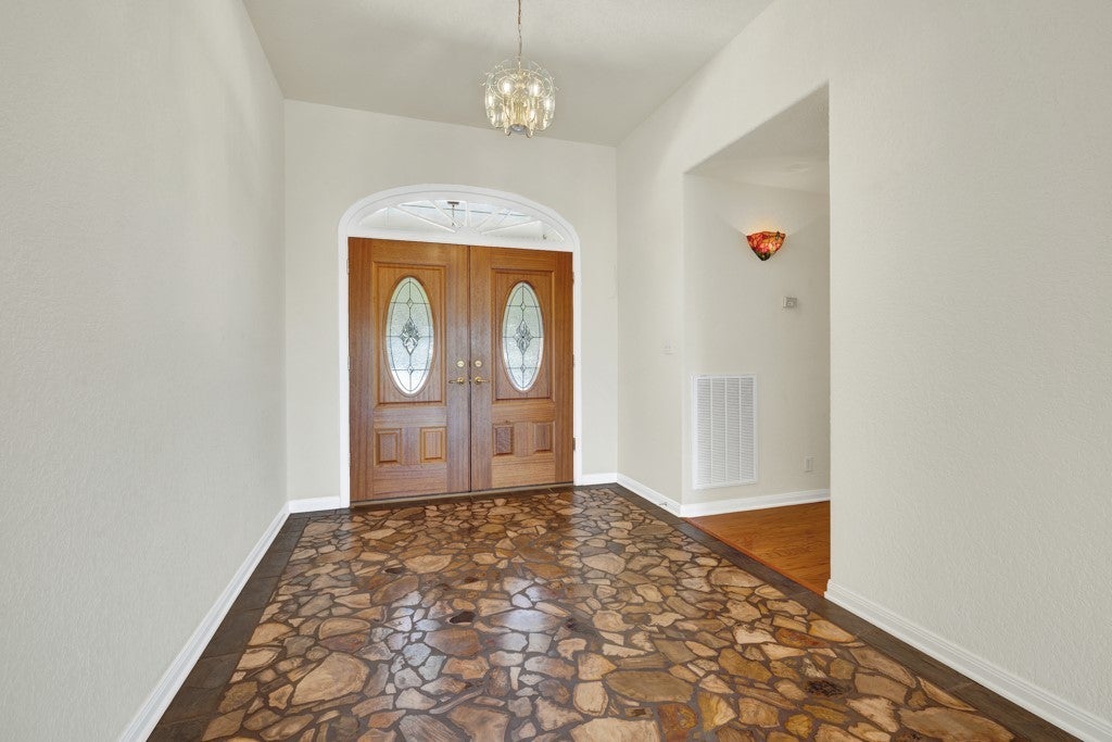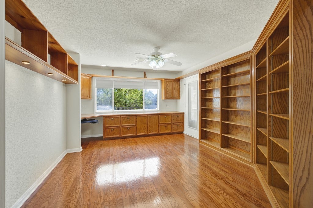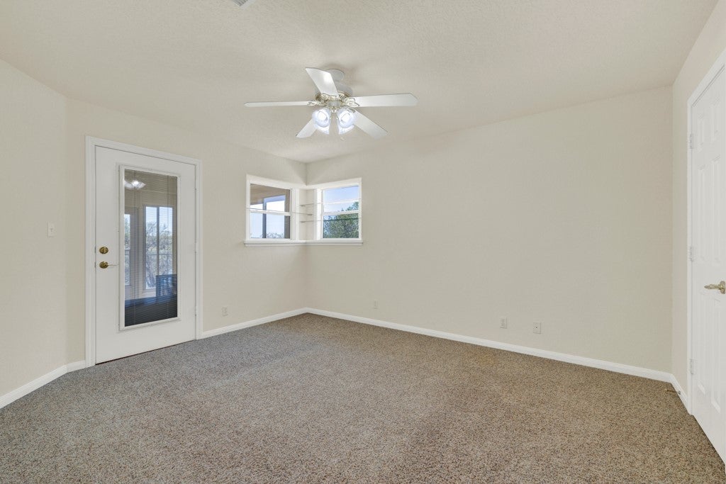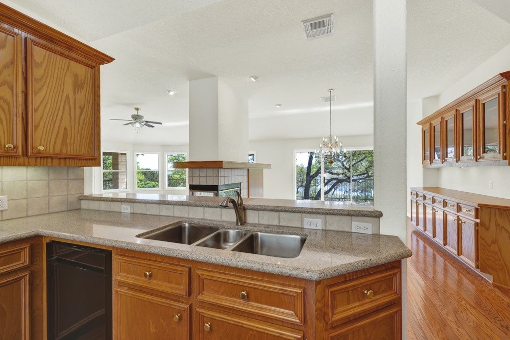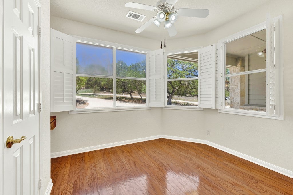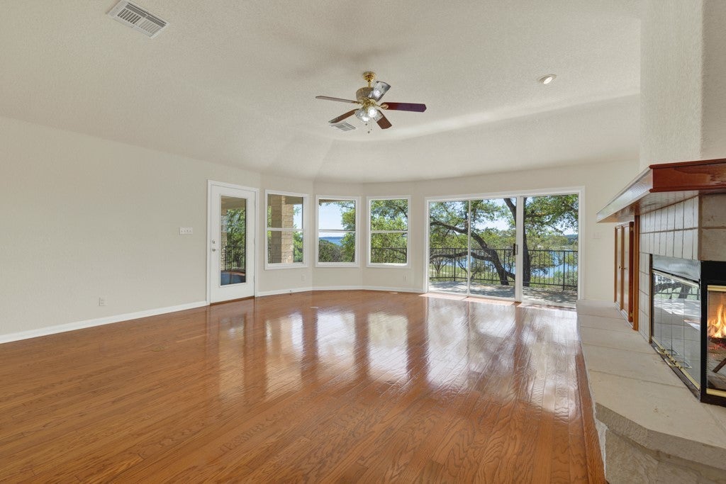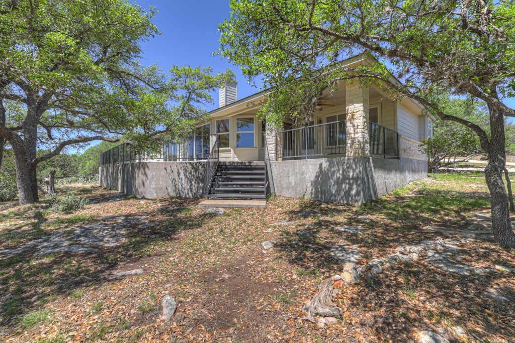 Tucked away on 4.16 acres with an impressive 335 feet of accessible waterfront, this exceptional Canyon Lake property is a rare and remarkable find. Surrounded by mature oak trees and natural landscaping, the setting offers unmatched privacy and tranquility, where wildlife such as deer, foxes, roadrunners, and native birds are part of your everyday view. From the back porch, take in breathtaking sunrises and sunsets over the water, an experience that never gets old. A circle driveway provides effortless access and ample parking, while the home itself has been meticulously maintained. Step inside to a one-of-a-kind foyer featuring painstakingly hand-cut petrified wood from the homeowners collection, setting the tone for the unique character found within. The main living areas showcase rich oak hardwood floors and a three-sided stone fireplace that anchors the space with warmth and charm. Expansive windows and glass doors flood the home with natural light and frame picturesque lake views. The open-concept kitchen flows seamlessly into the dining and living areas, making it perfect for both everyday living and entertaining. A dedicated office features built-in cabinetry and shelving, along with direct access to a sunroom, ideal for work or relaxation. The spacious primary suite offers new carpet, a walk-in closet, and a bathroom complete with a jetted tub and walk-in shower. Additional features include plantation shutters, a central vacuum system, an oversized mudroom with durable concrete flooring, a true "Butler's Pantry" and a three-car garage. This property is serviced by a private well and is plumbed for a water softener. Major updates include a new roof in 2022 and exterior paint completed just two years ago. Whether you're seeking a serene waterfront retreat or a one-of-a-kind primary residence, this Canyon Lake gem delivers space, beauty, and timeless appeal with room to add on.