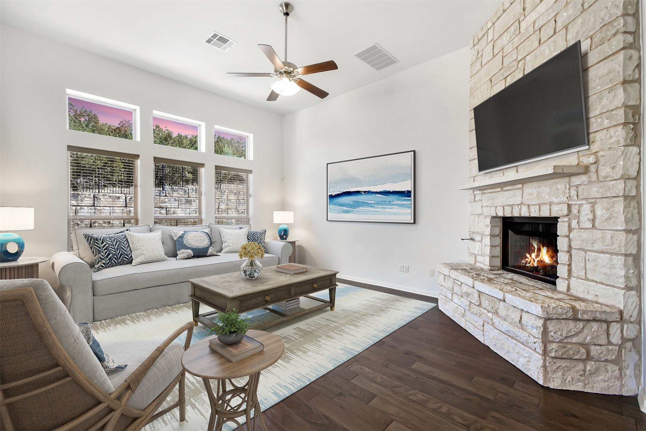 Discover this stunning new listing in the highly sought-after Rough Hollow community, where resort-style living meets everyday comfort. Residents enjoy access to multiple pools, a lazy river, on-site restaurant, fitness center, multiple sport courts, full service marina and more. This immaculate five-bedroom home offers 3,184 square feet of thoughtfully designed living space, featuring three full bathrooms and two spacious living areas plus a home office adorned by glass french doors. This open and bright plan offers 2 bedrooms, 2 baths, 1 powder room, family room and private study on the lower level. Situated on a premium lot backing to a serene greenbelt, the property provides exceptional privacy along with a beautiful pool and outdoor living space—perfect for relaxing or entertaining. Inside, wood flooring flows throughout the main level, complemented by freshly painted cabinetry and an open-concept design filled with natural light. A striking floor-to-ceiling white limestone fireplace serves as a centerpiece, while large windows frame picturesque views of the gardens and pool. Additional highlights include a three-car garage equipped with a Tesla charger and a generous upstairs layout featuring a fantastic game room and three uniquely styled guest bedrooms. With no homes behind, this property offers both tranquility and elegance in one of the area’s most desirable communities.