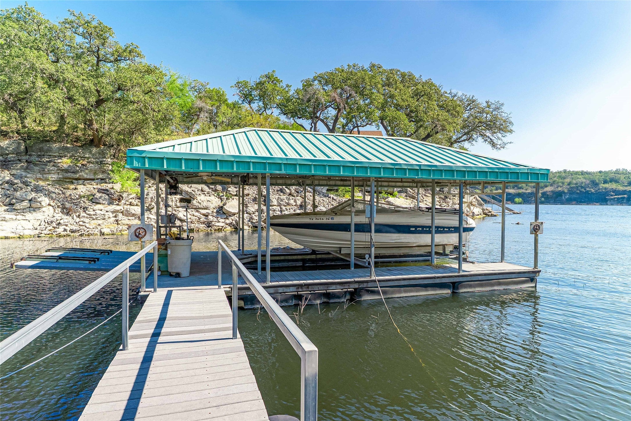 Beautiful Lake Travis waterfront retreat in the gated community of Chimney Oaks! This stunning home sits on 3.809 acres with a private boat dock, an attached 2-car garage, and a detached 4-car garage — perfect for lake toys, extra vehicles, or a workshop. Inside, you’ll love the open floor plan, tall ceilings, and no carpet throughout. The kitchen features a large island, granite countertops, tile backsplash, and stainless-steel appliances, opening to a warm living area with a cozy fireplace. The primary suite includes private patio access and a spa-like bath with double vanities, a large walk-in shower, and a soaking tub. The secondary bath also offers a spacious walk-in shower. Enjoy outdoor living year-round on the covered patio and extended deck, complete with a hot tub overlooking the lake. The southeast exposure provides refreshing breezes even on warm summer days. Just minutes away, Flat Creek Estate Winery offers the perfect Hill Country escape — featuring a bistro and tasting room, vineyard tours, outdoor pavilion dining, an 18- hole championship disc golf course, walking trails, and frequent live music and events. You’re also close to Gloster Bend State Park and the Lake Travis boat launch for more outdoor adventure. Only 25 minutes from Lago Vista, where you’ll find multiple grocery stores, local dining and shopping, a vibrant food truck park, coffee shops, and other Hill Country favorites. Experience the best of Lago Vista lakefront living in this rare, private, and beautifully maintained property in Chimney Oaks!