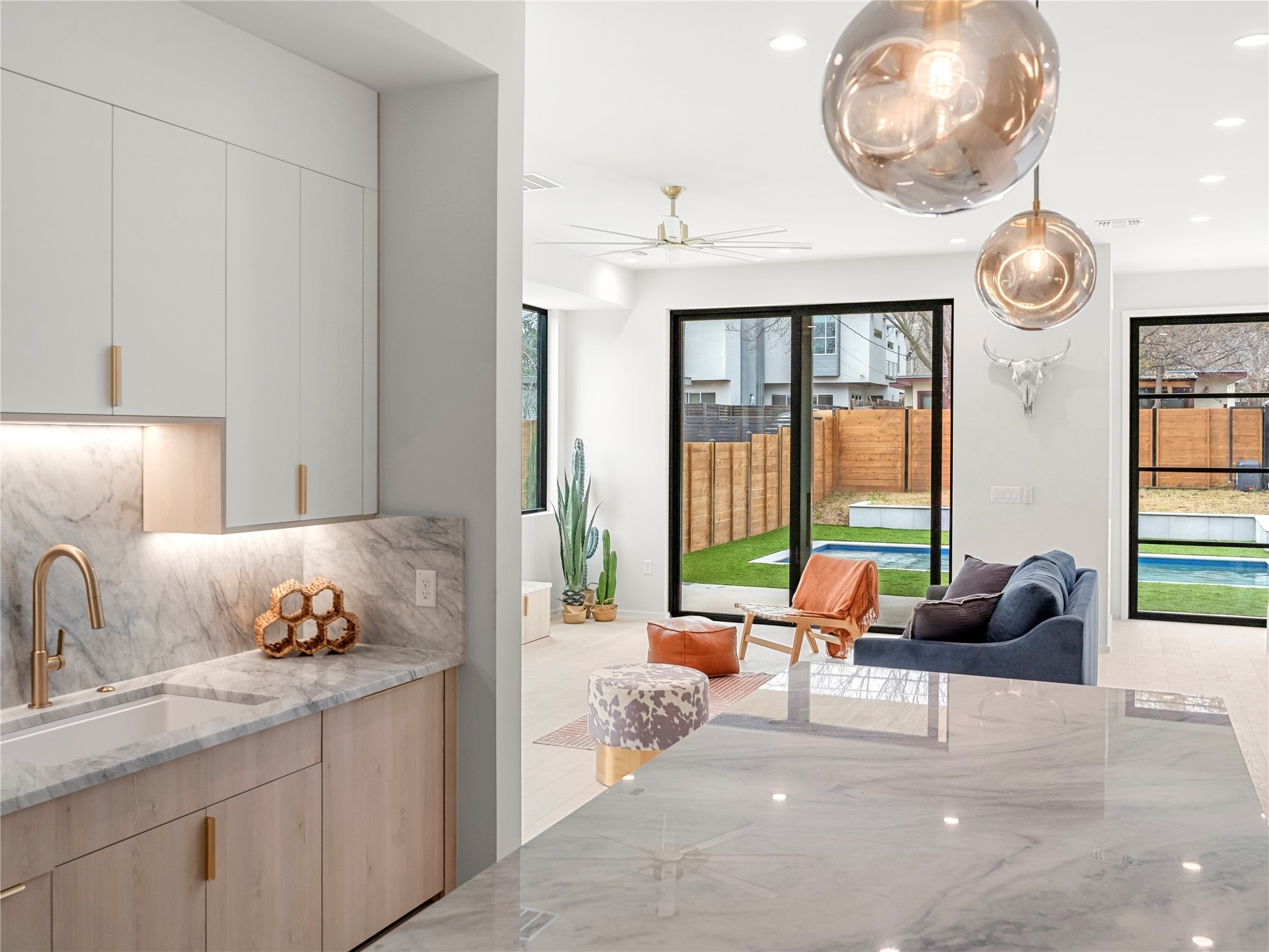 A prestigious residence situated in the coveted Travis Heights Neighborhood of 78704 just 1 block from South Congress: Where Austins soul dances to the rhythm of art, style, food and culture. Yet another jaw dropping design by the incredible McCarley Construction team. This inviting 3 bedroom, 3 bath, 1,981 sqft home will be sure to meet all your comfort needs internally, while also providing external convenience being just seconds to everything SoCo has to offer. Upon entry, you notice an abundance of natural light, while still maintaining a sense of warmth throughout the home by way of the incredible, modern lighting. This well thought out and strategically designed open floor plan is perfect for entertaining and enjoying indoor/outdoor living year-round with a private fenced front yard with a covered patio and sparkling pool. The eat-in kitchen with spacious island is a chefs dream and includes a state-of-the-art appliance package, custom cabinetry and sophisticated quartz countertops. Beyond the beautiful finishes downstairs, find yourself venturing above into your spacious owners suite with curated tile selections for the primary bath, dual vanities, a gorgeous soaking tub, and incredible walk-in closet. Loaded with Smart home features, smooth level 5 drywall finish for the walls, high energy efficient windows and insulation, and a tankless hot water heater are just some of the innovative additions to this home. Not to be missed, a 1 car carport is also attached! Offering an outstanding amount of walkability to some of Austins most iconic places such as Zilker Park, Barton Springs, and Lady Bird Lake, ditch your gym membership and hit some of Austins finest trails nearby. This location and home are truly unbeatable.