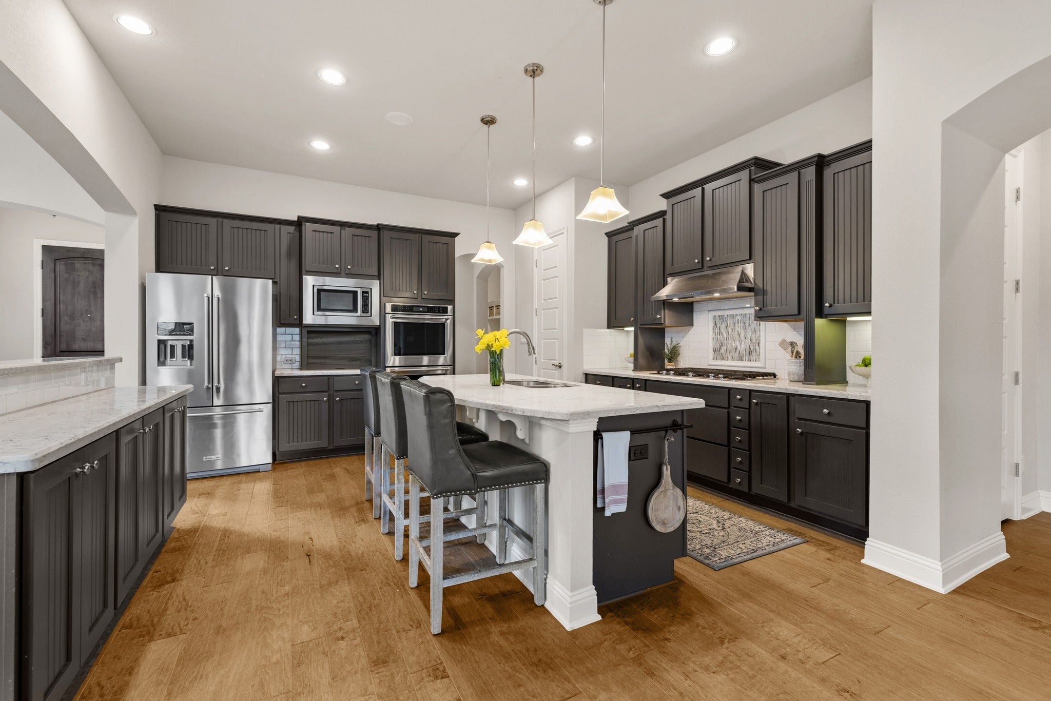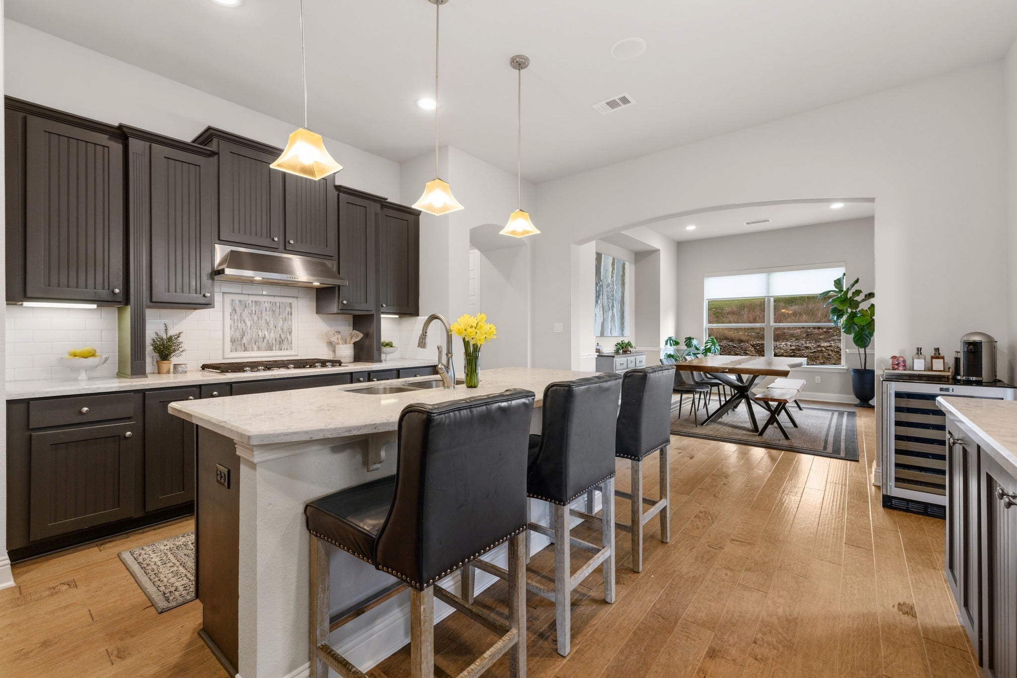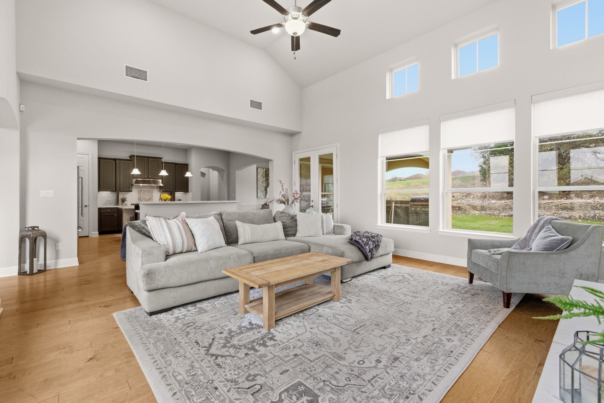 Located in the highly sought-after gated community of Abrantes, this stunning home combines luxury design with exceptional privacy, backing to a scenic greenbelt with panoramic natural views. The striking stone and stucco exterior with tower entry and oversized driveway creates impressive curb appeal from the moment you arrive. Inside, the home features 8-foot doors, rich hardwood floors, and a dramatic two-story family room filled with natural light from expansive windows. The living space is centered around a stunning stone fireplace with custom built-ins, creating an elegant yet comfortable atmosphere for everyday living and entertaining. The chef’s kitchen is beautifully appointed with custom cabinetry, built-in gas appliances, double ovens, under cabinet and pendant lighting, and a spacious pantry, seamlessly flowing into the living and dining areas. A large dining room offers the perfect setting for gatherings and special occasions. The flexible floor plan offers 5 bedrooms, 5 bathrooms, and a dedicated study area, with two bedrooms conveniently located on the main level. The primary suite serves as a private retreat featuring a soaking tub, walk-in shower, dual vanities, and a spacious walk-in closet. Upstairs you’ll find a large game room and generously sized secondary bedrooms, providing plenty of space for family and guests. Additional highlights include electric remote-controlled shades in the living and dining area, a custom built-in mudroom, extensive storage throughout the home and garage, new carpet, and a new roof installed in 2026. The backyard is designed for entertaining, featuring an outdoor kitchen and lush landscaping overlooking the greenbelt and open field behind the home—perfect for relaxing or hosting guests. This home is loaded with thoughtful upgrades and design. This home feeds into top ranked schools and is conveniently located next to tons of restaurants and shopping.