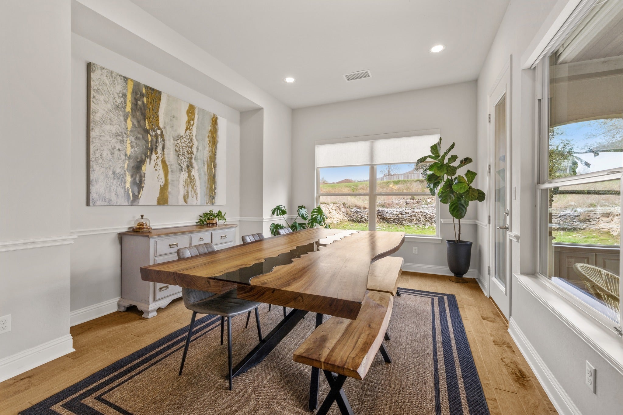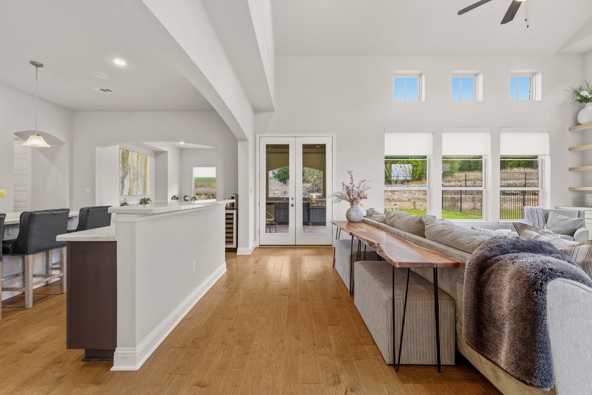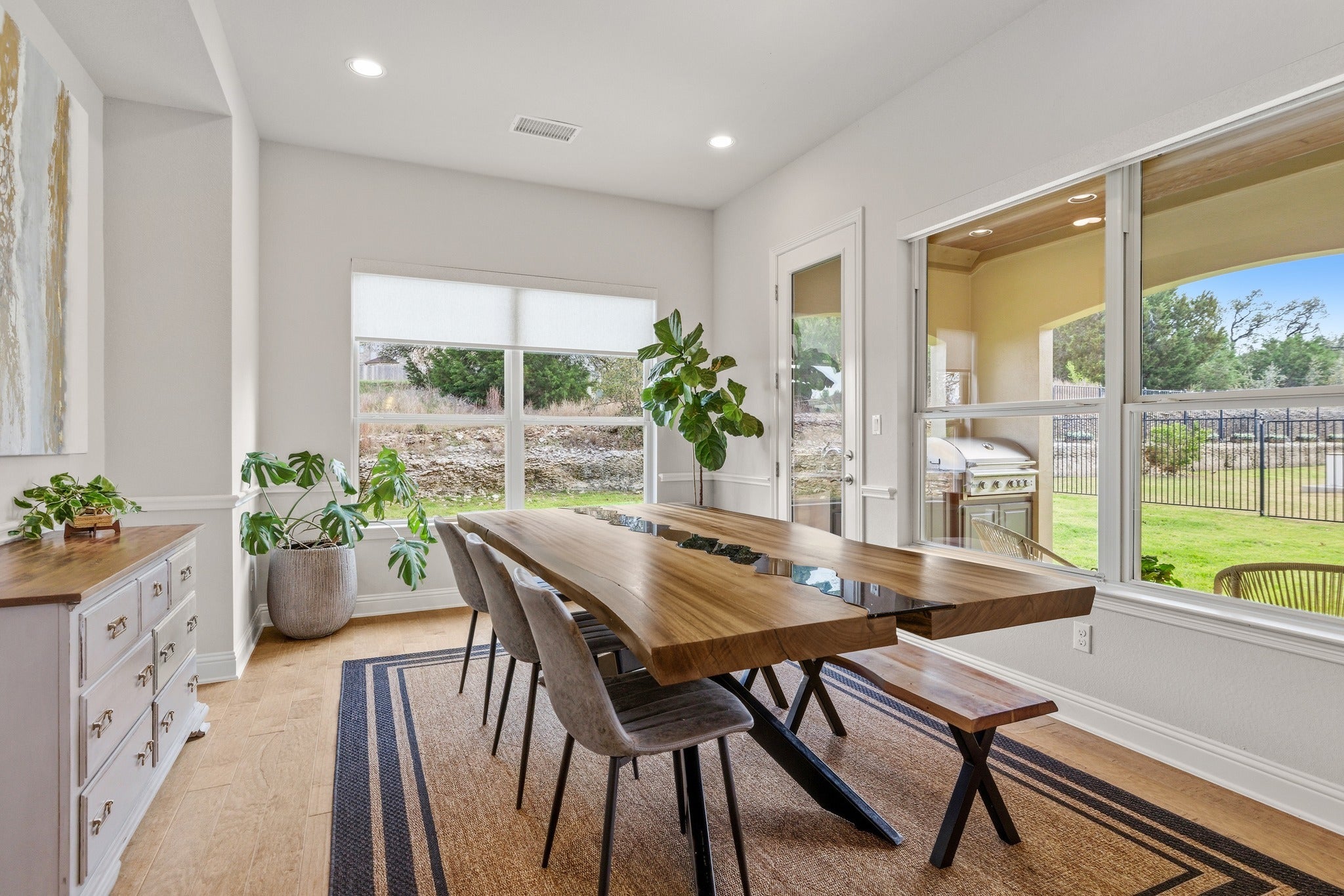 Located in the highly sought-after gated community of Abrantes, this stunning home combines luxury design with exceptional privacy, backing to a scenic greenbelt with panoramic natural views. The striking stone and stucco exterior with tower entry and oversized driveway creates impressive curb appeal from the moment you arrive. Inside, the home features 8-foot doors, rich hardwood floors, and a dramatic two-story family room filled with natural light from expansive windows. The living space is centered around a stunning stone fireplace with custom built-ins, creating an elegant yet comfortable atmosphere for everyday living and entertaining. The chef’s kitchen is beautifully appointed with custom cabinetry, built-in gas appliances, double ovens, under cabinet and pendant lighting, and a spacious pantry, seamlessly flowing into the living and dining areas. A large dining room offers the perfect setting for gatherings and special occasions. The flexible floor plan offers 5 bedrooms, 5 bathrooms, and a dedicated study area, with two bedrooms conveniently located on the main level. The primary suite serves as a private retreat featuring a soaking tub, walk-in shower, dual vanities, and a spacious walk-in closet. Upstairs you’ll find a large game room and generously sized secondary bedrooms, providing plenty of space for family and guests. Additional highlights include electric remote-controlled shades in the living and dining area, a custom built-in mudroom, extensive storage throughout the home and garage, new carpet, and a new roof installed in 2026. The backyard is designed for entertaining, featuring an outdoor kitchen and lush landscaping overlooking the greenbelt and open field behind the home—perfect for relaxing or hosting guests. This home is loaded with thoughtful upgrades and design. This home feeds into top ranked schools and is conveniently located next to tons of restaurants and shopping.