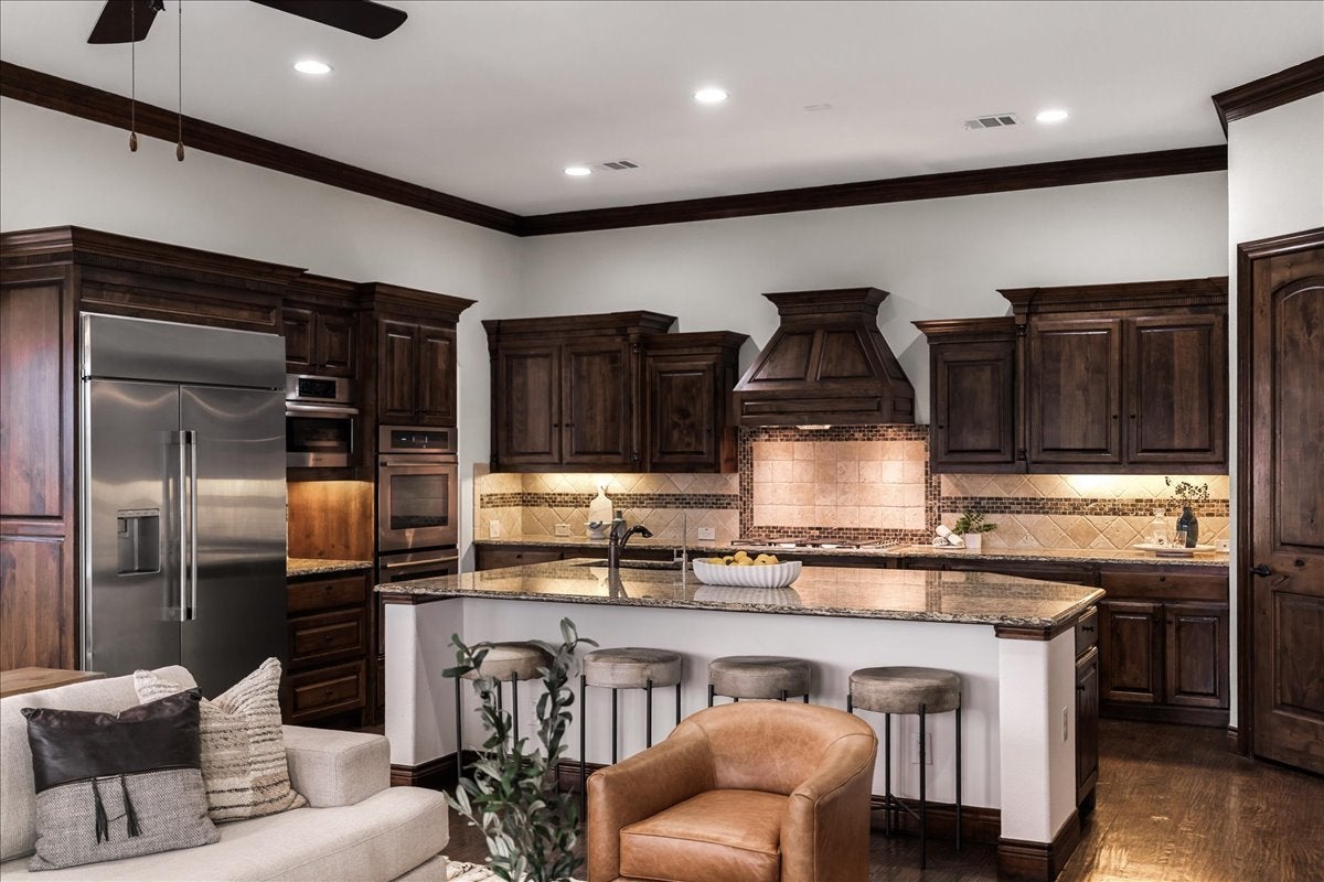 - Built-In Oven, Dishwasher, Exhaust Fan, Gas Cooktop, Disposal, Refrigerator, Stainless Steel Appliance(s), Wine Refrigerator