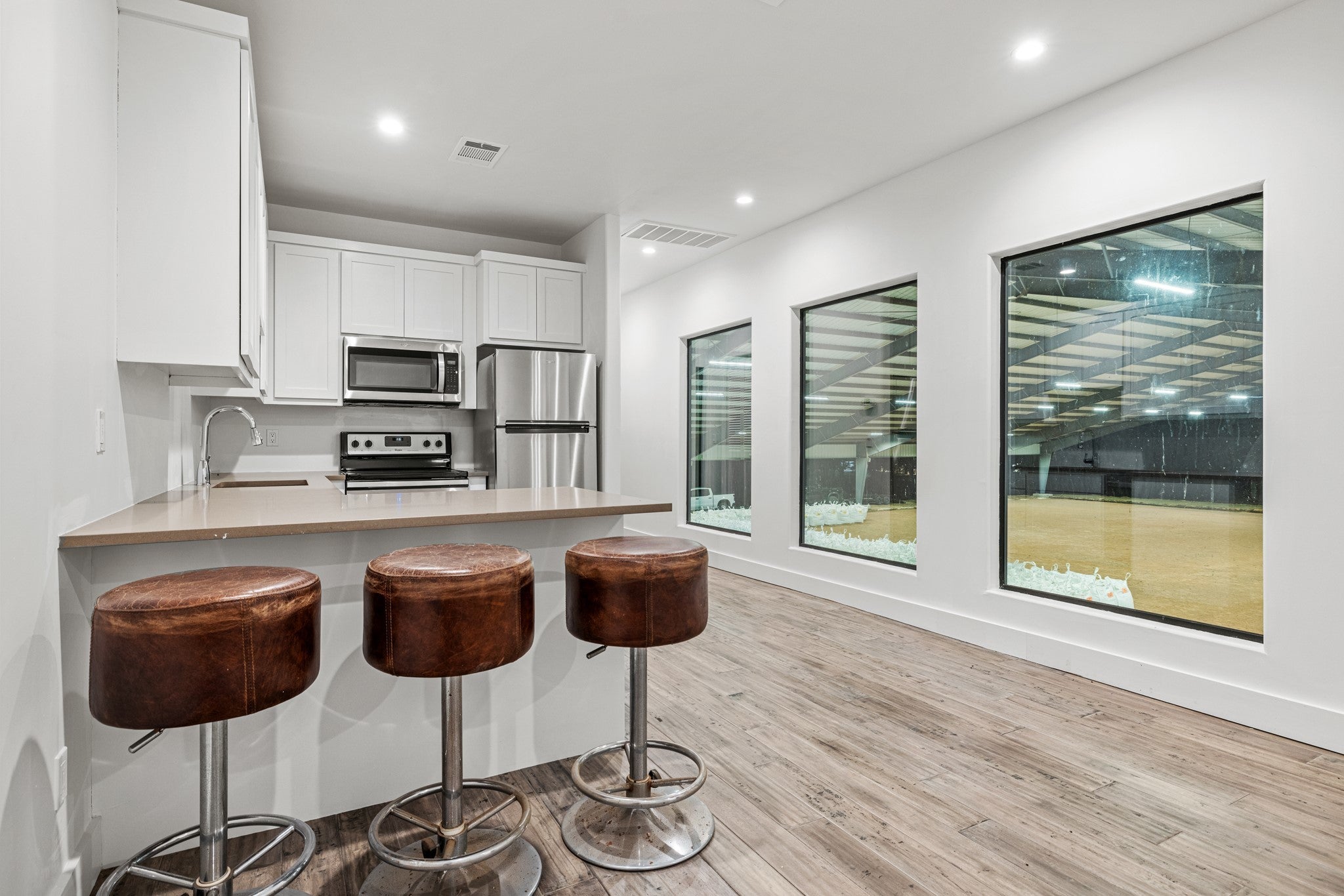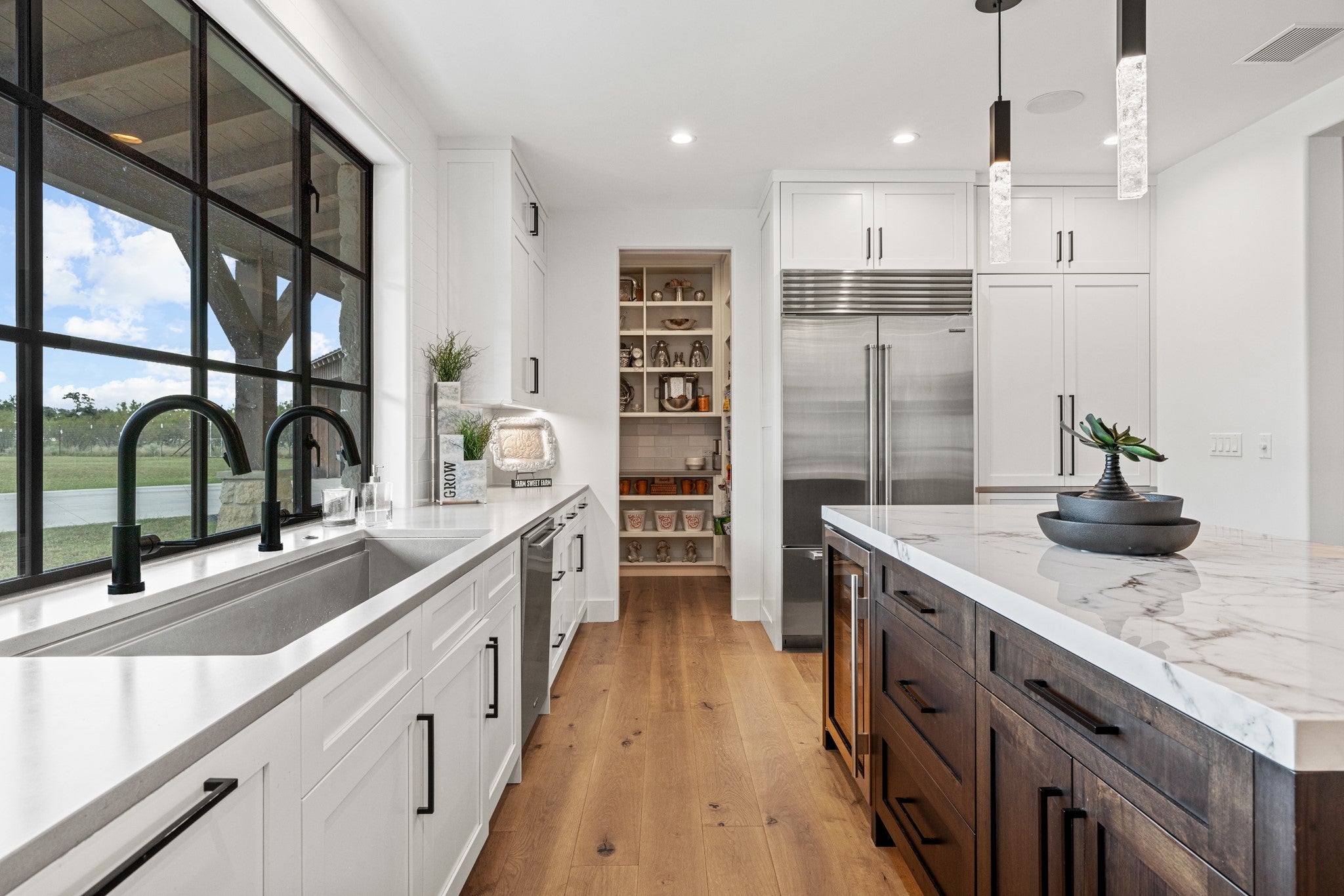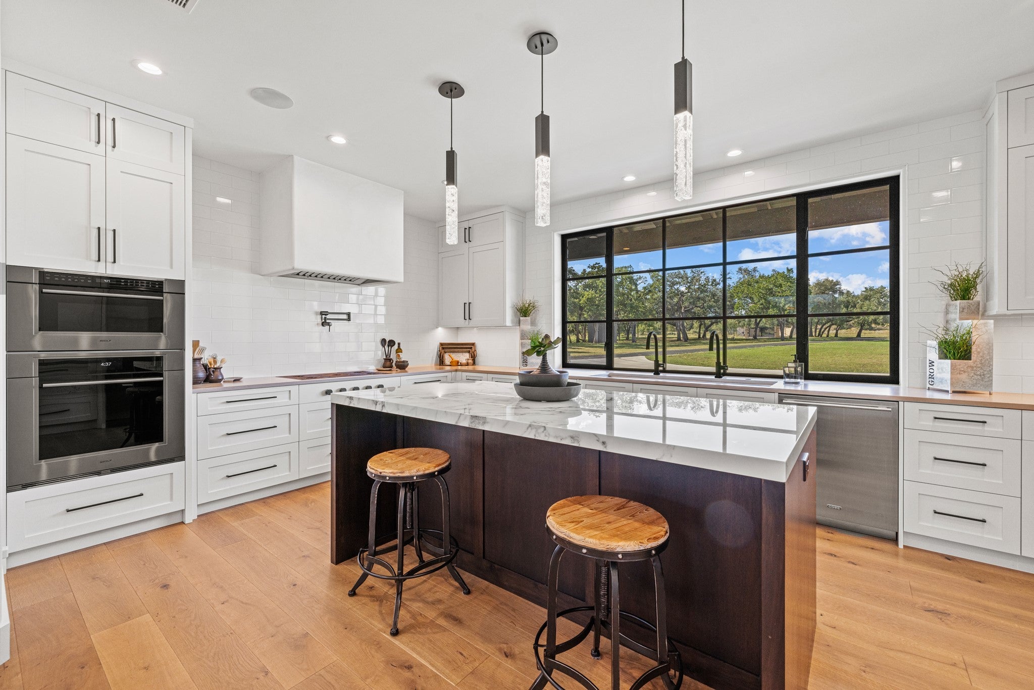 At the gateway to one of Texas’ most iconic landscapes, Enchanted Rock Ranch offers 36± acres of rolling Hill Country terrain directly across from Enchanted Rock State Natural Area. Enjoy front-row sunset views over the famed pink granite dome with immediate access to hiking, climbing, and wildlife. Just 20 miles from Fredericksburg and 90 miles from Austin and San Antonio, the property pairs privacy with convenience. Seller financing negotiable. The land blends open pasture and wooded creek bottom, highlighted by 685± feet of Keener Branch Creek and a scenic 0.25-acre lined tank with fishing dock. Approximately 20 acres of mature hardwoods provide habitat for whitetail, axis, turkey, dove, and ducks. Sixteen acres are high-fenced, with the balance low-fenced. An agricultural valuation is in place and may convert to wildlife management. Irrigation lines in the front pasture offer vineyard or orchard potential, while granite outcroppings create additional homesite opportunities. Completed in 2020, the ~4,000 SF custom residence by Nadeau Architecture and built by Bill Dunn blends timeless design with modern finishes. The 3BR/3.5BA layout includes two ensuite bedrooms downstairs, an upstairs guest suite, office, den, and formal living with built-in surround sound. The chef’s kitchen features Wolf, Sub-Zero, and Cove appliances, custom cabinetry, quartz counters, and a large island. The primary suite includes a fireplace and spa-style bath. A screened porch overlooks a prime pool site. Two active wells support the improvements. The 12,300 SF clear-span covered arena offers versatility for equestrian use, events, workshop space, or conversion. Six 12x12 stalls, tack room, wash bay, guest apartment, observation deck, rainwater collection system, and outdoor arena complete this rare Hill Country offering.