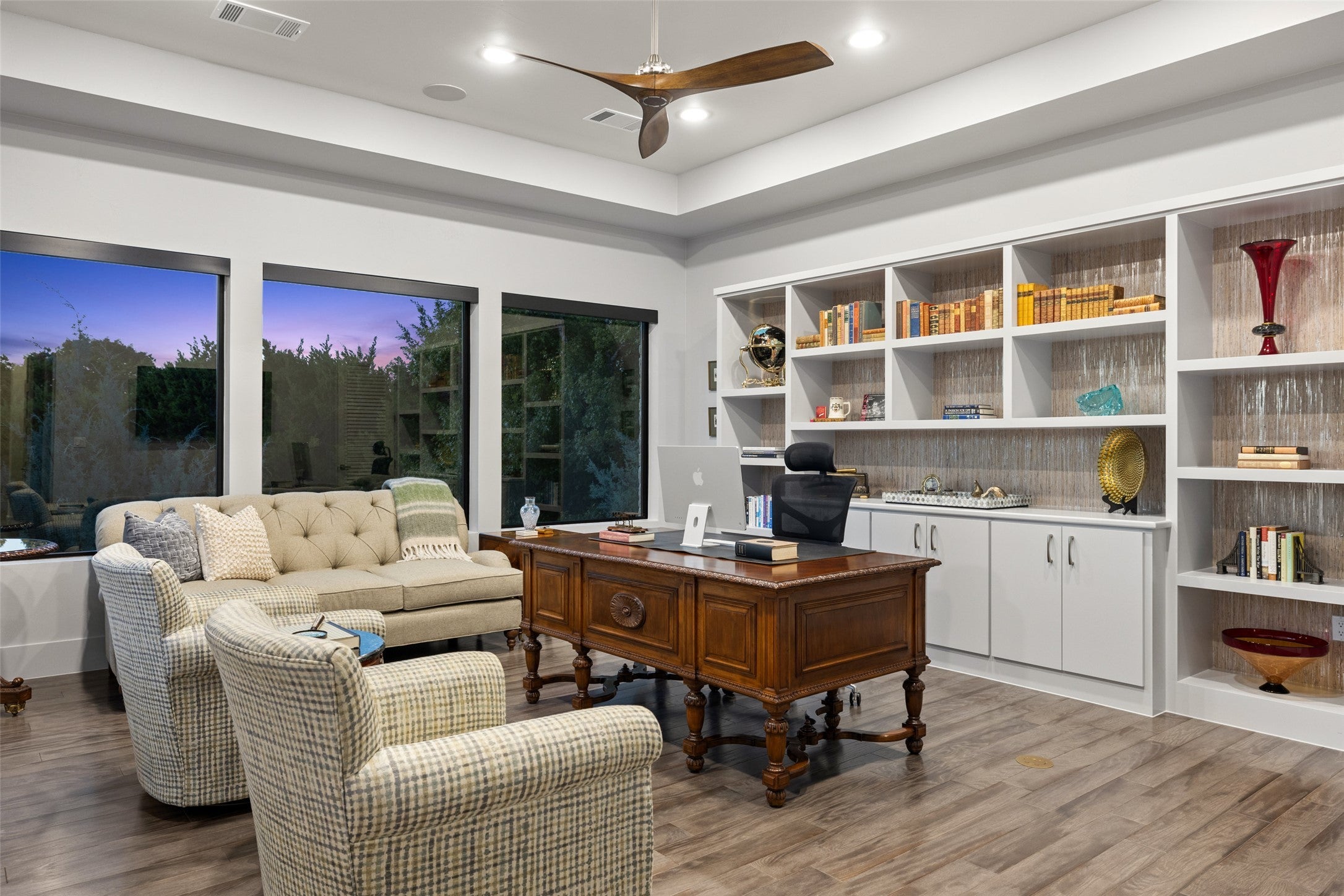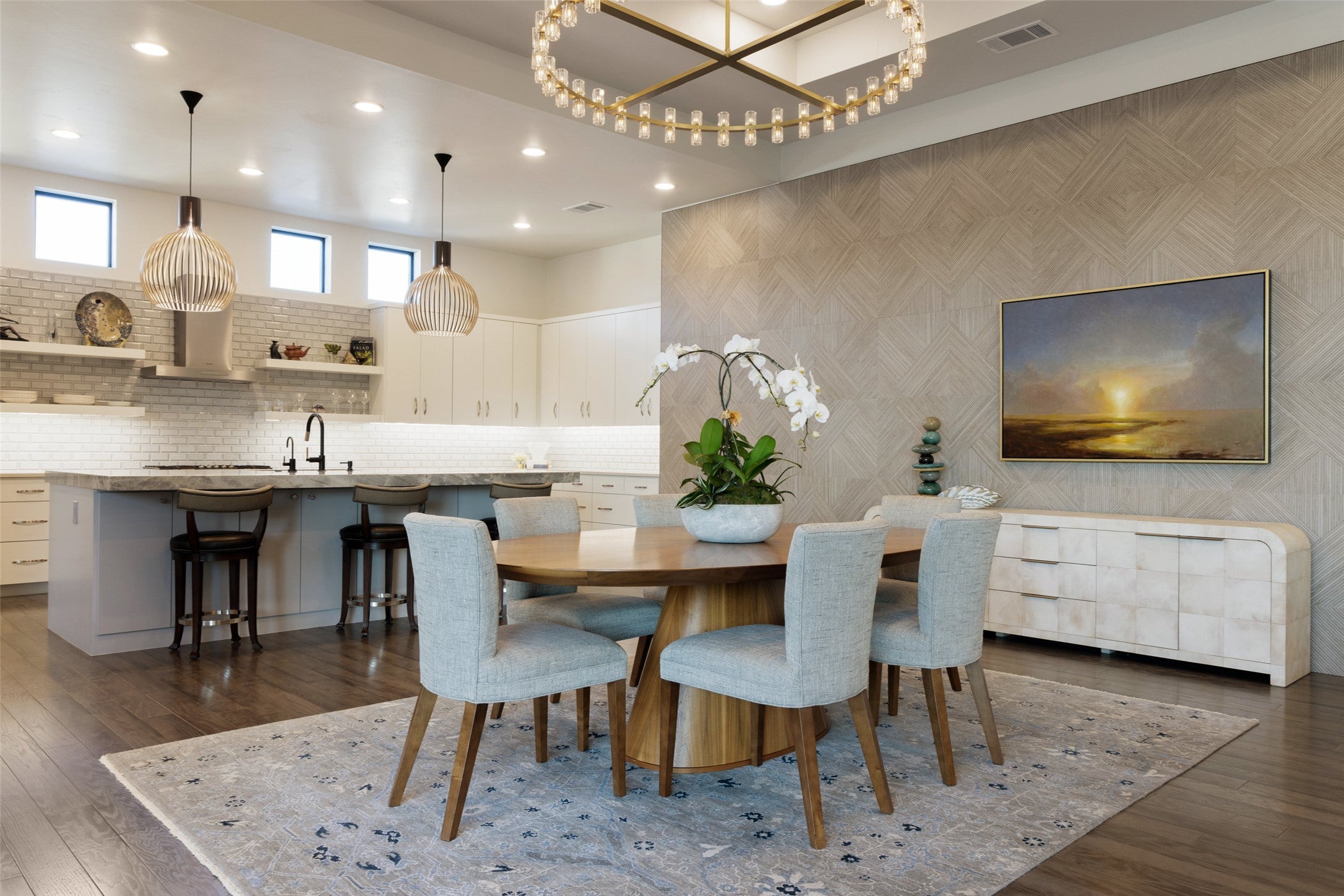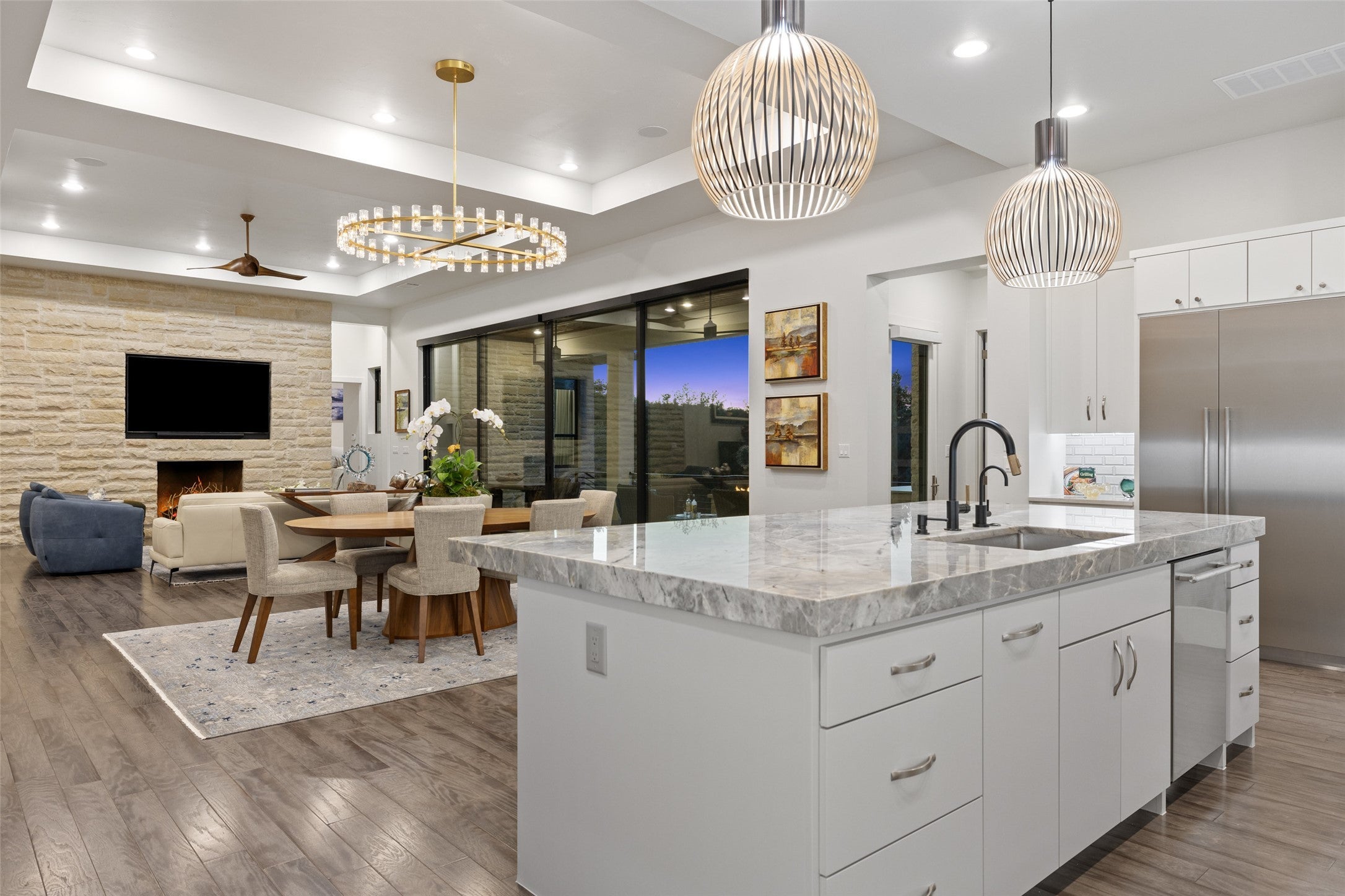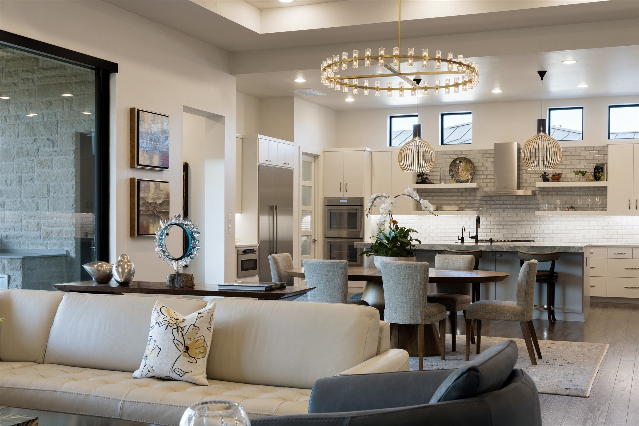 Villa Venezia marries European elegance with effortless single-story living on the 9th fairway of The Canyons Golf Course in Amarra at Barton Creek. Cloaked in hand-chipped, imported Lueders stone, the architecture feels timeless yet fresh, setting the stage for interiors curated with designer wallpapers, a sophisticated lighting program, and elevated finishes that create warmth, texture, and continuity throughout. The chef’s kitchen, fitted with Thermador appliances, showcases 3" thick quartz island, quartzite countertops and a serving bar that opens directly to the living room—ideal for entertaining and everyday ease. Four private en-suite bedrooms plus a half bath provide hotel-level comfort, while the single-level plan underscores true lock-and-leave living. An oversized garage offers abundant storage for golf gear and Hill Country toys. Outdoor living unfolds on a large covered patio with a built-in grill and fire pit, framed by lush, professionally designed landscaping that maximizes beauty and privacy. The property is fully secured behind a gated motor court and a secondary gated front entry, creating a tranquil retreat moments from Barton Creek’s premier amenities. Walk to The Canyons Golf Course or take your cart; access to the 9th fairway is at your doorstep. Designer lighting and interiors elevate every room; select furnishings are negotiable for a turnkey transition.