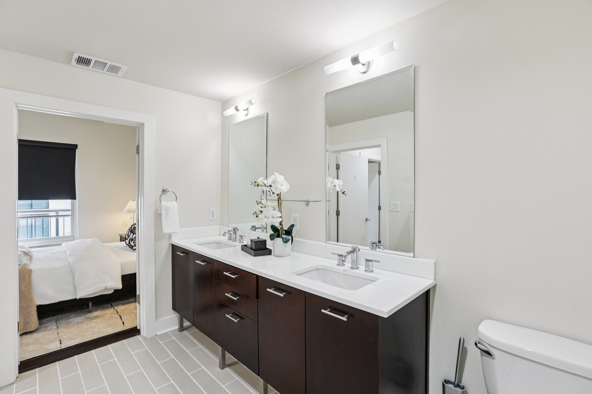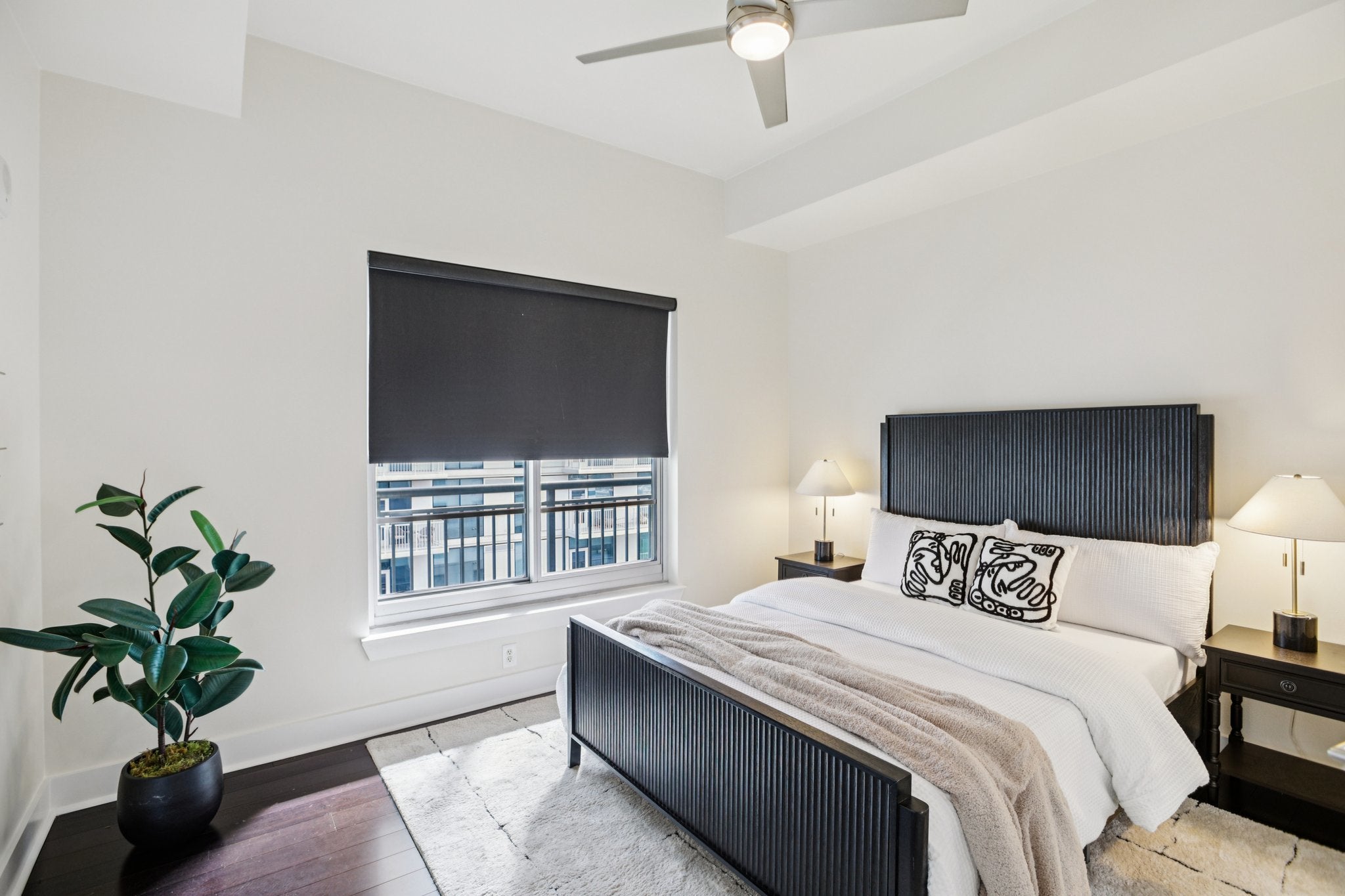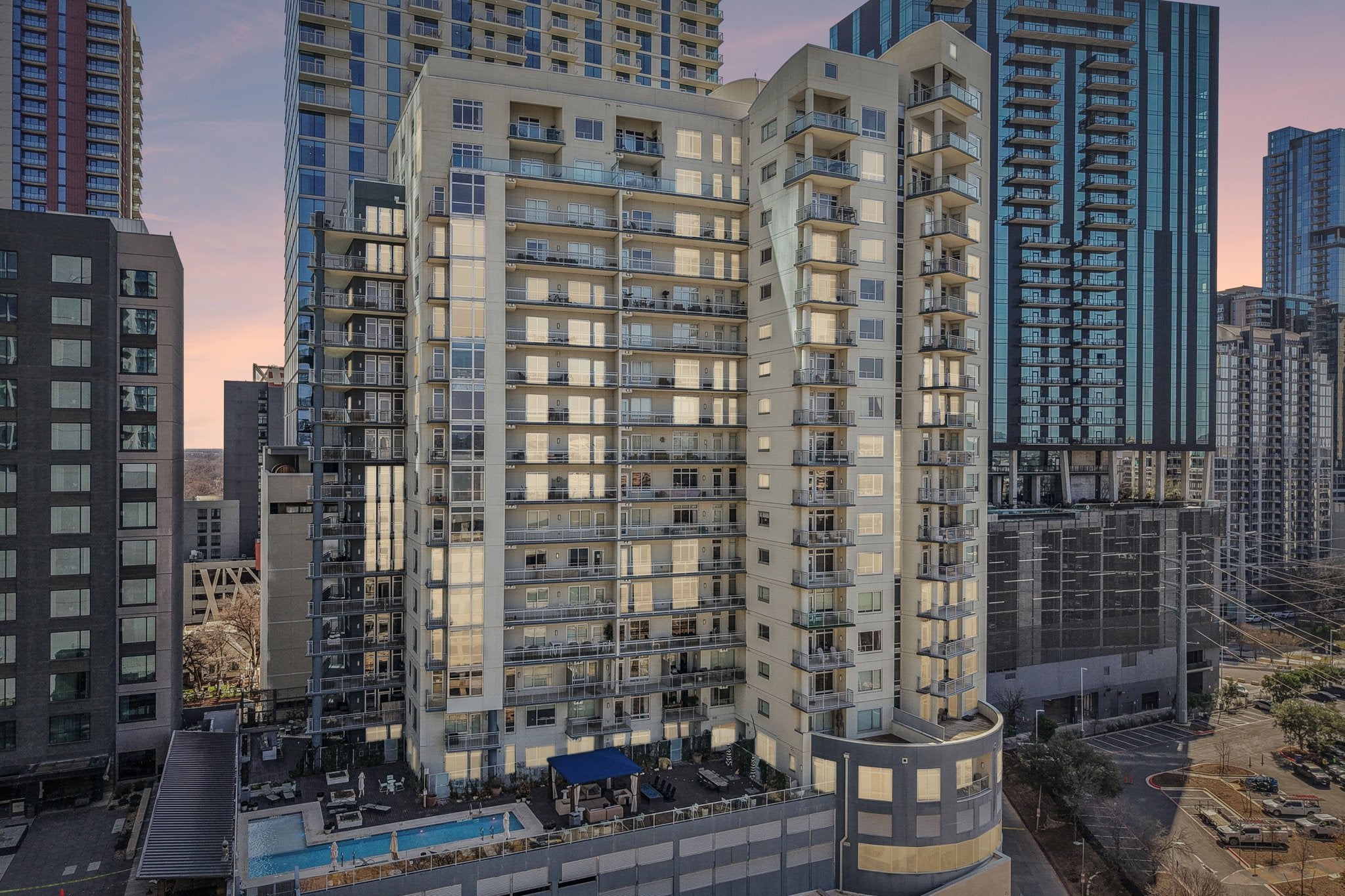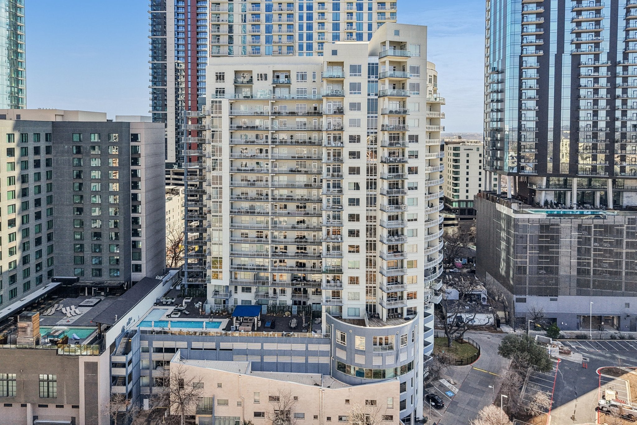 Rise above the vibrant energy of the Rainey Street District in this immaculate 20th-floor residence at The Shore Condominiums. Offering a rare and highly functional 879-square-foot floor plan, this unit distinguishes itself with a dedicated private office space, making it the ultimate urban sanctuary for the modern professional. Floor-to-ceiling windows frame dynamic city and water views, flooding the open-concept living area with natural light and creating an airy, sophisticated atmosphere. Inside, the residence features new interior paint and rich wood flooring that flows seamlessly from the entry through the main living areas. The gourmet kitchen is designed for entertaining, showcasing a generous breakfast bar, sleek granite countertops, dark espresso cabinetry, and a suite of stainless steel appliances. Just off the living room, a private balcony offers a front-row seat to Austin's skyline, perfect for morning coffee or evening relaxation. The spacious primary suite serves as a quiet retreat, complete with a walk-in closet and an en-suite bathroom featuring a dual vanity and a large glass-enclosed shower. Beyond the unit, The Shore provides a premier "lock-and-leave" lifestyle with 24-hour concierge services and secure access. Residents enjoy exclusive amenities, including a resort-style pool deck and fitness center. Just outside your door, the best of Austin awaits: direct access to the Ann and Roy Butler Hike-and-Bike Trail for outdoor enthusiasts, and the city’s top dining and nightlife destinations right around the corner. With easy access to I-35 and the convention center, this property offers an unbeatable combination of security, convenience, and modern luxury.