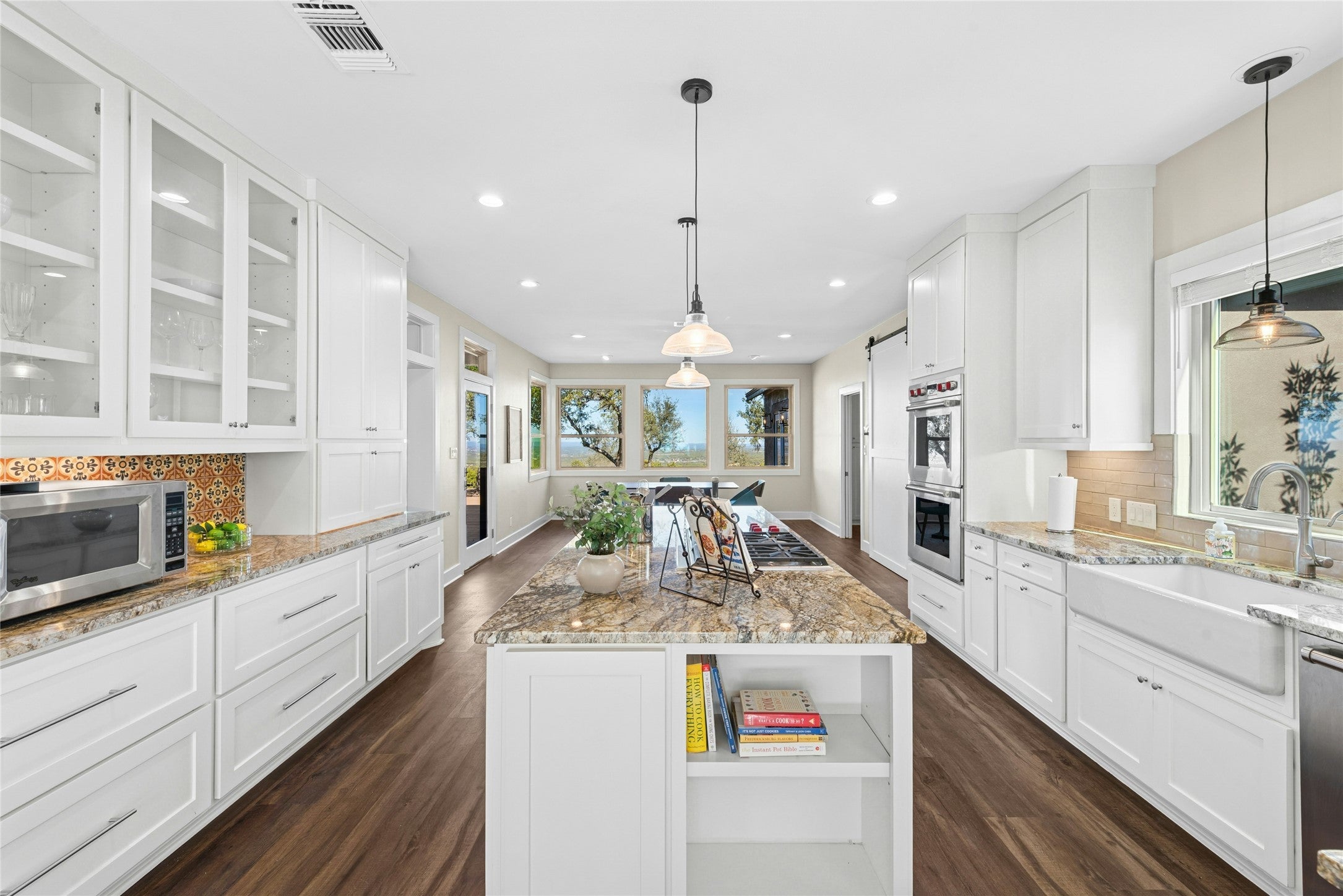 Experience stunning and expansive vistas of the Texas Hill Country from every room in this gorgeous hilltop home. At almost 1600' elevation, you can see for miles and every room showcases the extraordinary landscape. The property is ideally situated between Austin, San Antonio and the Texas Wine Trail. And while it feels far from cities and towns, you're just minutes from Dripping Springs, Blanco and Johnson City, and less than an hour from Austin, San Antonio and Fredericksburg. The home was completely remodeled in 2024 with comfort and luxury in mind. Once inside, you'll find multiple living and dining areas, a large gourmet kitchen with premium Wolf and Subzero appliances, a luxurious primary suite, large home office or flex room, oversize walk-in pantry, and two private bedrooms and bath upstairs. A newly constructed "gentleman's barn" offers ample parking for multiple cars or an RV, as well as a workshop. The building's design allows for the addition of a 2nd floor guest apartment. The property's 14+ acres feature a grotto, hiking trails, and abundant wildlife. The Wildlife Exemption gives you the opportunity to enjoy native game--and a significant tax break. When you walk the trails you'll find your favorite quiet space or views of the Hill Country. As part of the Ranches at Dripping Springs development, you'll enjoy a thoughtfully planned community on almost 400 acres that honors and celebrates the topography, flora and fauna. Are you looking for your primary residence or a 2nd home? A place to be near your students in Austin, San Marcos or San Antonio? Embrace luxury and tranquility in this Hill Country gem!