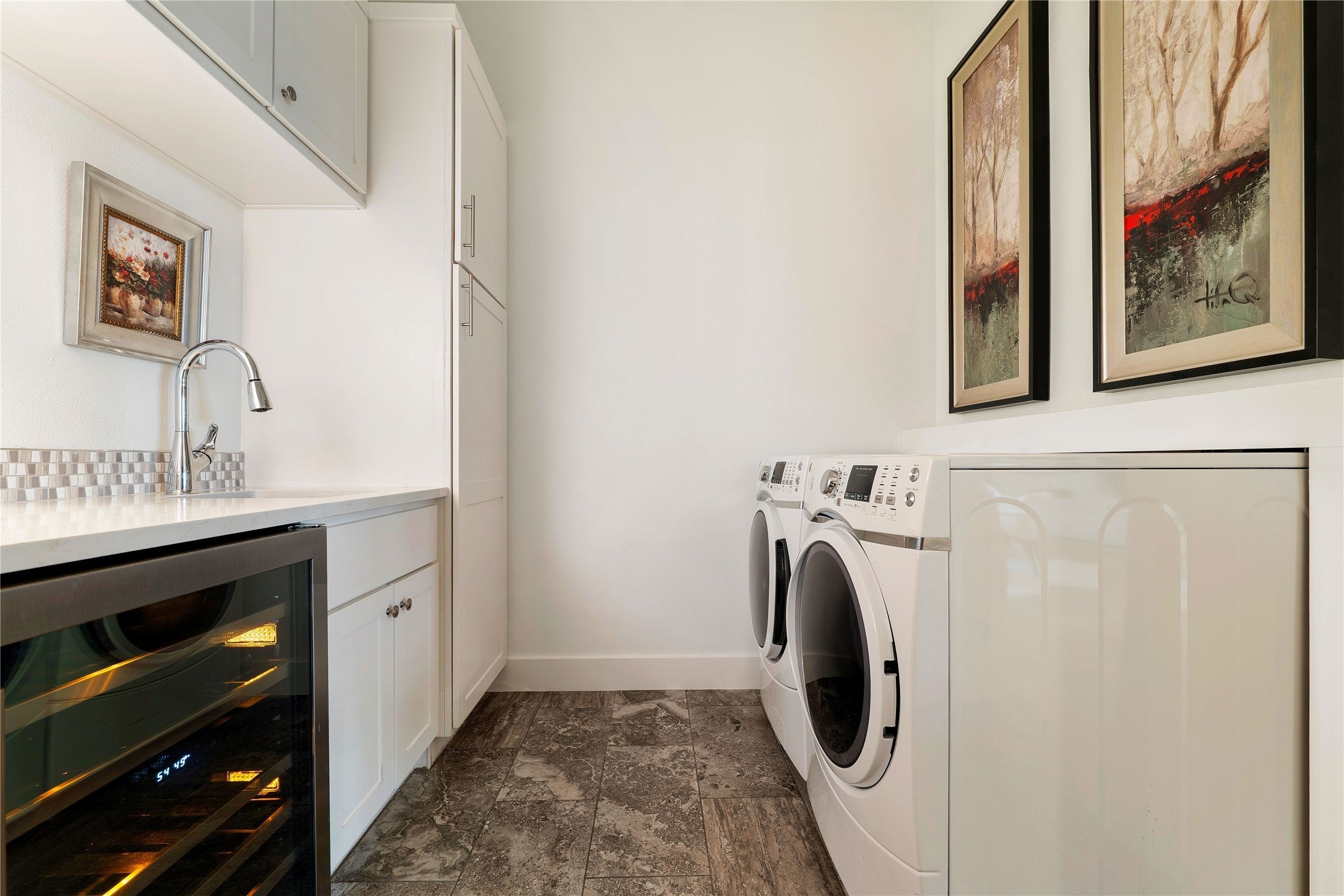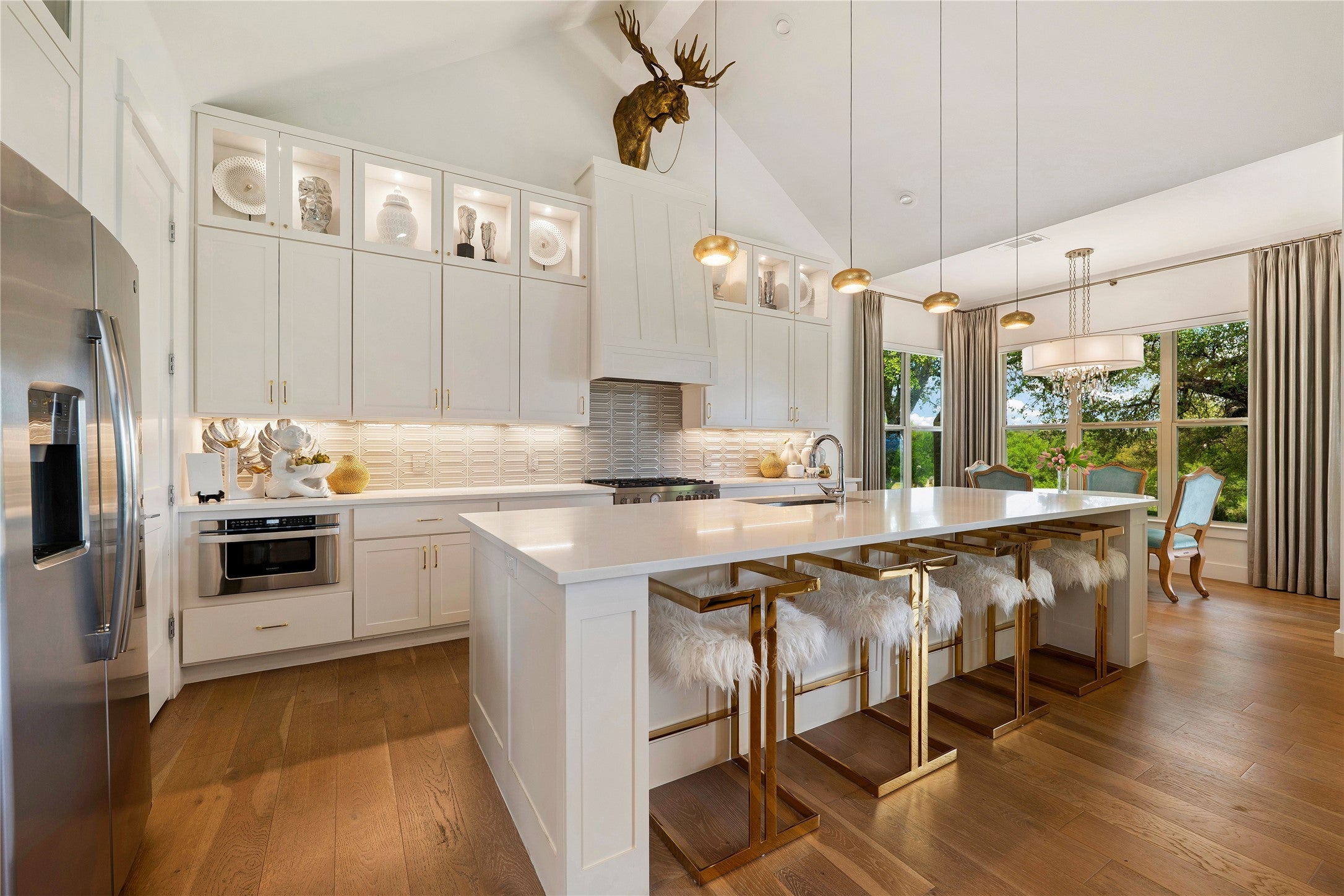 - Built-In Gas Oven, Cooktop, Dishwasher, Gas Cooktop, Disposal, Microwave, Oven, Refrigerator, Range Hood, Stainless Steel Appliance(s), Wine Refrigerator