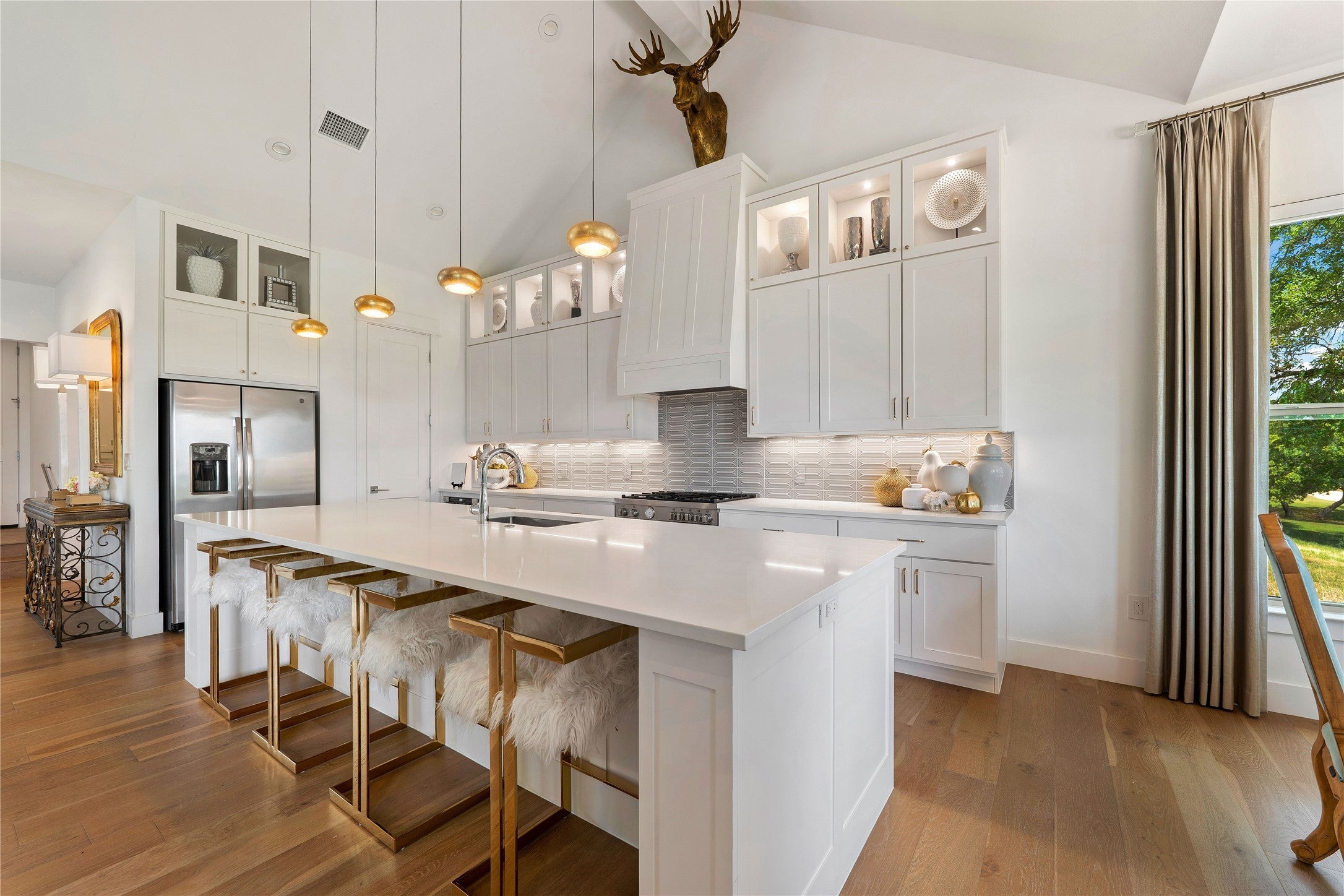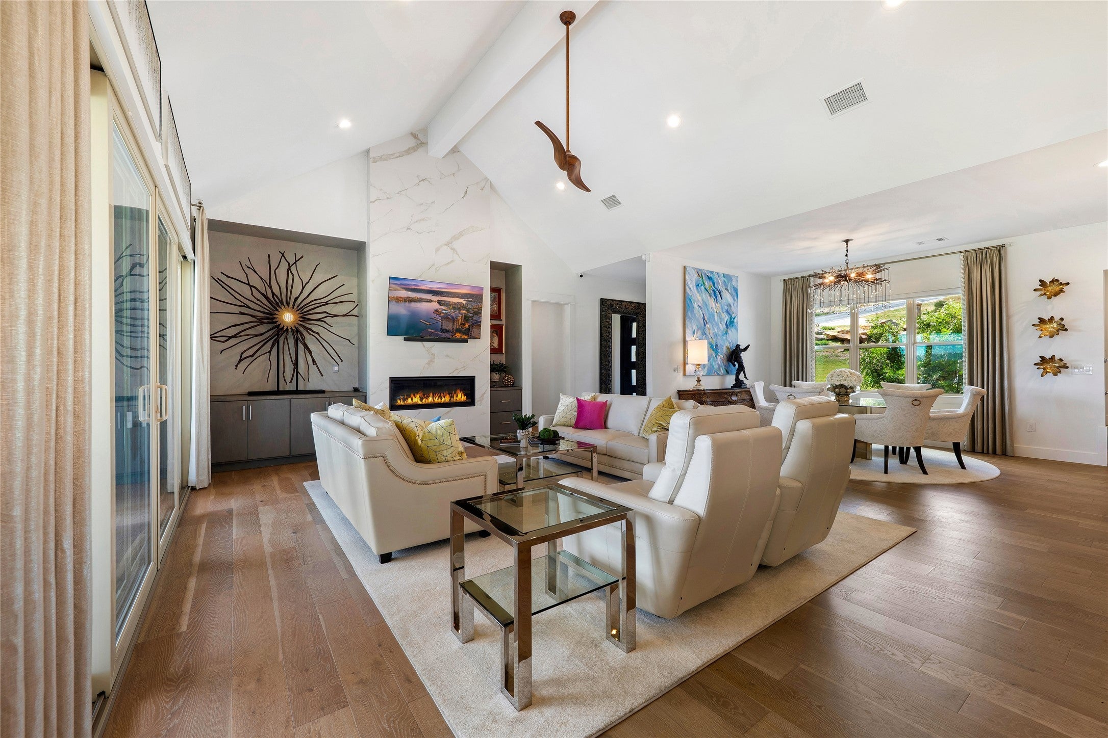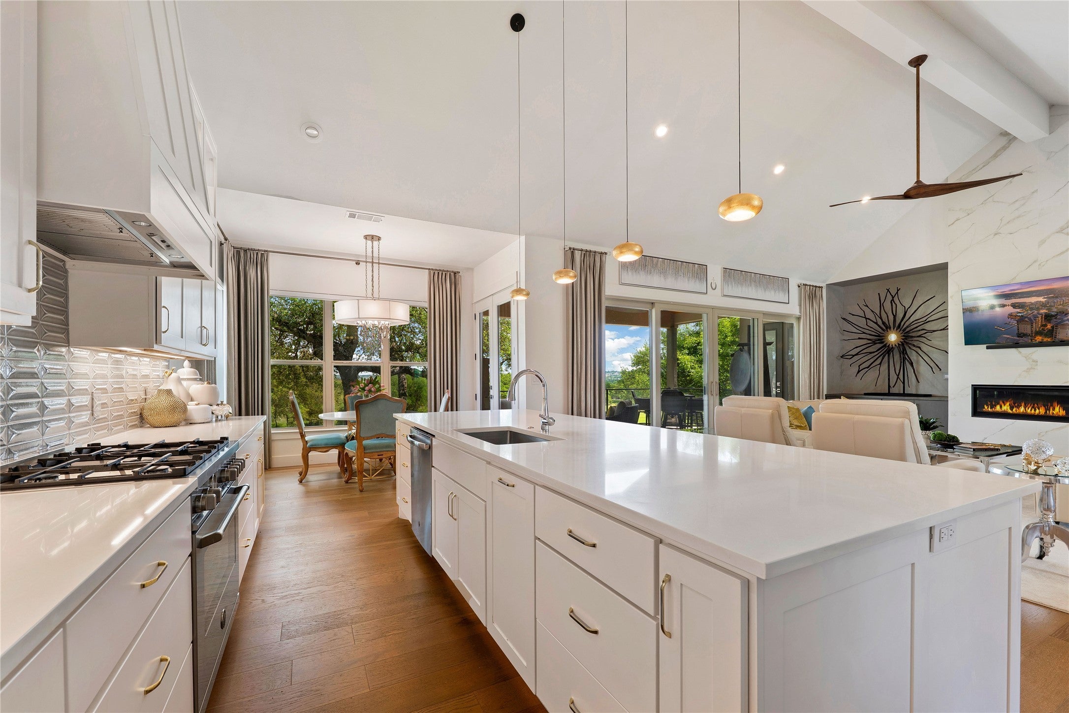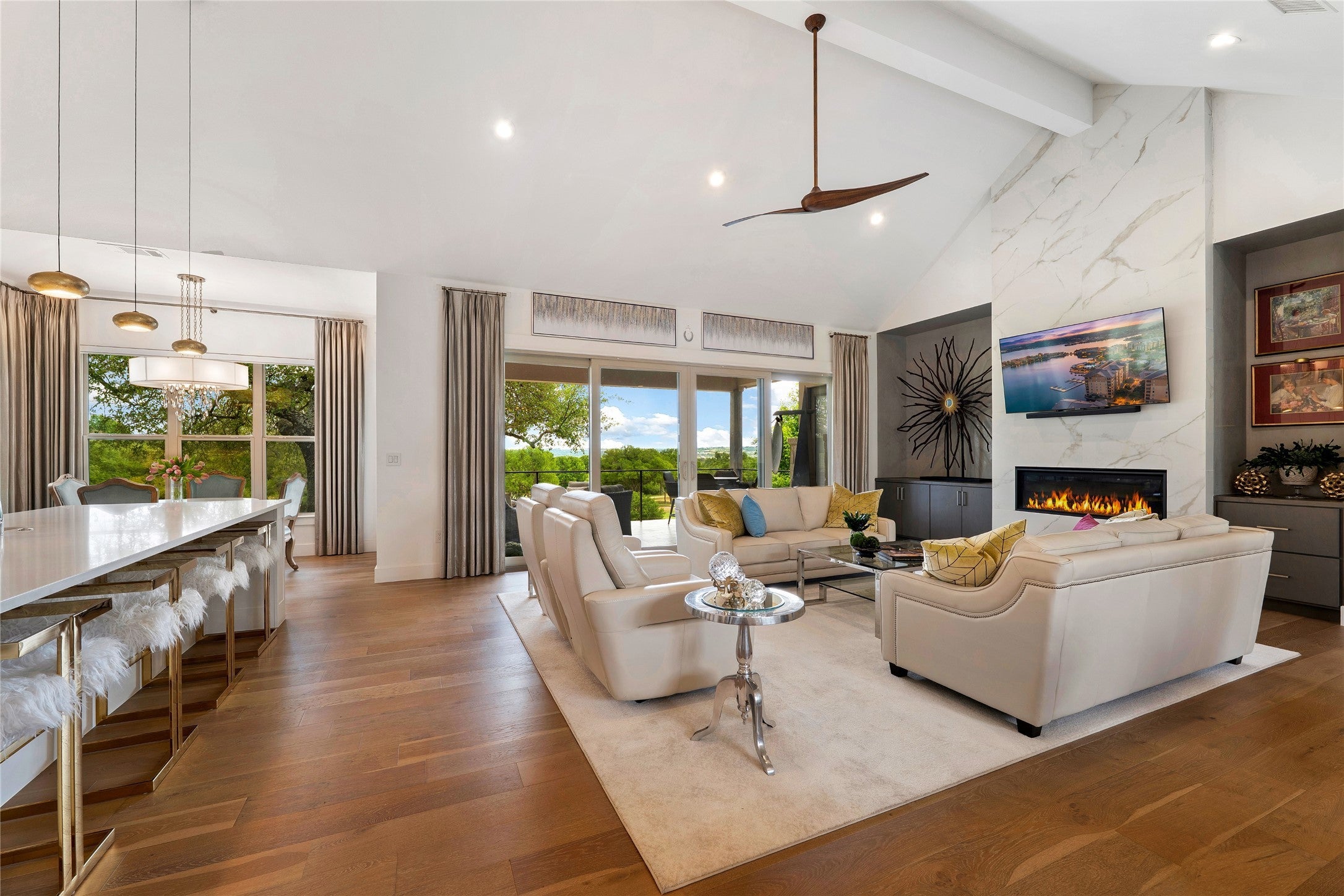 Experience refined golf course living in this stunning 4-bedroom, 3-bath home overlooking the 2nd hole of Ram Rock Golf Course in Horseshoe Bay. With 3,160 square feet of thoughtfully designed space, this home blends elegance, comfort, and functionality. The open-concept living area features a gas fireplace with custom built-ins and seamless access to a covered back patio through sliding doors—perfect for enjoying serene golf course views. The chef’s kitchen is beautifully appointed with quartz countertops, tile backsplash, a 5-burner gas range, and a spacious walk-in pantry, complemented by both a dedicated dining room and eat-in kitchen area. The main-floor primary suite offers a private retreat with French doors leading to the patio, dual walk-in closets with built-ins, and a spa-like bath featuring dual quartz vanities, a soaking tub, and a walk-in shower. A secondary bedroom and full bath on the main level provide ideal space for guests. Upstairs, you’ll find two additional bedrooms, a full bath, and a versatile landing area perfect for a home office, gym, or flex space. Additional highlights include a stone and stucco exterior, full gutters, electric shades, built-in storage throughout, and a well-equipped laundry room with a wine fridge and utility sink. Enjoy the best of indoor-outdoor living in a prime golf course setting.