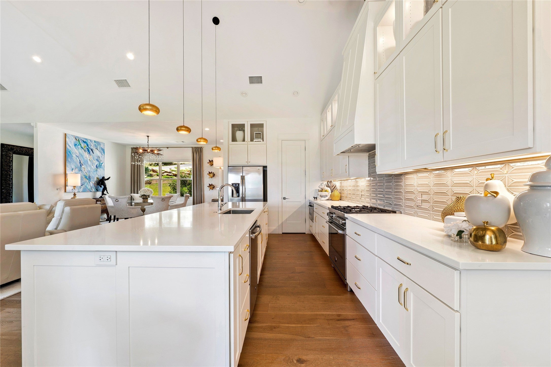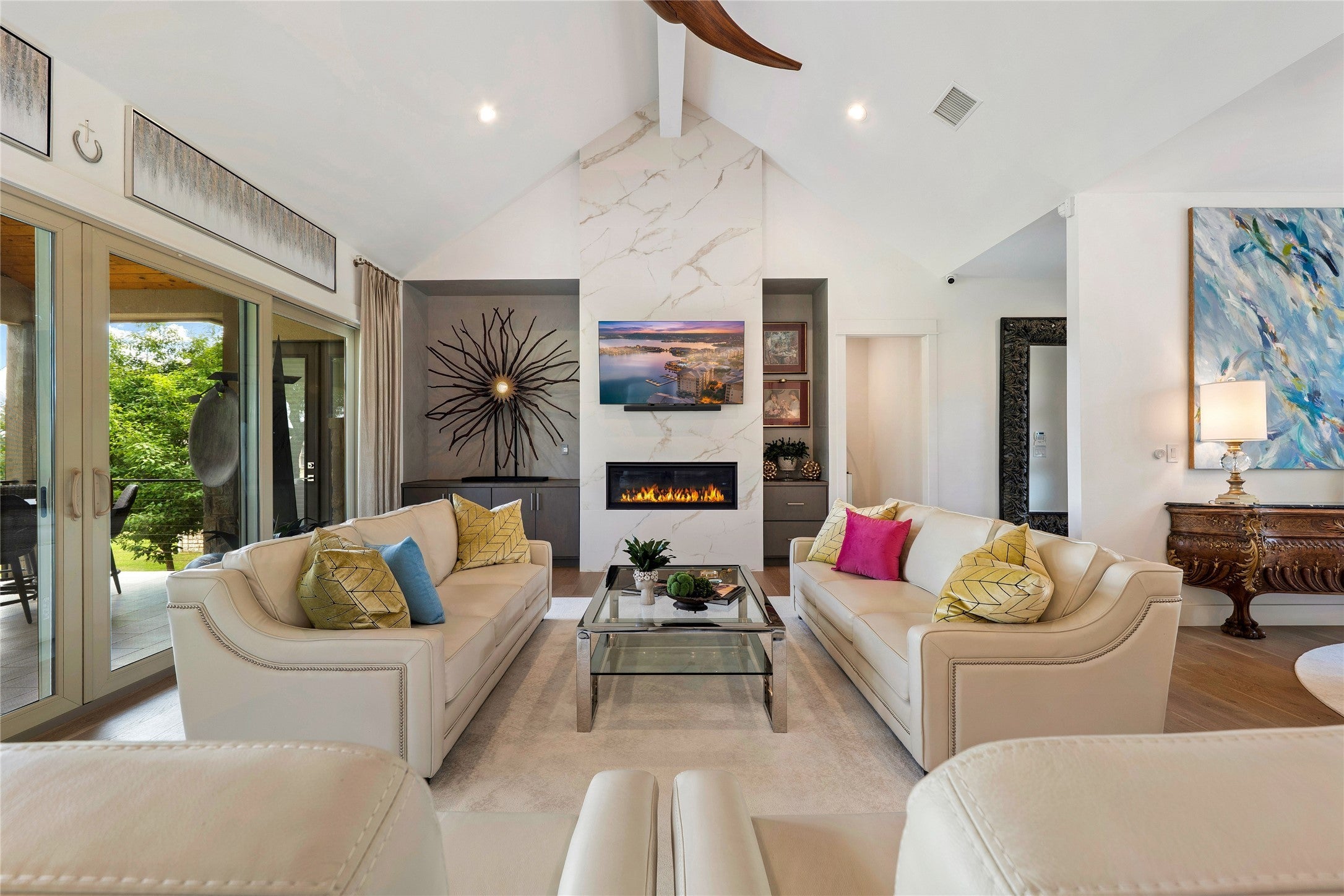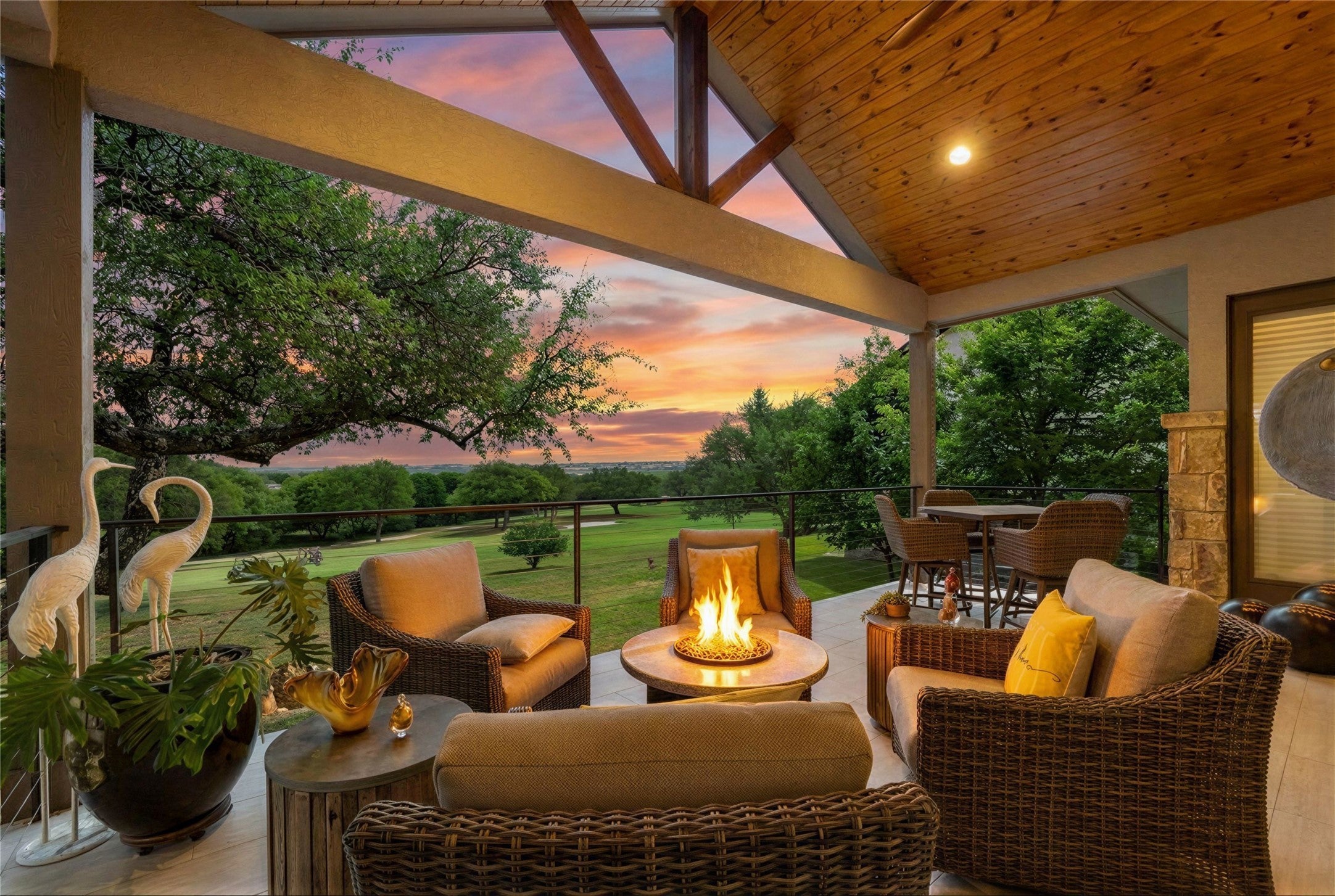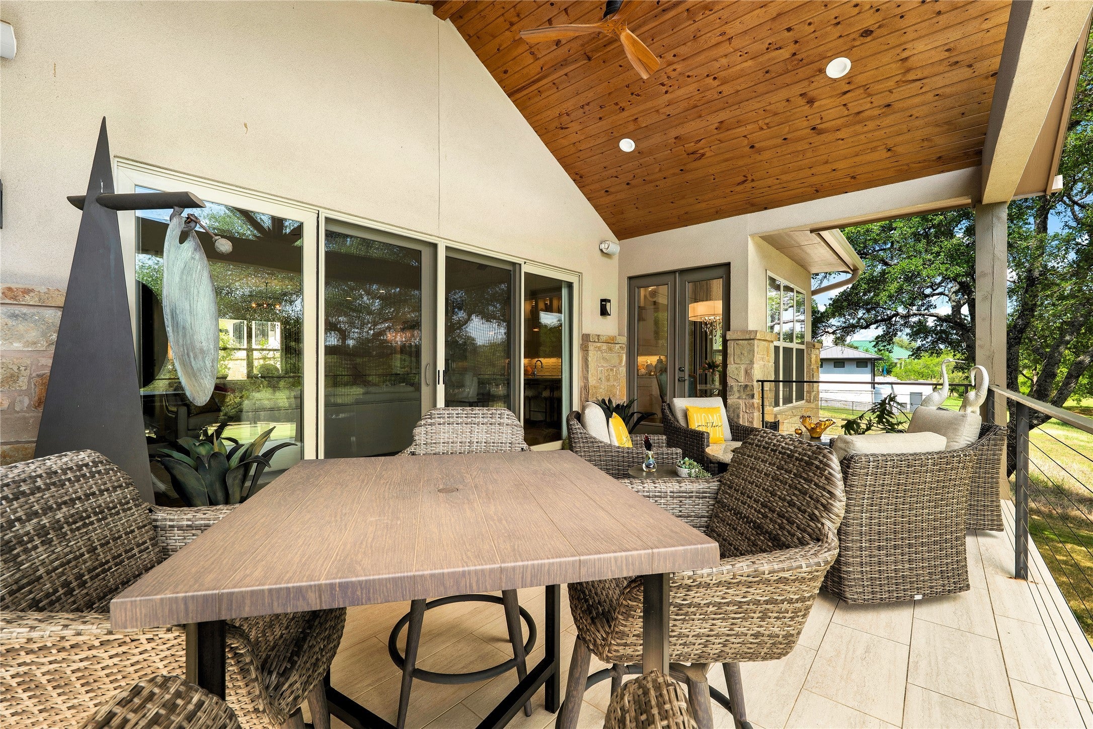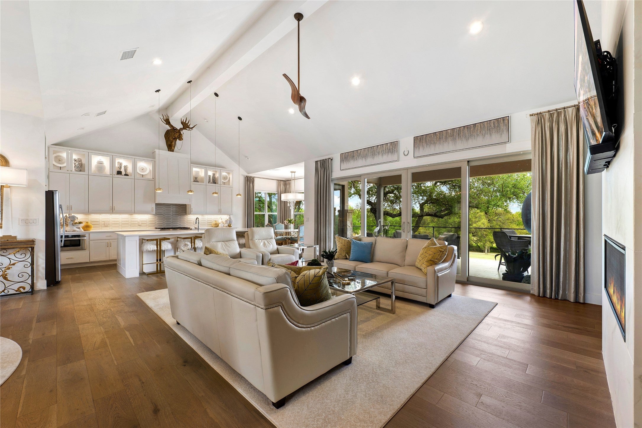 Experience refined golf course living in this stunning 4-bedroom, 3-bath home overlooking the 2nd hole of Ram Rock Golf Course in Horseshoe Bay. With 3,160 square feet of thoughtfully designed space, this home blends elegance, comfort, and functionality. The open-concept living area features a gas fireplace with custom built-ins and seamless access to a covered back patio through sliding doors—perfect for enjoying serene golf course views. The chef’s kitchen is beautifully appointed with quartz countertops, tile backsplash, a 5-burner gas range, and a spacious walk-in pantry, complemented by both a dedicated dining room and eat-in kitchen area. The main-floor primary suite offers a private retreat with French doors leading to the patio, dual walk-in closets with built-ins, and a spa-like bath featuring dual quartz vanities, a soaking tub, and a walk-in shower. A secondary bedroom and full bath on the main level provide ideal space for guests. Upstairs, you’ll find two additional bedrooms, a full bath, and a versatile landing area perfect for a home office, gym, or flex space. Additional highlights include a stone and stucco exterior, full gutters, electric shades, built-in storage throughout, and a well-equipped laundry room with a wine fridge and utility sink. Enjoy the best of indoor-outdoor living in a prime golf course setting.