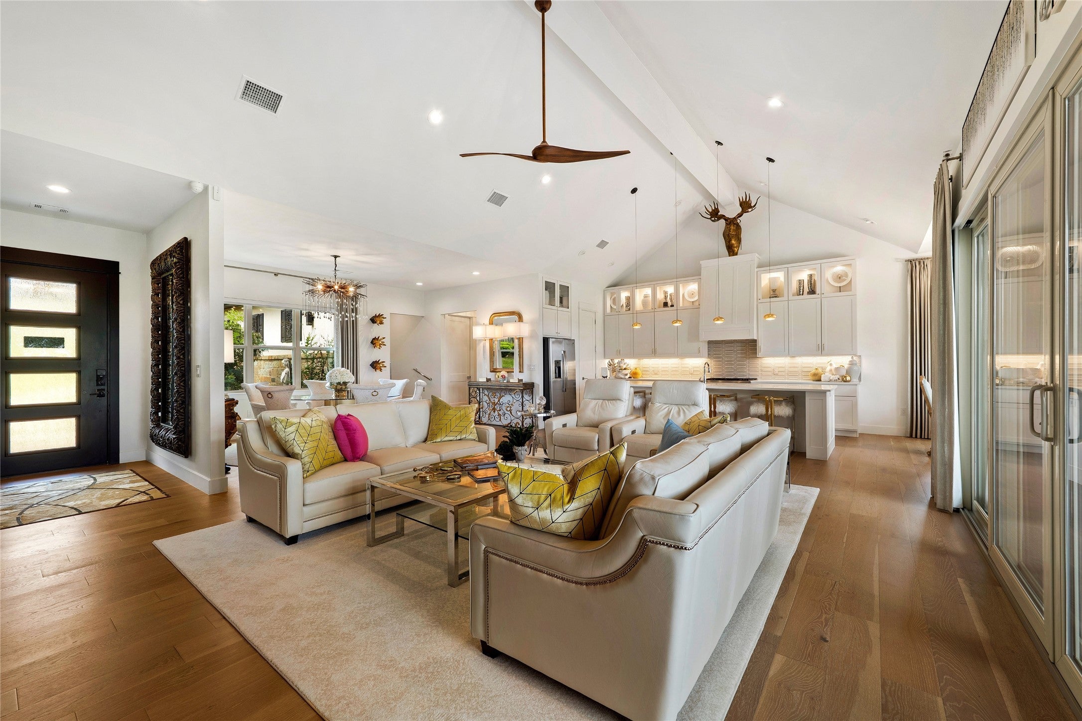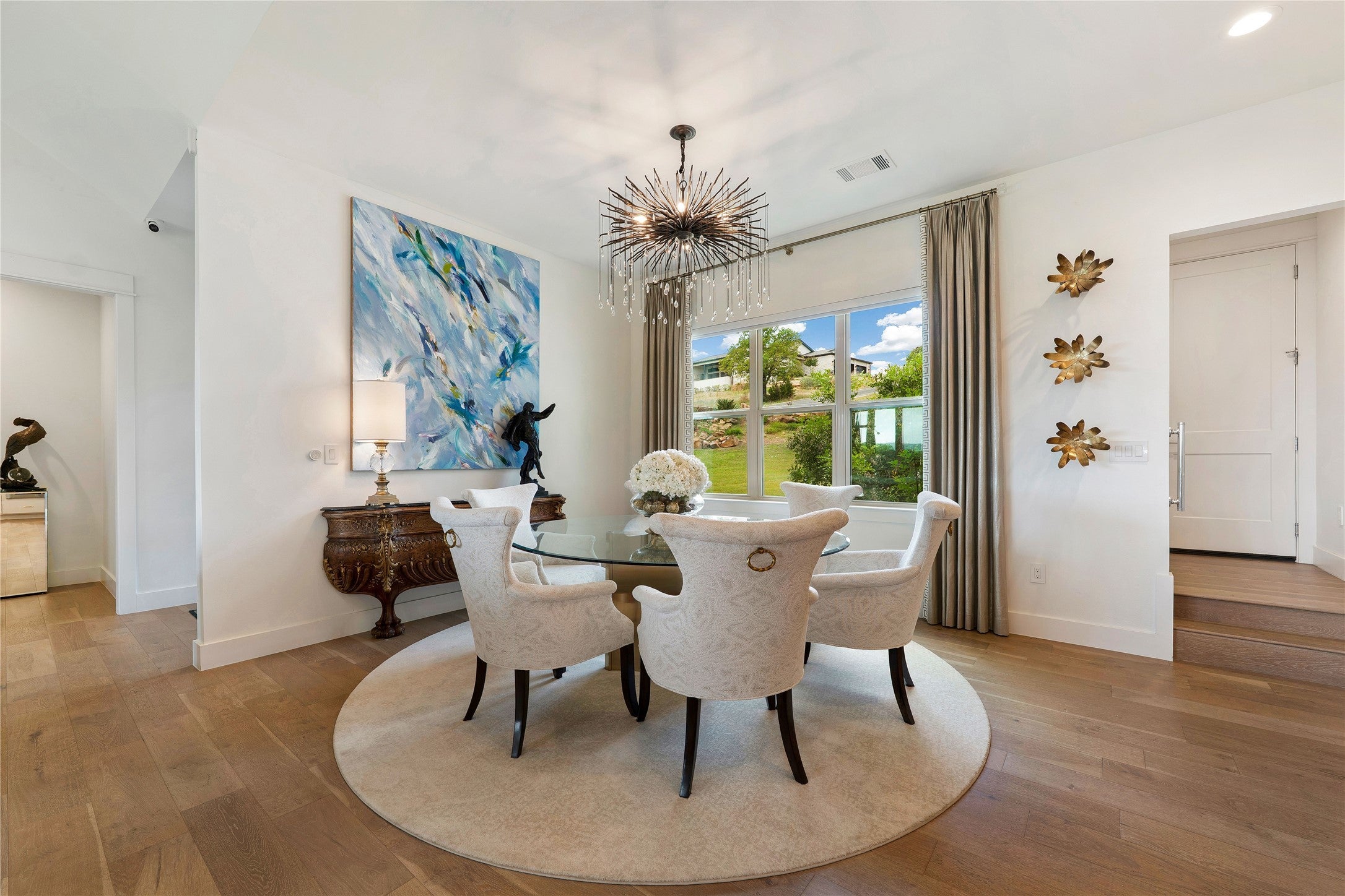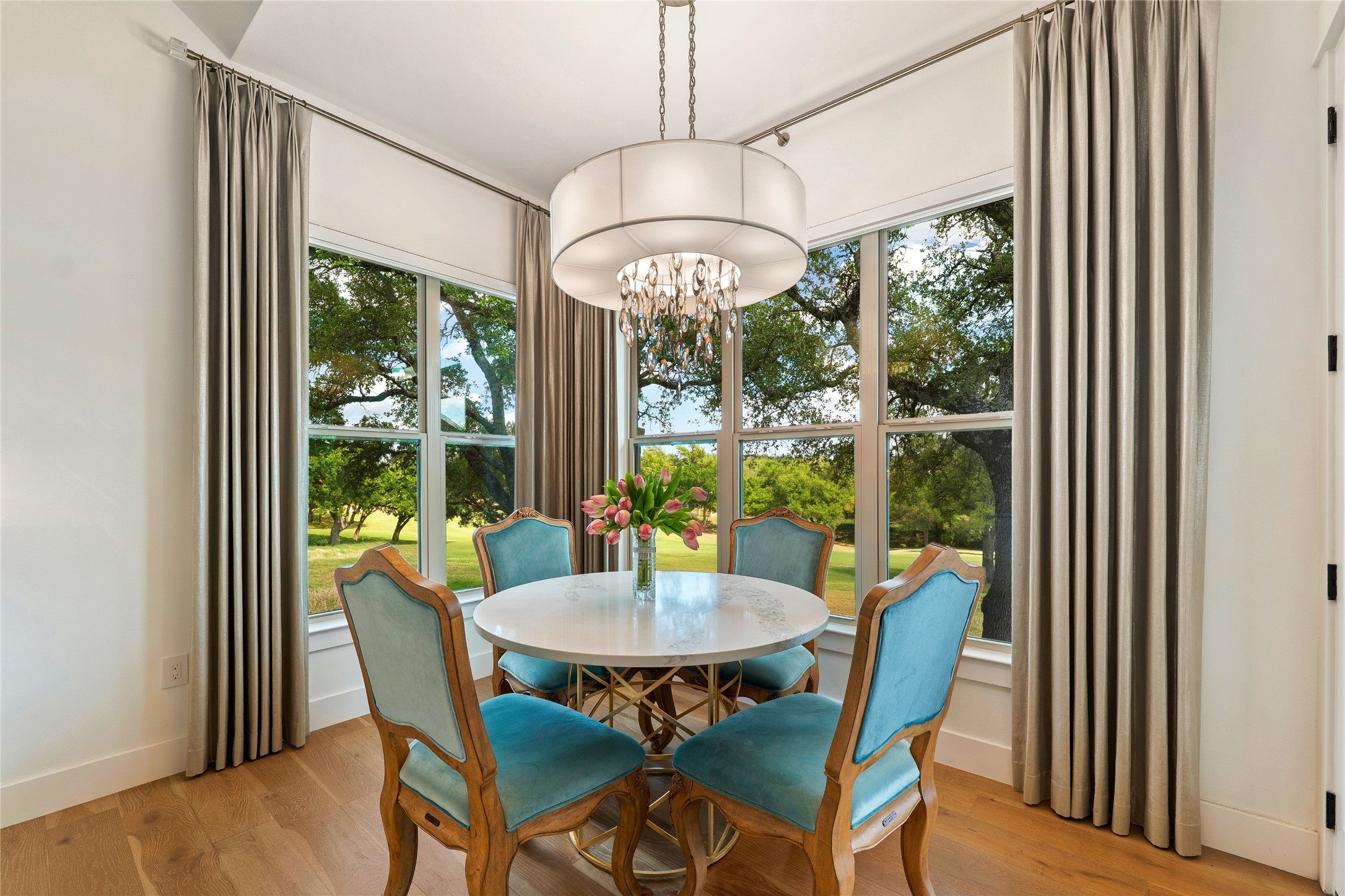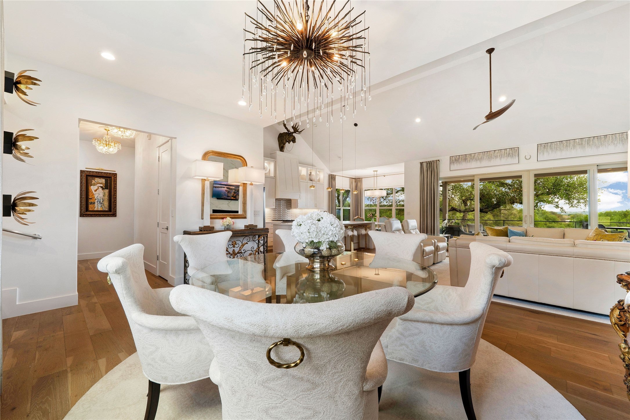 Experience refined golf course living in this stunning 4-bedroom, 3-bath home overlooking the 2nd hole of Ram Rock Golf Course in Horseshoe Bay. With 3,160 square feet of thoughtfully designed space, this home blends elegance, comfort, and functionality. The open-concept living area features a gas fireplace with custom built-ins and seamless access to a covered back patio through sliding doors—perfect for enjoying serene golf course views. The chef’s kitchen is beautifully appointed with quartz countertops, tile backsplash, a 5-burner gas range, and a spacious walk-in pantry, complemented by both a dedicated dining room and eat-in kitchen area. The main-floor primary suite offers a private retreat with French doors leading to the patio, dual walk-in closets with built-ins, and a spa-like bath featuring dual quartz vanities, a soaking tub, and a walk-in shower. A secondary bedroom and full bath on the main level provide ideal space for guests. Upstairs, you’ll find two additional bedrooms, a full bath, and a versatile landing area perfect for a home office, gym, or flex space. Additional highlights include a stone and stucco exterior, full gutters, electric shades, built-in storage throughout, and a well-equipped laundry room with a wine fridge and utility sink. Enjoy the best of indoor-outdoor living in a prime golf course setting.