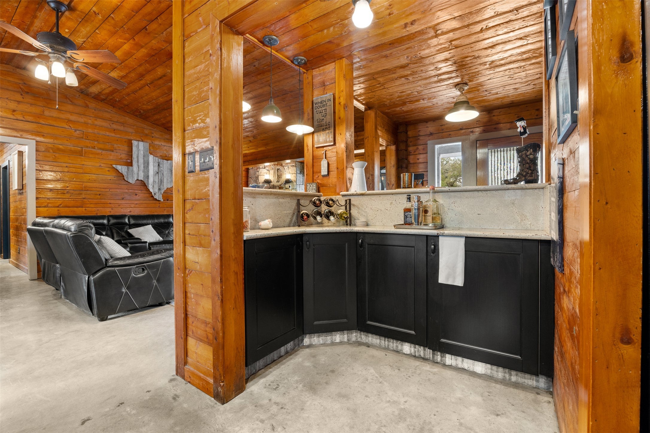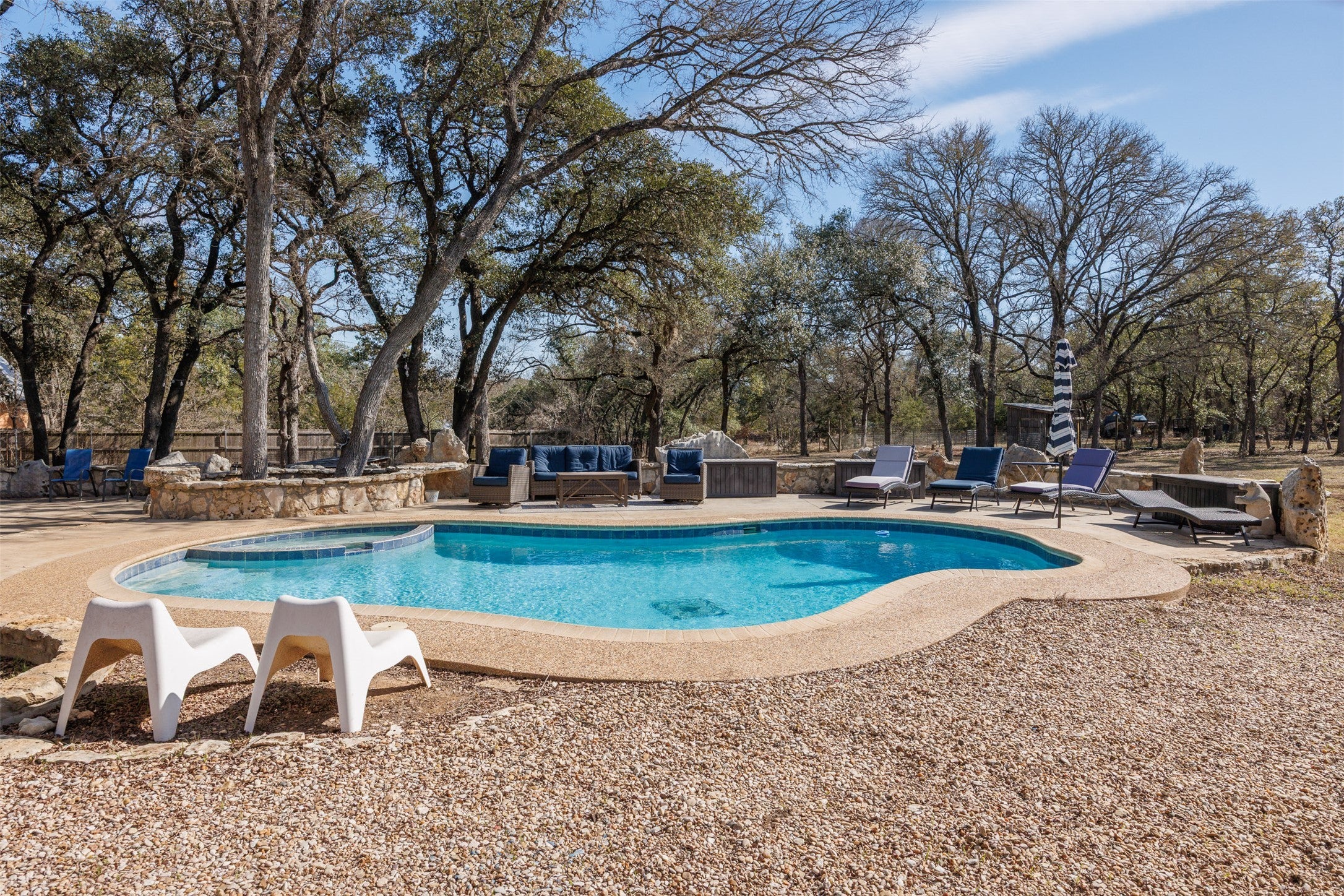 Location, Location, Location! This 2488sqft 6 bed/3bath single-family Log Home residence stands as an attractive property, meticulously maintained in great condition and is complemented by a 1625sqft workshop, ensuring ample accommodation and utility. The culinary space, distinguished by its large kitchen island and stone countertops, offers an inviting environment for both preparation and social interaction. Shaker cabinets complement the aesthetic, while a stone backsplash adds a refined touch, and creates a sophisticated atmosphere. A practical kitchen bar provides additional versatile space for entertaining. The Living Room presents a stately rock fireplace, creating a focal point for comfort and warmth. An impressive vaulted ceiling, adorned with a wood finish, enhances the sense of spaciousness, while a distinctive wood wall contributes to the rustic elegance of the interior. Beyond the interior, an expansive open floor plan provides flexibility throughout the residence. The exterior truly captivates with a private pool and an in-ground hot tub, creating an ideal setting for relaxation. An integrated outdoor living space, complete with a patio and a porch, extends opportunities for leisure all within the secure confines of a fenced backyard. This attractive single-family residence offers an exceptional blend of interiors and expansive outdoor amenities, promising a distinguished living experience within walking distance of downtown Wimberley.