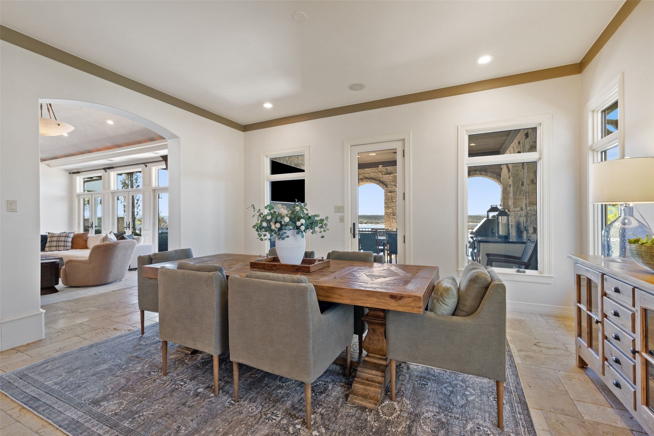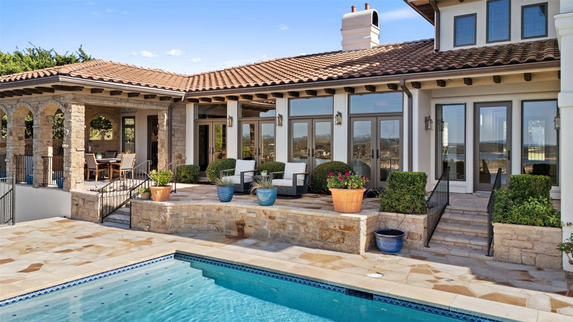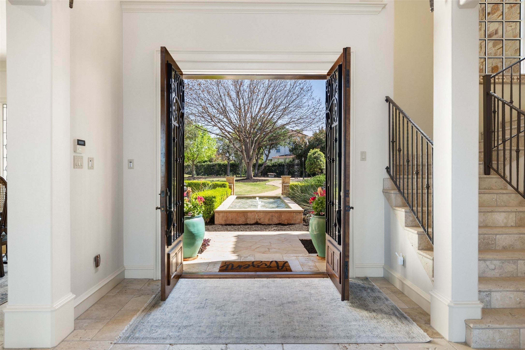 Overlooking sparkling Lake Travis, this Italian-villa-inspired waterfront estate offers one of the most spectacular views in Lakeway and sits high on a rare two-acre homesite within the prestigious, gated community of the Water Front. The home is setback off a quiet cul-de-sac behind a private gated entrance and long driveway, providing an exceptional sense of privacy and scale that’s hard to come by in the coveted Old Lakeway area. Combined with expansive manicured lawns, lush landscaping, and an elegant courtyard with a striking fountain pool, the curb appeal is dramatic and impressive. Custom built by award-winning Vintage Builders, the home showcases outstanding craftsmanship and timeless architectural details including handpainted barrel ceilings, extensive built-in woodwork, and an infinity-edge pool overlooking the deep waters of Lake Travis. The floorplan, spanning approximately 5,200 SF, was thoughtfully designed with beautiful spaces for everyday comfort and sophisticated entertaining. Multiple living and dining areas are found throughout the home, as well as dual master suites on the first floor and two additional guest bedrooms upstairs both with private en suite bathrooms. Plus unique features like the grand foyer, wood-paneled family room, and two-story study add flair and multi-purpose function. With unforgettable views, exquisite style, and resort-style living 5 Water Front Avenue is a one-of-a-kind lakefront estate in the heart of Lakeway, the caliber of which rarely becomes available.