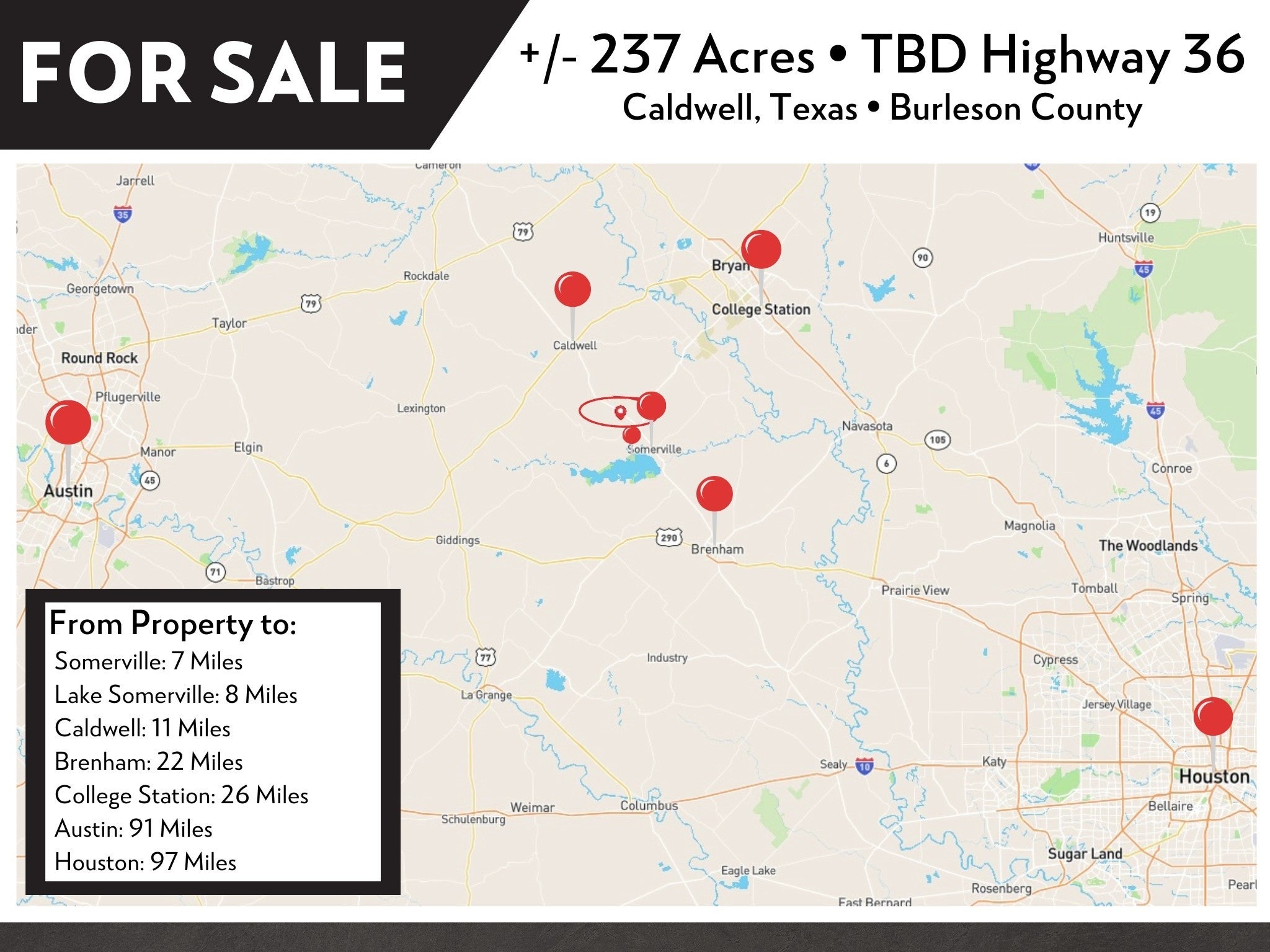 Exceptional 237+/- acre ranch property in Caldwell, TX, offers a rare combination of Ag exemption, no restrictions, and prime location off of State Highway 36 with 500+ ft of road frontage. Potential for both hunting and cattle operations, featuring a nice mix of woods and pasture. Surface water includes 2 ponds and Ryan Creek running through the property. Rolling topography presenting beautiful views of the countryside. An abundance of wildlife frequent the land, including deer & hogs. Native grasses and variety of trees create clusters of hardwoods. Electricity is on-site. Centrally located in the heart of the Texas triangle: 8 miles to Lake Somerville, 22 miles to Brenham, 26 miles to College Station, and 91 miles to Austin. Whether you're looking for a working ranch, recreational retreat, or investment, this Burleson County property is an ideal opportunity.