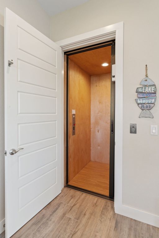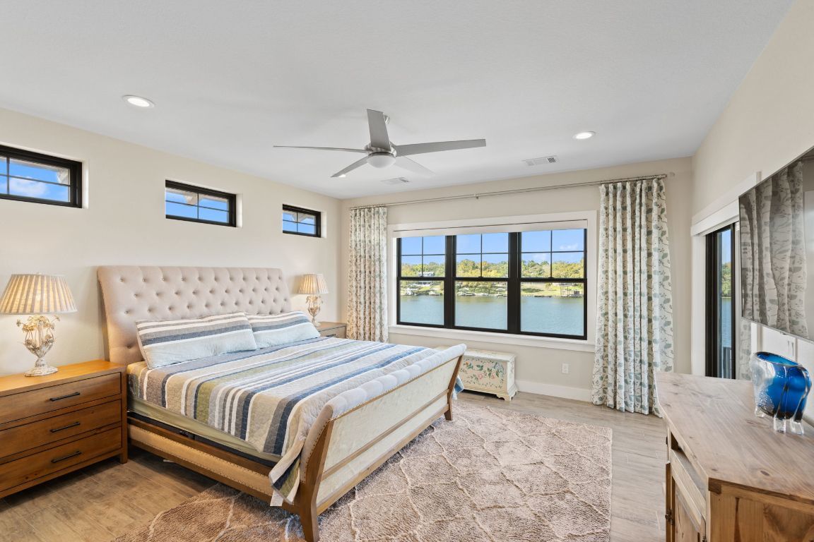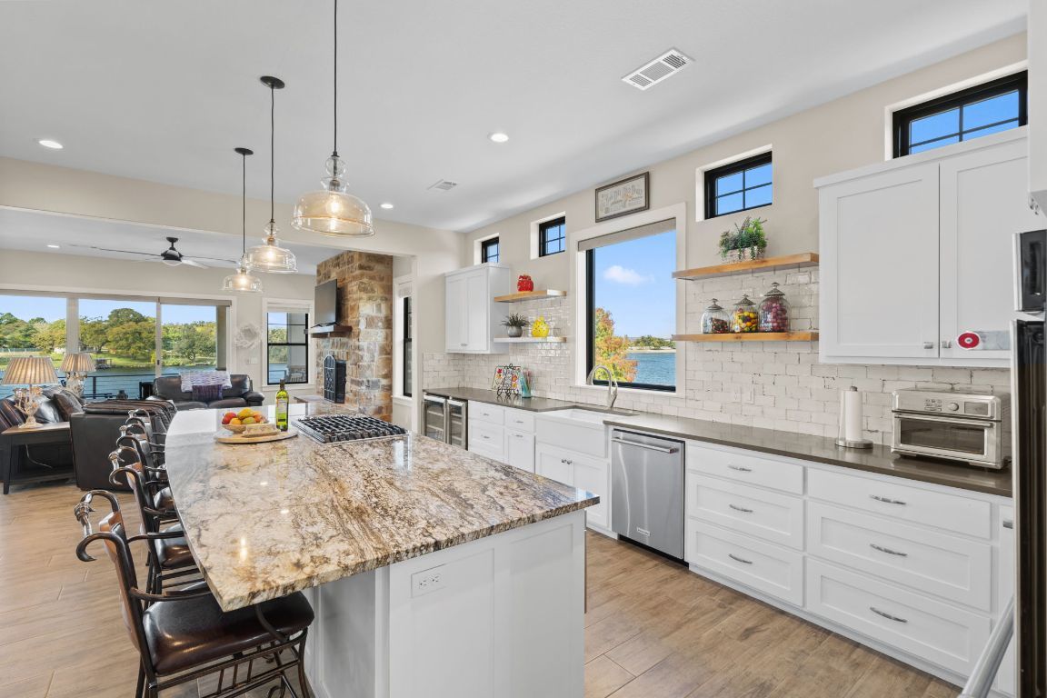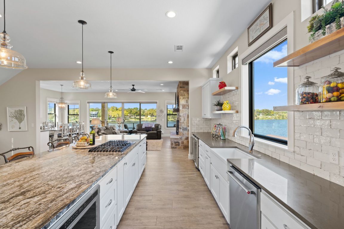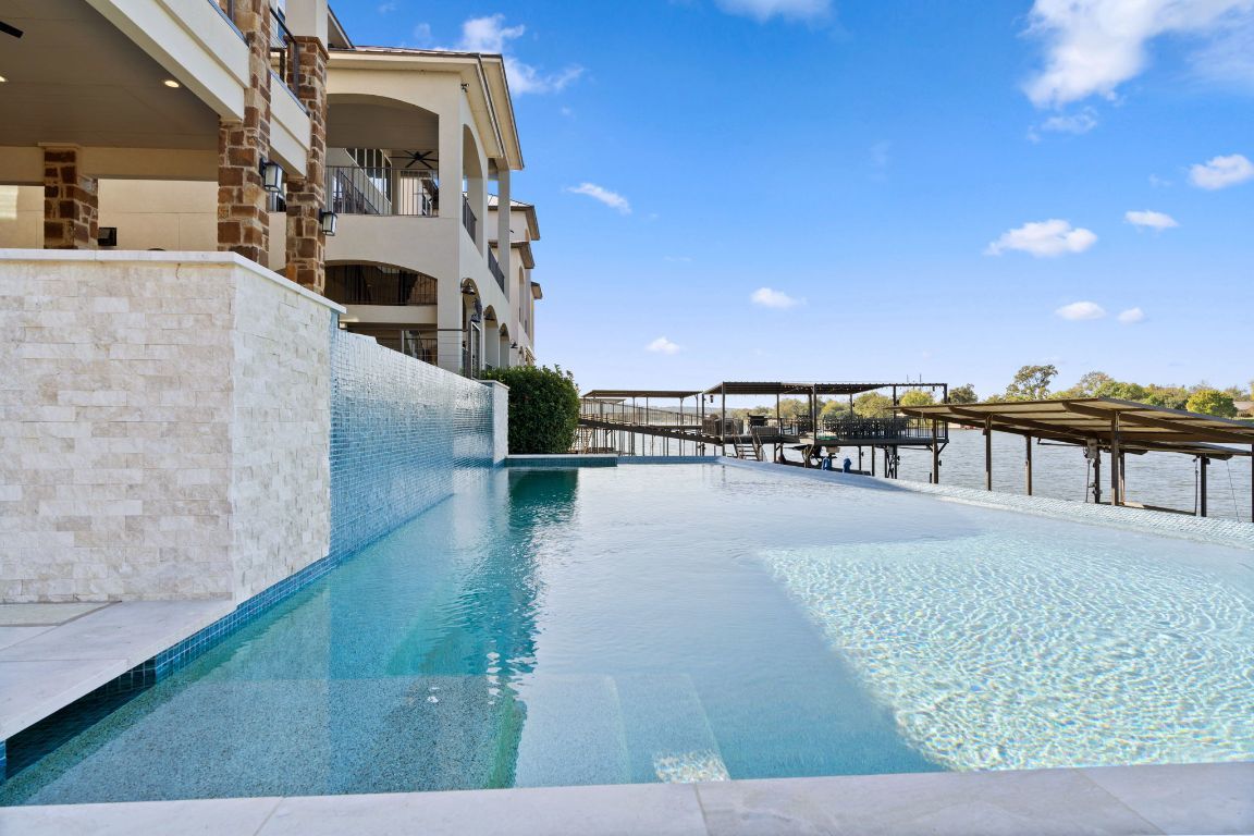 Luxury living in the gated Waterside community on Lake Marble Falls. Built in 2018 but lives like new, this home offers lake views from five decks, 4 bedrooms, 4 baths, a bonus room with wet bar, and a residential elevator connecting all levels. Enjoy a stunning heated two -level pool and hot tub with a spillover waterfall, plus a covered patio with fireplace and outdoor cooking. The private dock includes four hydraulic lifts for water toys. Interior highlights include MetroQuartz and granite surfaces, Lungarno smeared subway tile, a gas cooktop, fireplaces, and tankless water heaters. Move-in ready with furnishings (excluding the dining room chandelier) available for purchase; watercraft—including boat and jet skis—also available separately. Minutes to Marble Falls and Horseshoe Bay—resort-style lake living at its best.