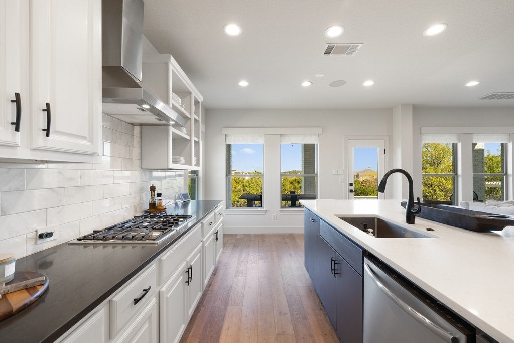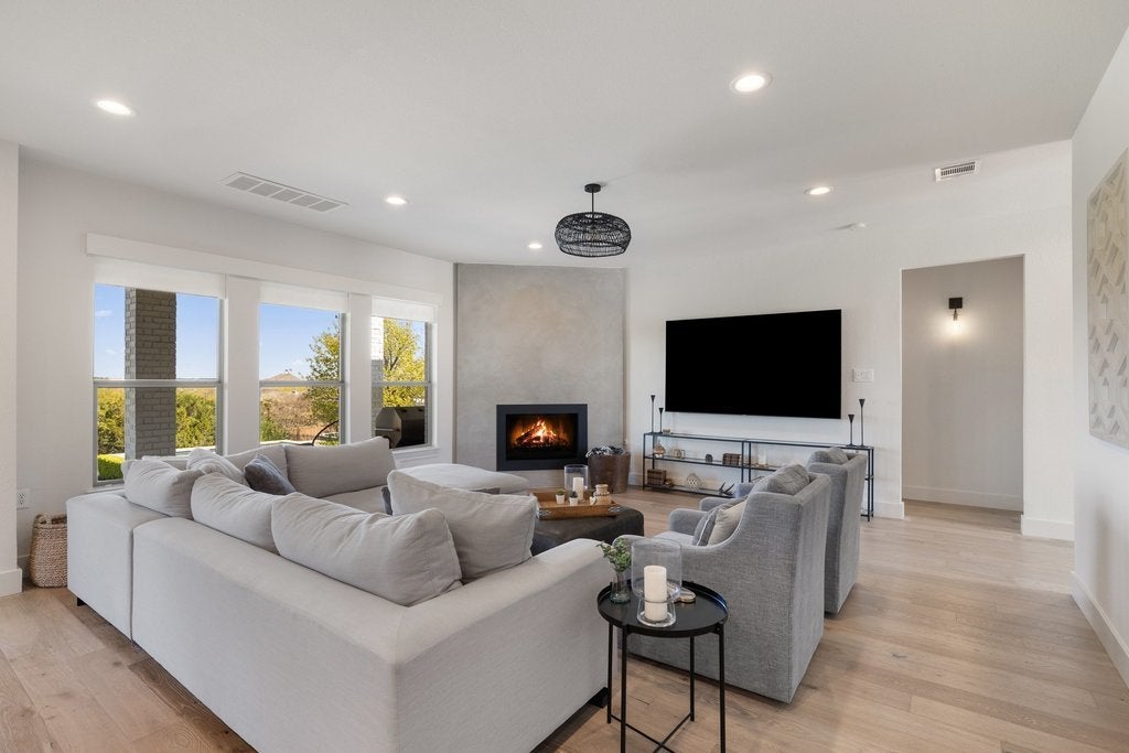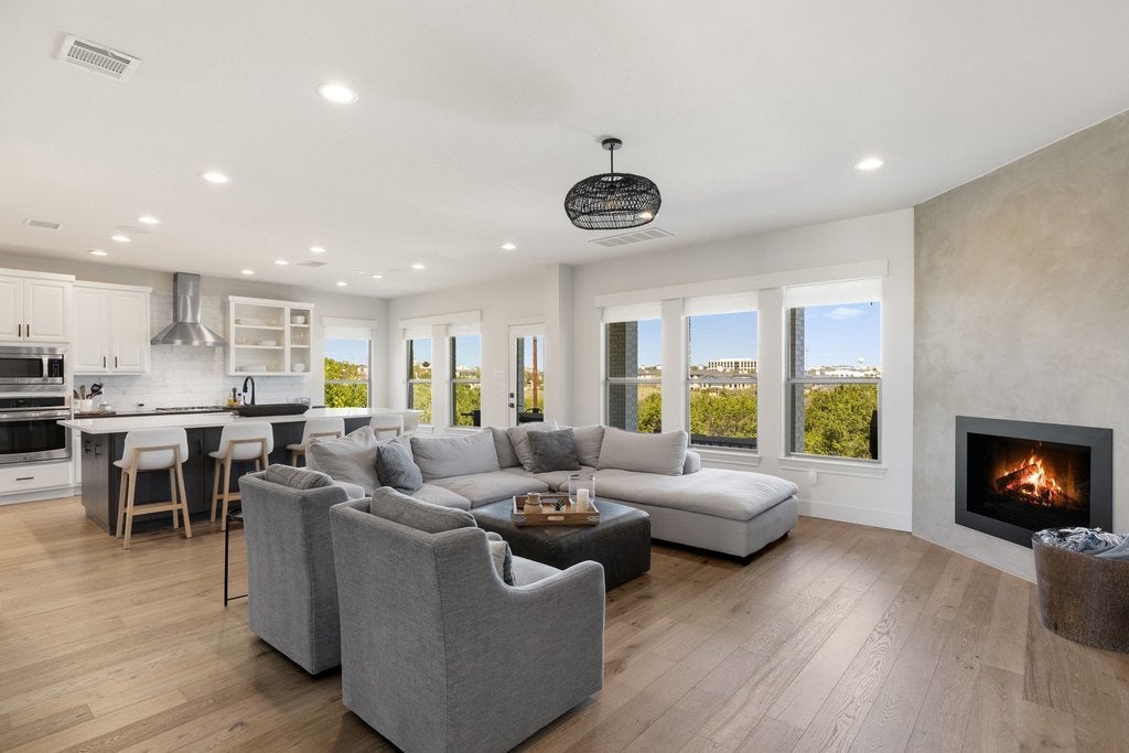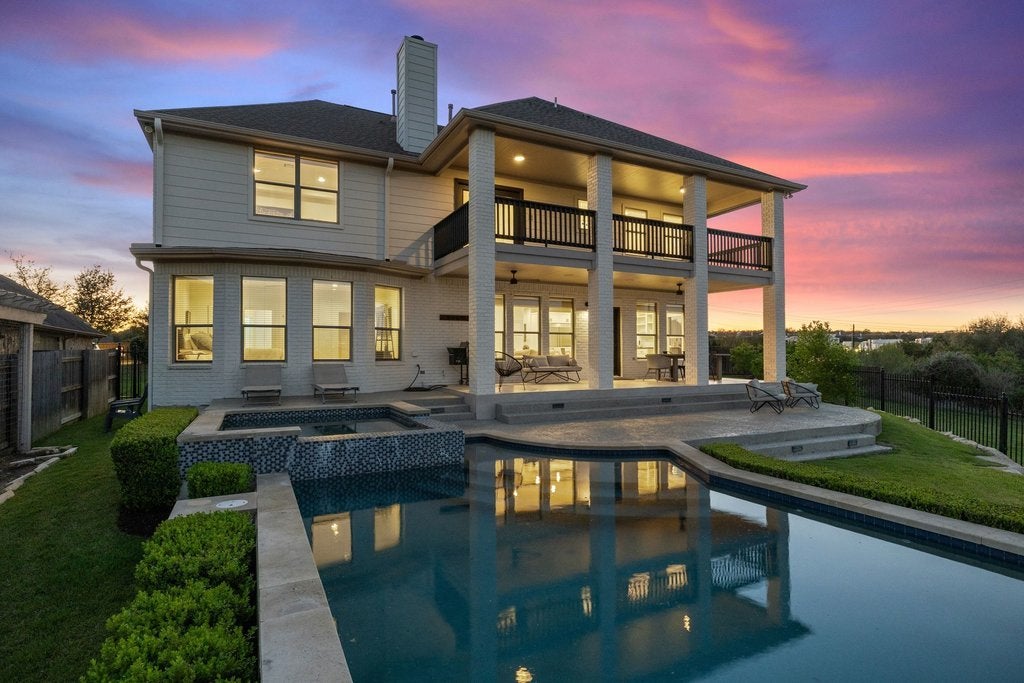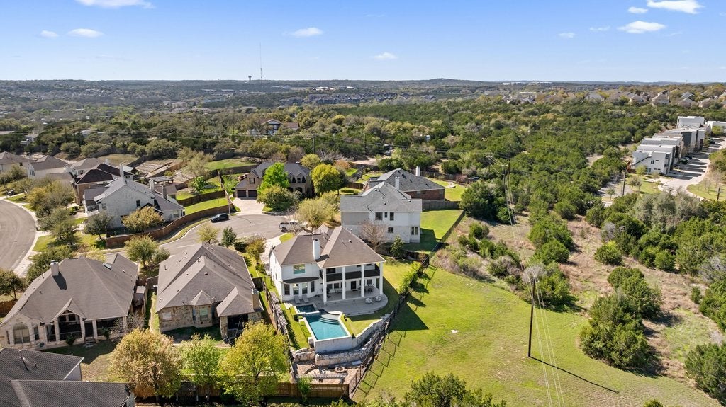 Located in the sought-after Lantana neighborhood just off Southwest Parkway, 5805 Leckrone Cove offers a rare blend of style, privacy, and convenience in a quiet cul-de-sac setting backing to lush greenery. With a striking presence and thoughtful updates throughout, the home welcomes you in with soaring two-story ceilings and an open staircase that immediately sets the tone for the light-filled, modern interior. Inside, the layout is both functional and beautifully designed for everyday living and entertaining. A dedicated dining room with a wine bar creates the perfect space to host, while the living room features expansive windows overlooking the backyard and a sleek cement-front fireplace. The living area flows seamlessly into the kitchen, where an oversized island, built-in gas range, and walk-in pantry make it a true centerpiece of the home. The main level also includes an incredible mudroom and laundry space, a half bath, a secondary bedroom, and a spacious primary suite with serene backyard views, double vanities, a walk-in shower, and a generous walk-in closet. Upstairs, you’ll find three additional bedrooms including one with an en suite bathroom, another full hall bath, a large secondary living area, and a private balcony that adds an extra layer of flexibility and charm. The backyard is nothing short of a showstopper. Designed for both relaxation and entertaining, it features a massive patio, a stunning pool that appears to spill into the horizon, a spa, and a cozy fireplace area all surrounded by a large grassy yard that offers plenty of room to play or unwind. Backing to peaceful greenery, the setting feels incredibly private while still being in the heart of it all. Residents enjoy close proximity to local favorites like the Moviehouse & Eatery and a variety of nearby restaurants, along with access to top-rated schools. With easy connectivity into downtown Austin or out toward the Hill Country, this location truly offers the best of both worlds.