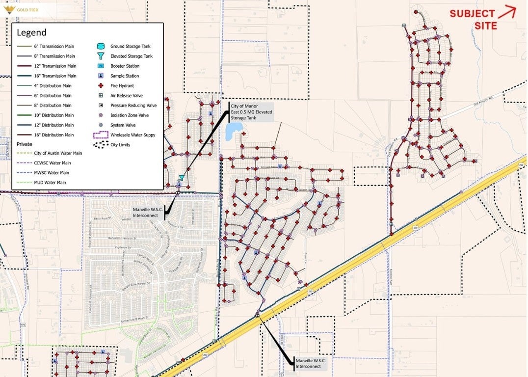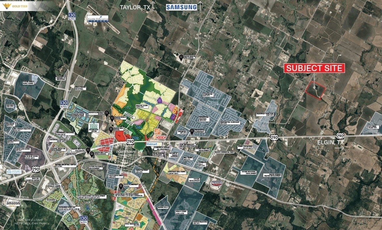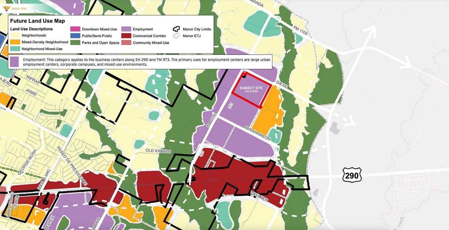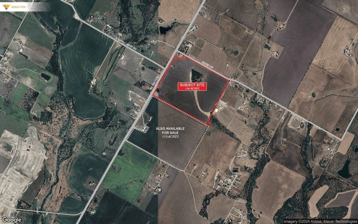 Gold Tier Real Estate is proud to present 104 acres for sale in booming Manor, Texas. The site is located only 1 mile from Highway 290, presenting an excellent opportunity for residential or industrial development. The two frontage roads, FM Rd 1100 and Giese Ln, are both planned to be major arterial roads in the City of Manor. The property lies within Manor city limits and is currently zoned for agricultural use, requiring a rezoning for development. The City of Manor water and wastewater lines are located closer to Highway 290. However, Aqua water has a 4” and 2” line along the frontage of the property. An additional 113-acre adjacent property is also available, allowing for a combined 217-acre site. This larger assembly could support the establishment of a Municipal Utility District (MUD) to offset off-site utility costs or accommodate an on-site wastewater treatment facility. **The broker makes no warranties regarding the property details provided. Prospective purchasers are advised to conduct independent due diligence to verify all information.**