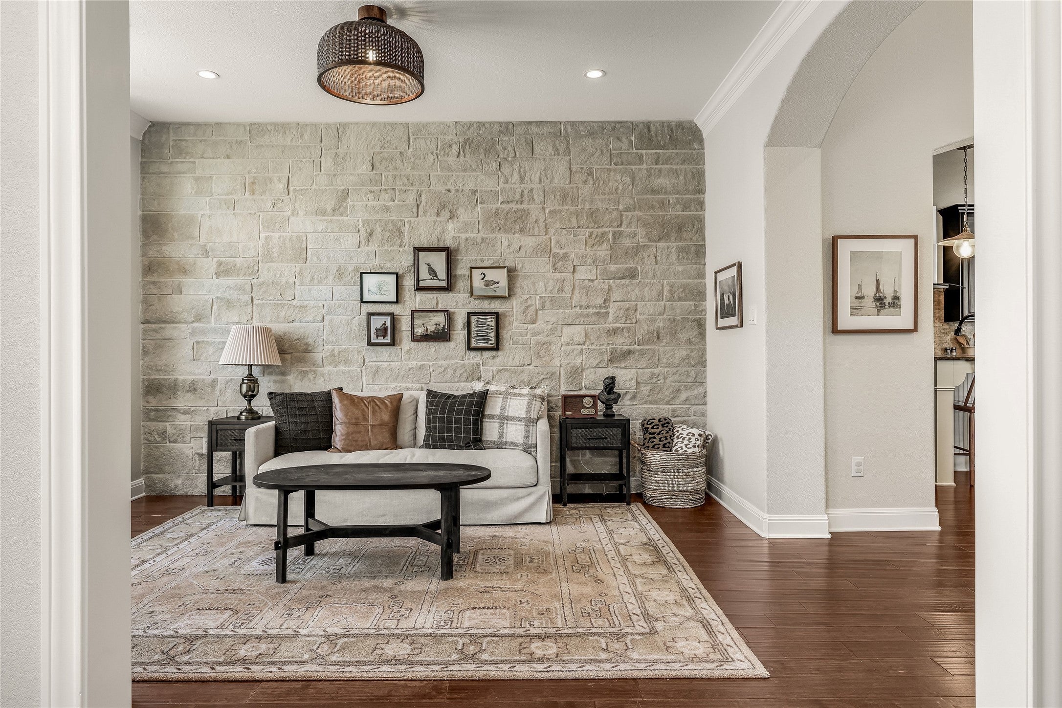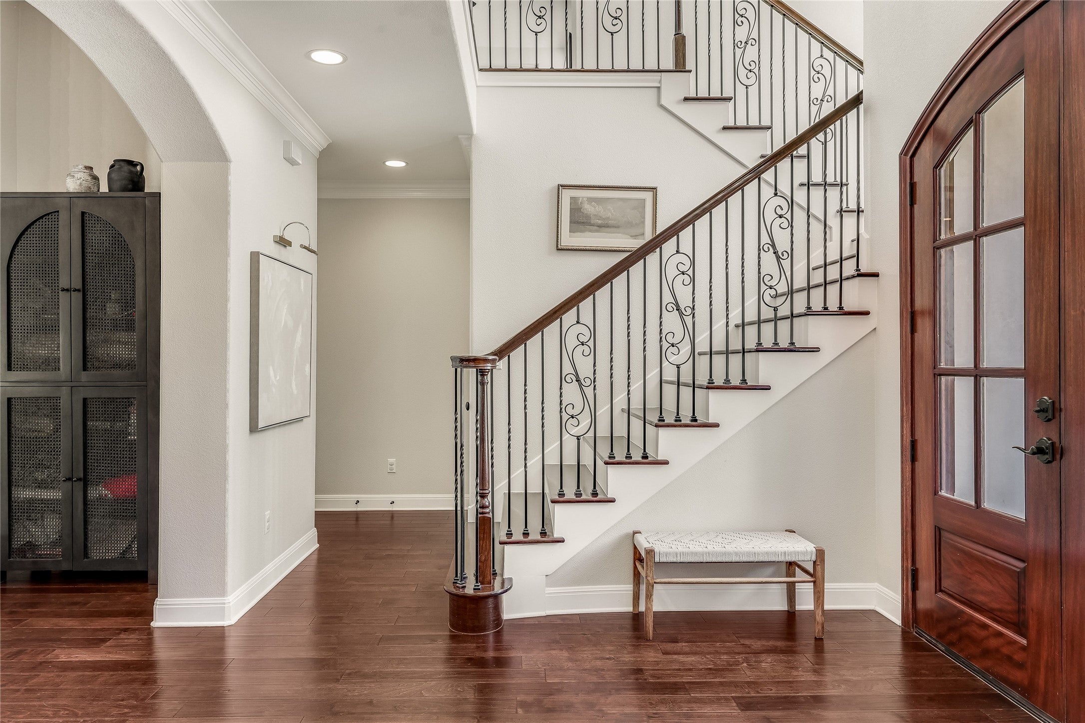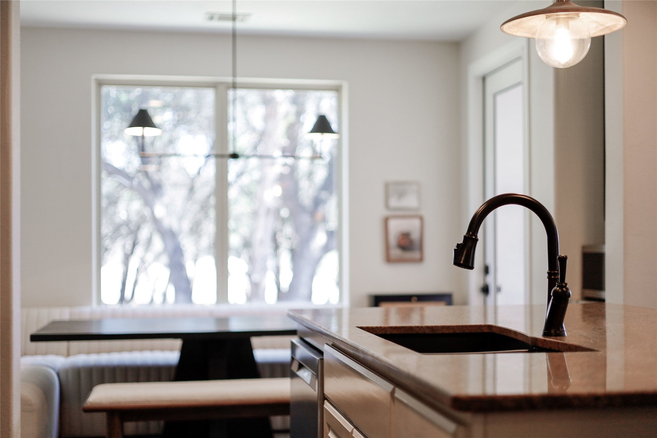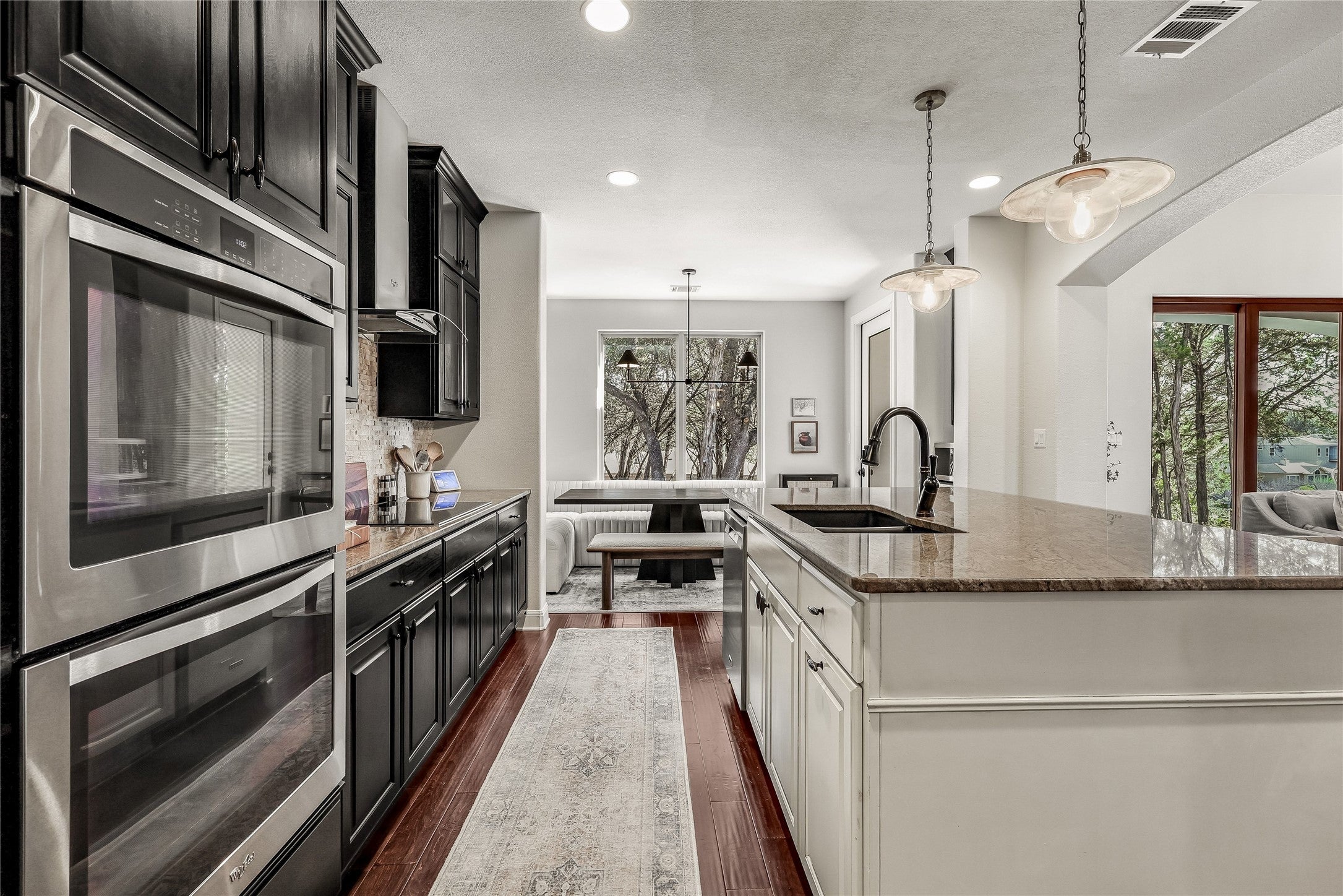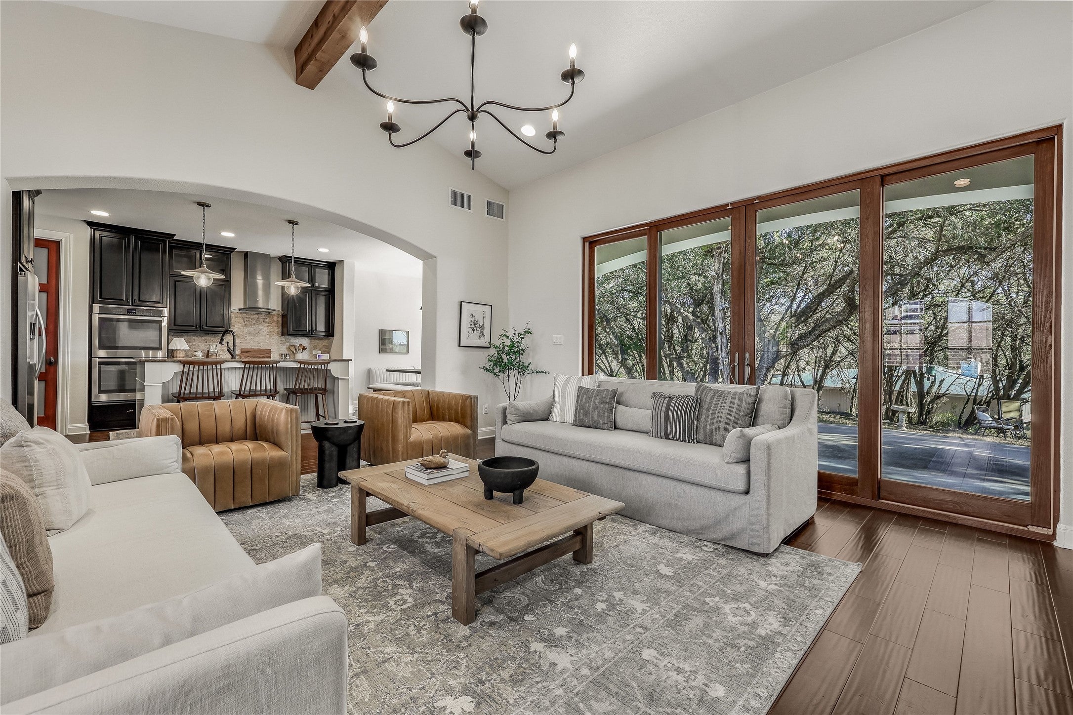 An Amazing Home Worth Seeing! Featuring timeless Hill Country architecture and impeccable craftsmanship, this corner-lot custom residence is a serene oasis, offering resort-style tranquility with clean lines, elegant proportions, and a thoughtfully curated floor plan designed for memorable celebrations, private escape, and effortless luxury. A beautiful arched doorway and welcoming foyer set the tone for the design-focused character found throughout. An open ceiling design with a substantial wood beam anchors the main living space, and large sliding glass doors open to the outdoor living area for easy indoor–outdoor flow. The backyard and patio frame a view of the Texas Hill Country! At the heart of the home is the gourmet kitchen with an oversized island, soft-close drawers, glass-front upper cabinets, abundant storage, and a dedicated coffee bar. Open to the living and dining areas, the layout supports everyday routines and big gatherings! The main living space also features a striking stone fireplace surround, prepped for completion with firebox, flue, rain cap, and insulation still to be installed. The primary suite is located on the first floor and provides a private retreat with generous space, an oversized ensuite bath with a soaking tub, and a generous walk-in closet. Also on the main level, a flex room offers versatility for a home office, gym, nursery, or additional living space. A custom wood staircase and ornate handrail complement the home’s solid design. Heading upstairs, an open living/versatile area, currently a den area, could be adapted to fit your needs! Down the hall, two secondary bedrooms share a Jack and Jill bathroom, ideal for family or guests! Enjoy the Lago Vista lifestyle with access to nine waterfront parks, four boat ramps, golf course, tennis & pickleball courts, playgrounds, a fishing well, & a general aviation airport—lake life, recreation, & convenience together in one exceptional community.