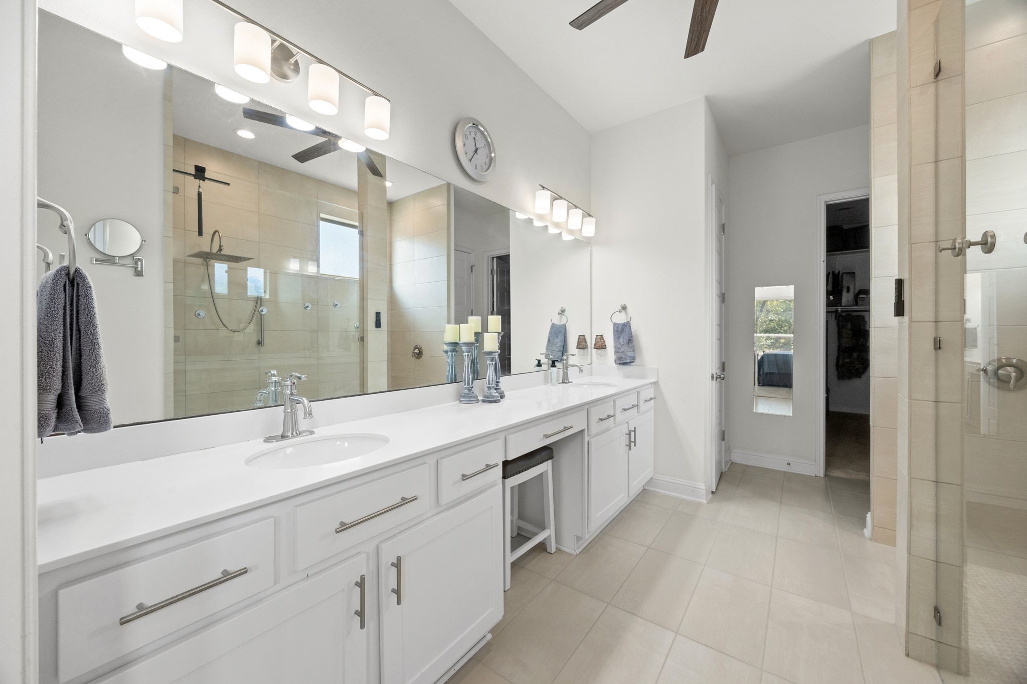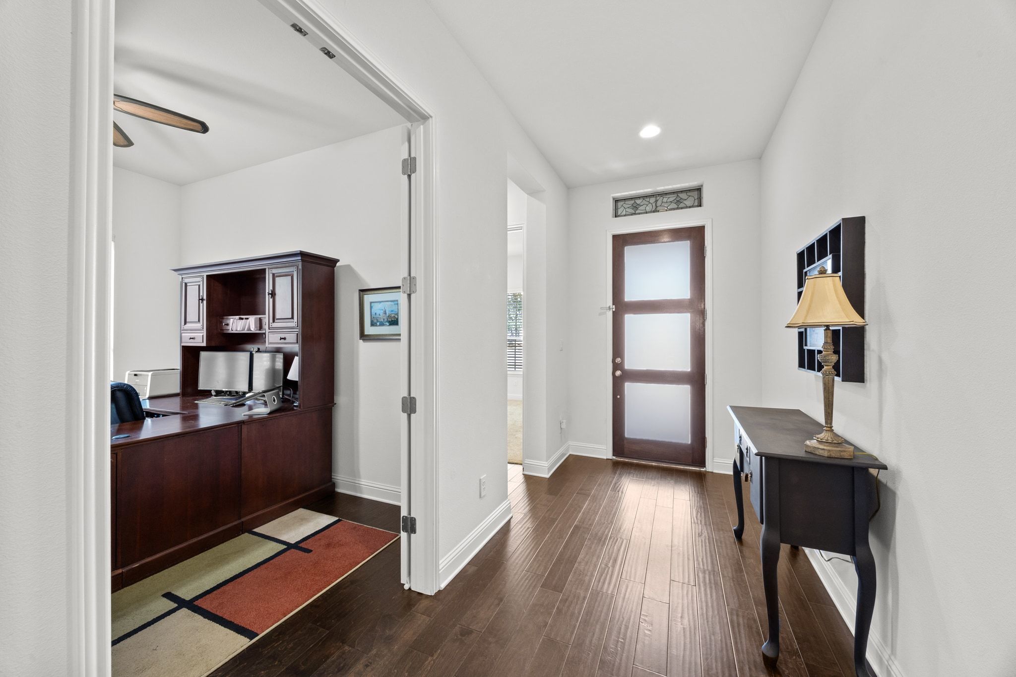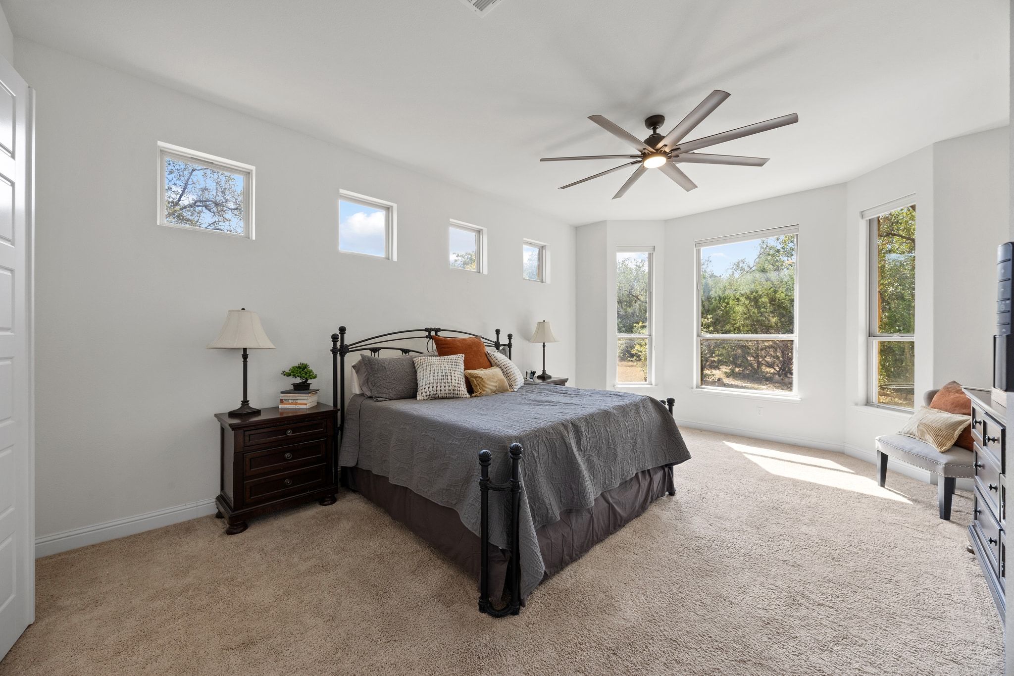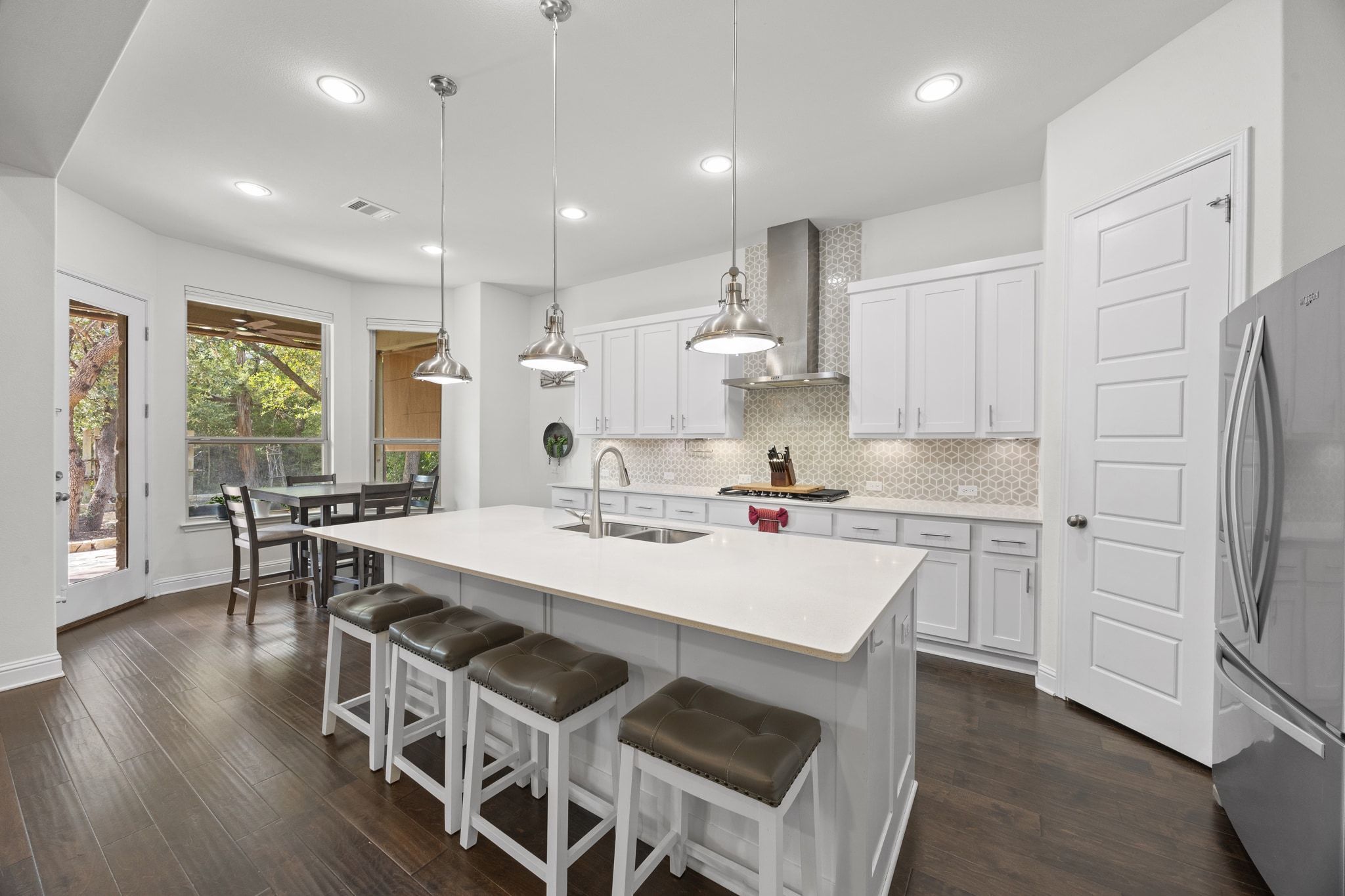 Located in the heart of Dripping Springs, this pristine and quality built 2 story home boasts plenty of upgrades and amenities! Beginning with the interior of the home, the open layout with engineered hardwood throughout the first floor and soaring high ceilings make this home feel massive, yet warm. The kitchen is equipped with stainless steel appliances, white quartz style countertops, gorgeous white cabinetry with plenty of storage, and tastefully matching backsplash. The primary bedroom is located downstairs with bay windows, a massive single pane shower, rainfall style showerhead, and a deep walk-in closet. The additional downstairs bedroom and full bathroom is great for guests and extended family, while the spacious office is perfect for working from home. The sliding glass door, transom windows, and bay windows downstairs allow tons of natural light into the common areas of the home. The upstairs of the home makes for a great retreat for the family with its large game room, separate media room wired for surround sound, and the remaining 2 bedrooms and bathroom. Additional features include oversized ceiling fans, frosted glass front door providing natural light into the foyer, modern style gas fireplace, elegantly curved staircase, 3 car garage, and a deep driveway. But what really makes this home shine is the perfectly level 3/4 acre lot! Perfect for outdoor activities, enjoy the tranquility and quietness of country living while you watch the sunset from the patio.