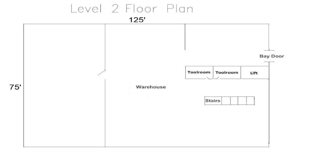Total of 9,375 SQ FT on the second floor (125’ x 75’), this non-climatized warehouse offers flexible configuration options and potential for conversion to central air conditioning. The space features a roll-up door on the second floor for convenient loading and unloading, with 11’ interior clearance at the center support beams and 9’ clearance along the perimeter, suitable for light industrial or storage use. The open floor plan allows for the warehouse to be easily divided into multiple sections or units, making it ideal for shared workspaces, storage units, or multiple retail tenant use. Partition walls could be added to create: Private workspaces or offices, Designated storage zones, Separate commercial suites. Included is a 3,750 SQ FT area of abandoned living quarters which may be repurposed into residential accommodations, office space, or demolished to expand the warehouse footprint. The building is equipped with a 3-phase electrical system, supporting heavy-duty equipment or industrial use.