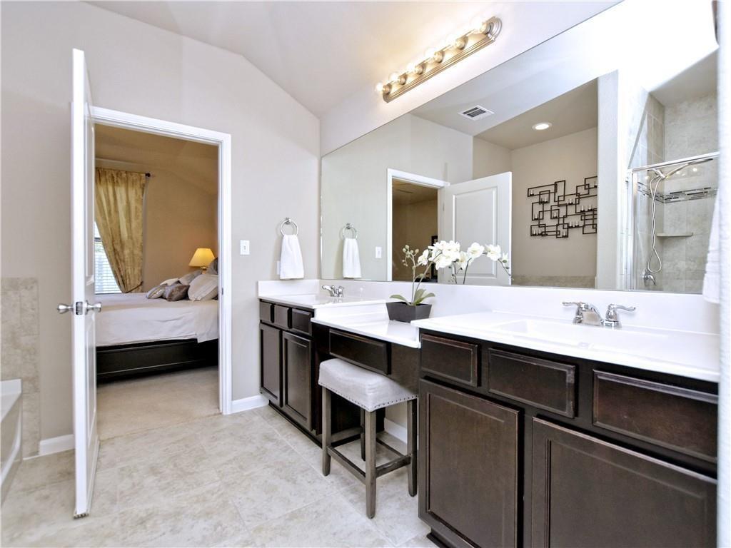Adorable one-story on treed lot with cozy covered front porch. Open floor plan with hardwoods that stretch throughout. Lots of natural light in every room. Plenty of cabinets, SS appliances + gas cooktop, an island with breakfast bar and granite counters. The primary suite has high ceilings, and huge walk in closet. The en suite bath has luxurious soaking tub, double vanities & separate shower. The secondary bedrooms are large and share a bath. The extended patio with pergola has plenty of room for dining out while overlooking your wooded greenbelt view, with no neighbors behind! Leander ISD!