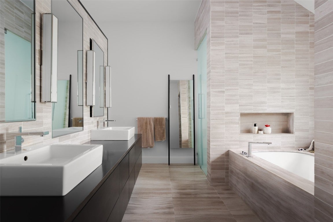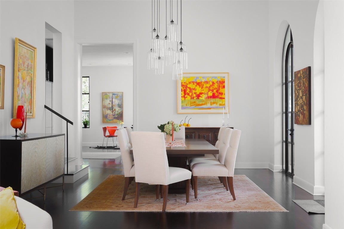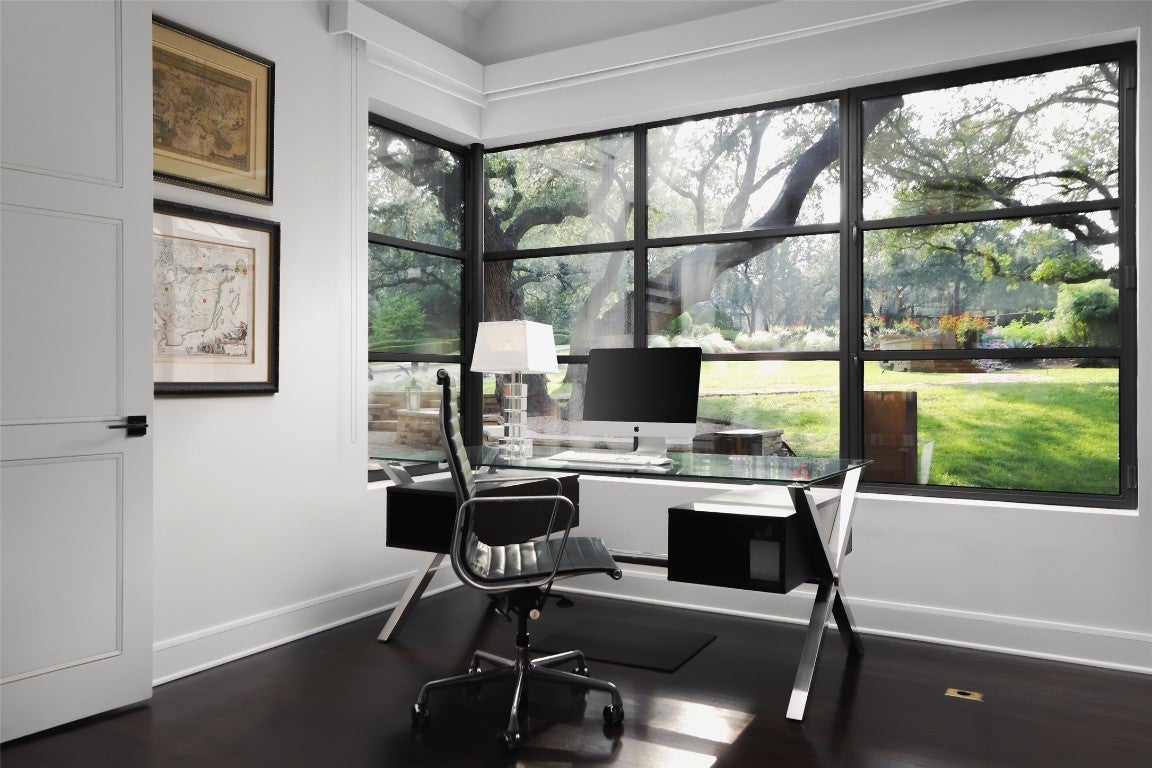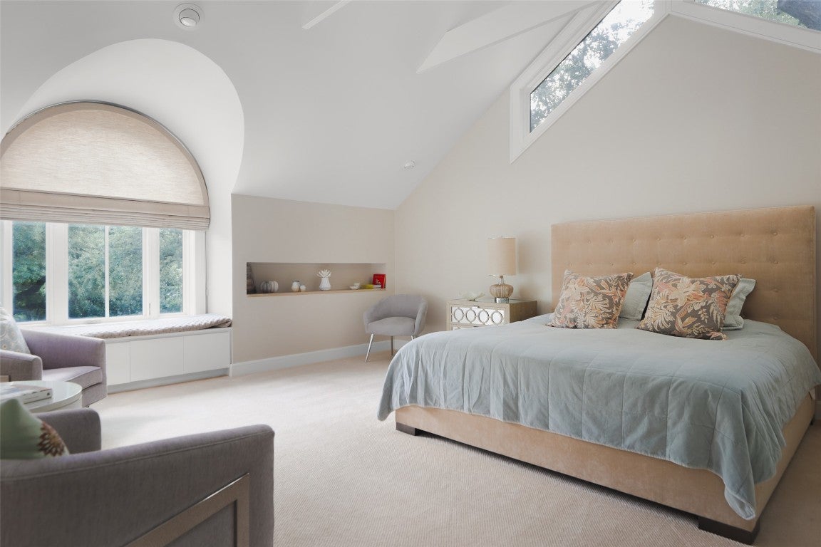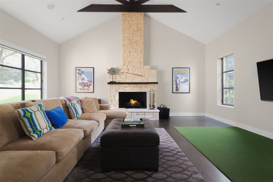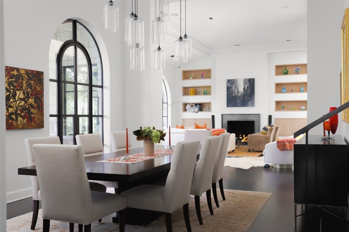 Welcome to 5301 Maryanna Drive, a stunning Westlake retreat perched above Lake Austin with sweeping Hill Country and water views. Nestled in one of Austin’s most coveted gated neighborhoods and within Eanes ISD, this home offers prestige, privacy, and unbeatable proximity to Austin Country Club, the lake, downtown, and more. Inside, soaring ceilings, rich wood floors, and a dramatic wall of arched steel-frame doors create a light-filled, luxurious ambiance. The expansive living and dining space is anchored by a sleek fireplace and flanked by custom built-ins, soft neutral tones, and curated lighting. The kitchen pairs minimalist cabinetry with a full-height wine fridge, paneled appliances, and a seamless flow into the family room framed by floor-to-ceiling glass and panoramic pool and lake views. Tucked just off the main living space, the serene primary suite features steel-framed windows and private patio access. The spa-like bath boasts warm-toned tile, dual vanities, vessel sinks, a soaking tub, and a frosted-glass walk-in shower, plus two large walk-in closets. Additional highlights include a corner office surrounded by oversized windows and a vaulted bonus room with limestone fireplace. Upstairs, a dramatic skylight stretches across the corridor, linking two wings. One side features three guest bedrooms with en-suite baths and a private balcony overlooking the backyard and Lake Austin. The opposite wing offers a private guest suite with full bath and a flexible light-filled studio, yoga room, or gym. Two 2-car garages include a car lover’s dream: epoxy floors and red cabinetry in a pristine showroom-like setting. Out back, an entertainer’s paradise awaits with a spacious covered patio, outdoor kitchen, putting green, and infinity-edge pool that melts into the treetops. Backing to a greenbelt and scenic trail, this property is a rare blend of luxury, nature, and convenience just minutes from the heart of Austin.