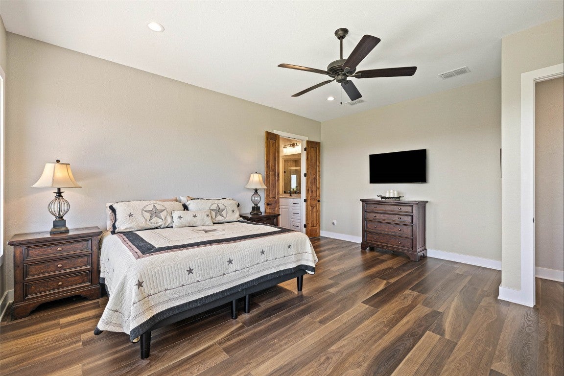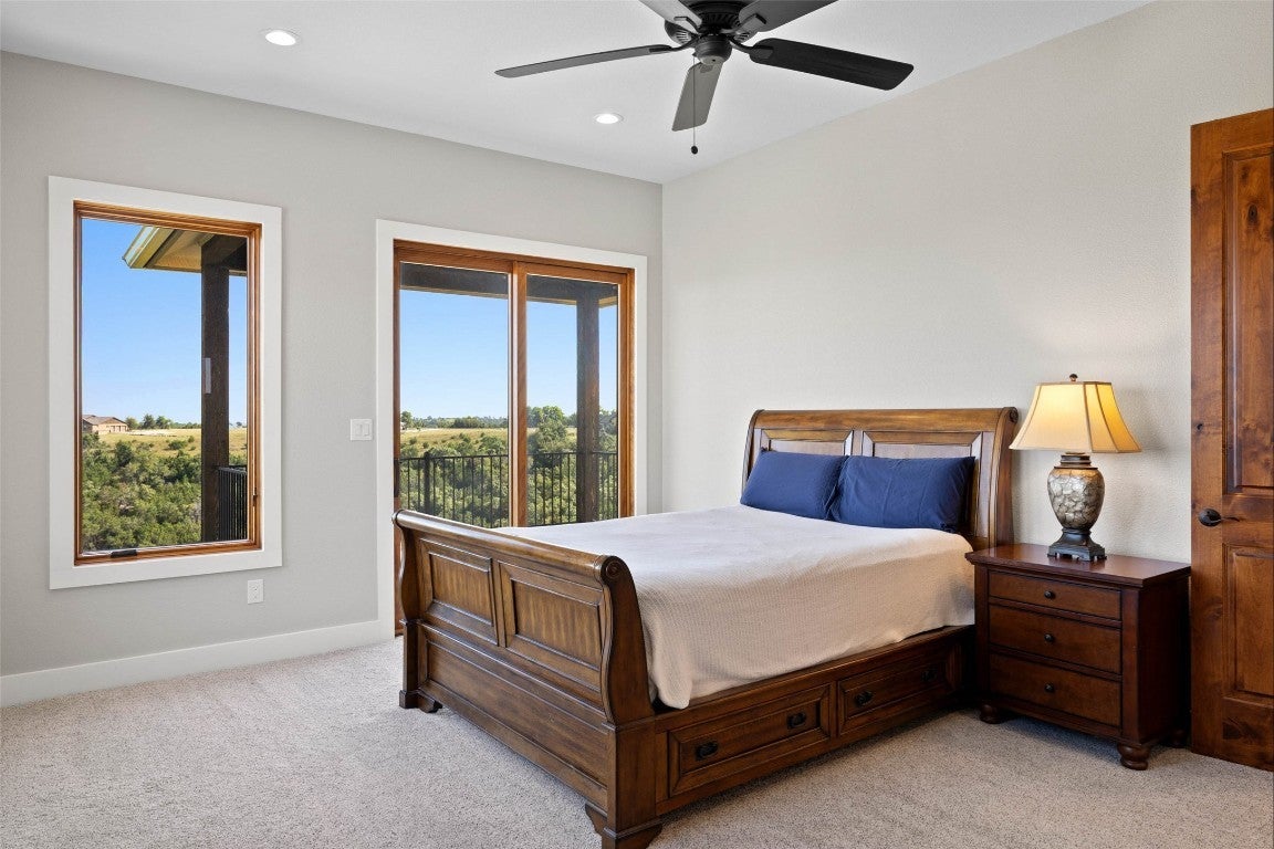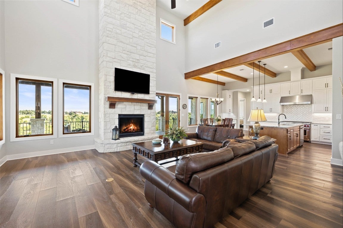 Experience refined Hill Country living on this private 5.23acre retreat in the prestigious Ranches of Brushy Top. Perfectly positioned on a scenic hillside, this recently constructed 3,436 square foot residence blends elegant design with the natural beauty of its surroundings. Step inside to soaring ceilings, luminous oversized windows, and long-range views that fill every room with light. The chef’s kitchen is a true centerpiece, boasting beamed ceilings, built-in appliances, a generous walk-in pantry, and an expansive wet bar. The spacious living room, anchored by a striking stone fireplace, offers a warm yet sophisticated setting for gathering. The thoughtful floorplan includes dual primary suites—one on each level—each with luxurious baths, walk-in closets, and private retreats, including an upper-level suite with a covered deck. Impeccable hardwood floors flow throughout the main level, complemented by a home office, large laundry room, and seamless access to outdoor living spaces. A wraparound porch and covered entertaining area invite you to savor the serene Hill Country backdrop. Additional amenities include a 3-car garage, an extra 2-bay garage/workshop, and a 30K rainwater collection system. Beyond the home, the Ranches of Brushy Top community offers an unmatched lifestyle within its 2,000 acre high-fenced preserve. Residents enjoy a gated entrance, two stocked lakes for fishing, swimming, and kayaking, plus miles of scenic trails for horseback riding, hiking, or UTV adventures. The ranch is home to native and exotic wildlife including elk, blackbuck, sika, and oryx, offering a one-of-a-kind living environment. With 1-D-1 Ag exemption, no city taxes, and low association fees, this property pairs luxury with practicality. Ideally located just minutes from historic downtown Blanco and the Blanco River, and an easy one-hour drive to both Austin and San Antonio, this is Hill Country living at its finest.