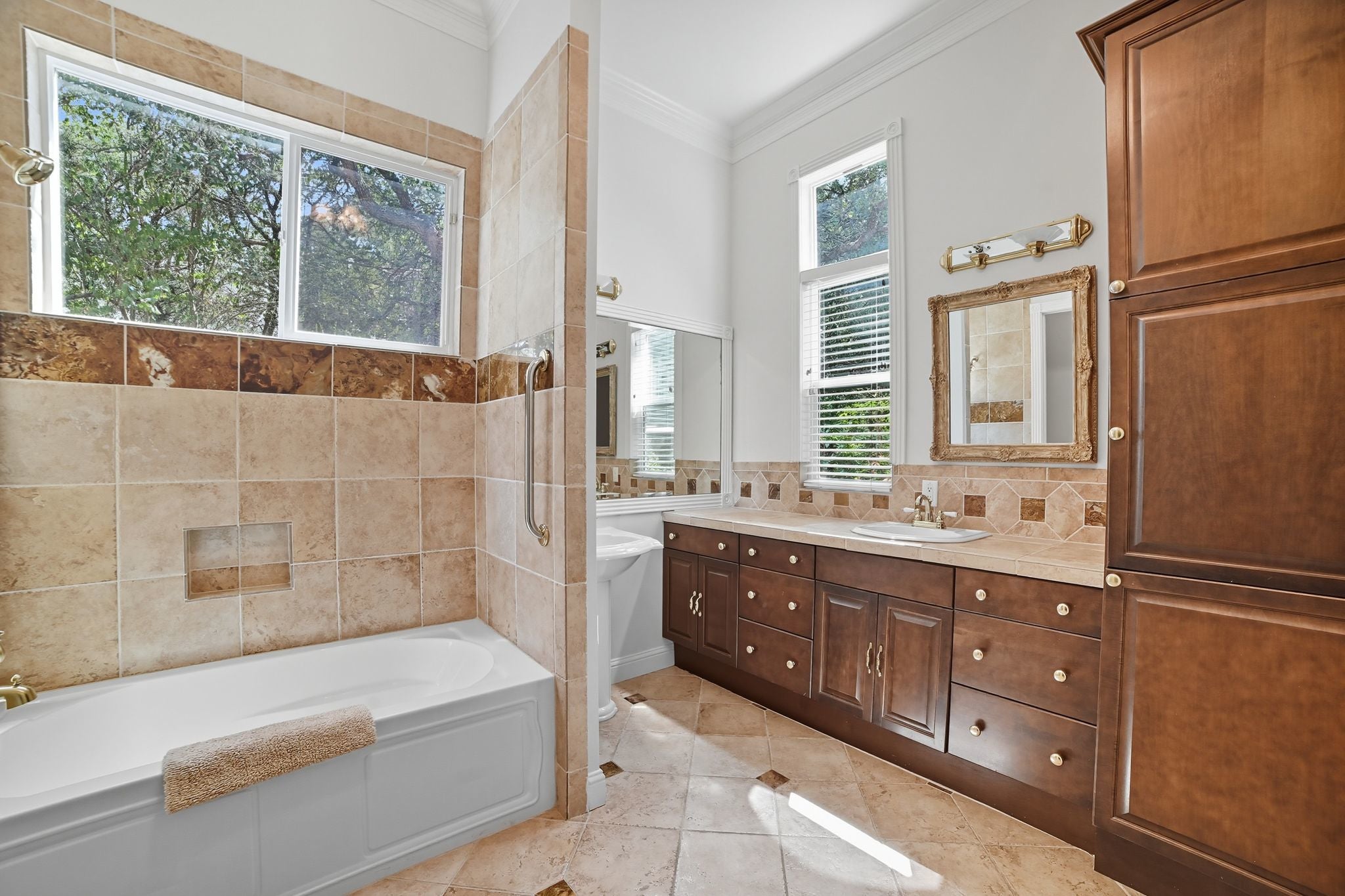In the heart of Westlake, this residence balances classic character with modern comforts across 5,028 square feet. Set on a generous 1.32-acre lot, the home welcomes with historic front doors, originally from the Driscoll Hotel, instantly setting a tone of distinction. Inside, cased doorways and a sweeping staircase frame the central living areas, while a private study with ornate fireplace provides a refined retreat. The kitchen blends function and style with granite countertops, stainless appliances, a center island with vegetable sink, and glass-front cabinetry. A built-in banquette seating area adds warmth to the breakfast room. The primary suite includes a Juliet balcony, built-in shelving, and a spacious en-suite with jetted tub, large shower, double vanity, and walk-in closet. Secondary bedrooms are generously sized, with one featuring a hidden playroom disguised behind a bookcase that doubles as a safe room. Entertaining comes naturally with a media room and wet bar, as well as a laundry suite with a full pool bath for seamless indoor-outdoor living. The backyard oasis boasts a sparkling pool, framed by the expanse of land and privacy the lot affords along with covered and uncovered outdoor living spaces. A three-car garage completes the property. Located in the prestigious Eanes ISD and walking distance to the High School, this location is incredible!