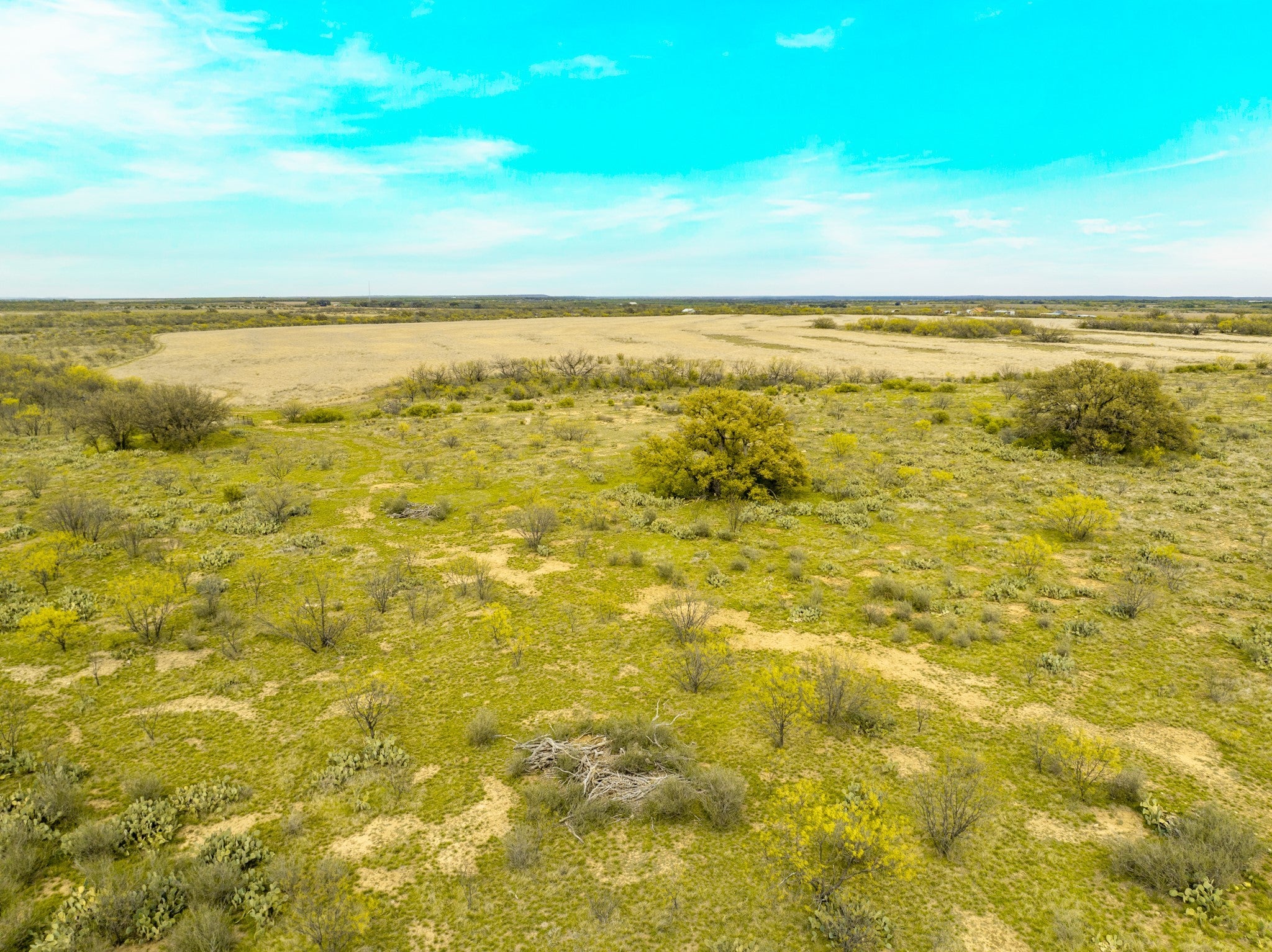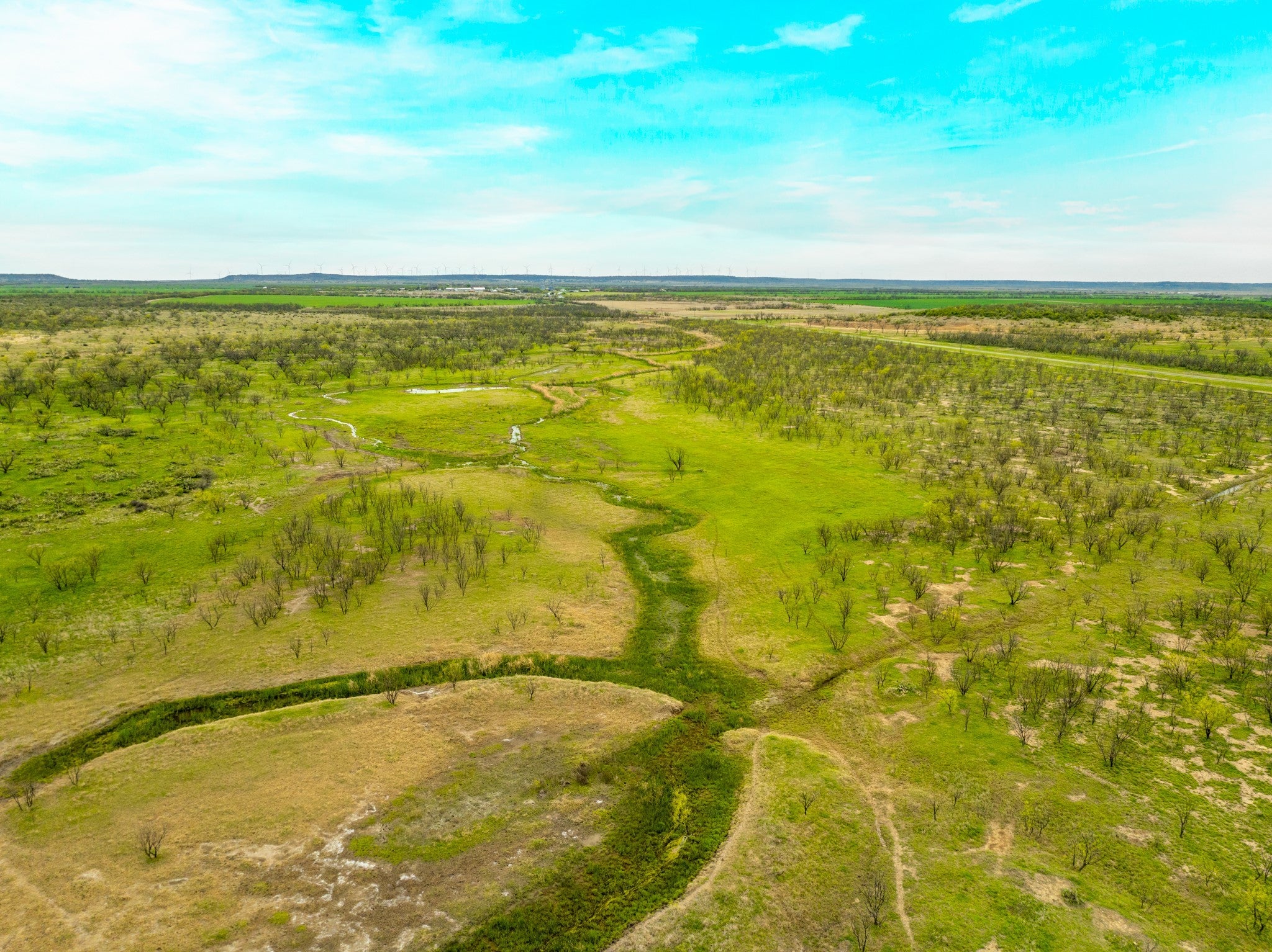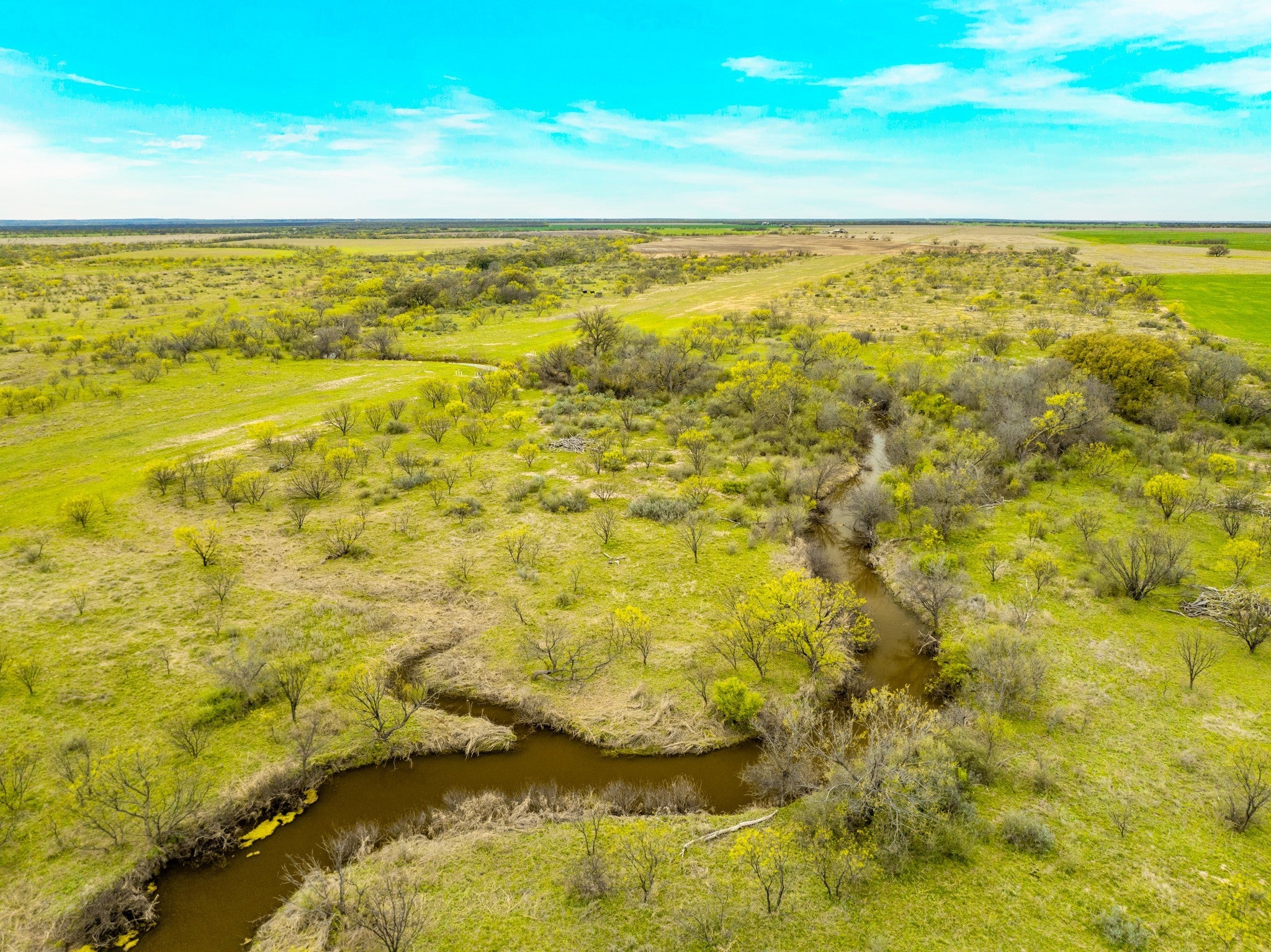 Welcome to Elm Creek Ranch, a 2,165 acre property in McCulloch County offers a rare opportunity to own a large, well-put-together ranch in the heart of Texas. This is a ranch you can step into and truly use, whether that’s building a family place to gather, running cattle, hunting, or holding as a long-term investment. The land lays out with a strong mix of productive bottomland, rolling terrain, and higher points with up to 100 feet of elevation change and wide views across the ranch. Two creeks run through the property, with both sides of each creek controlled. Little Elm Creek winds through the south end for over 1.5 miles, while Big Elm Creek runs through the north end for approximately 0.6 miles, adding character, habitat, and year-round appeal. The ranch is primarily mesquite with native brush, balanced by scattered live oaks and elm-lined creek bottoms, along with numerous fields planted in coastal grass and hay production. Water is a major highlight, with 20 stock ponds spread across the ranch, including one approximately 5 acres in size, along with additional water in both creeks after rains and several areas that offer potential for future lake sites. There are three water wells in place (one electric, one windmill, and one not currently equipped), as well as rural water access through Millersview-Doole Water Supply. The wildlife on the ranch consists of whitetail deer, turkey, hogs, coyotes, bobcats, and foxes. It is also not uncommon to see coveys of bobwhite quail while traveling through the ranch. Improvements include an original headquarters with two older homes, barns, outbuildings, working pens, about 2 miles of high fence, 7 miles of low perimeter fencing, cross fencing for rotational grazing, and a solid road system that allows you to comfortably access the entire property. Electricity is in place, and the property is currently under a 1-D-1 Agricultural Valuation for property tax purposes.