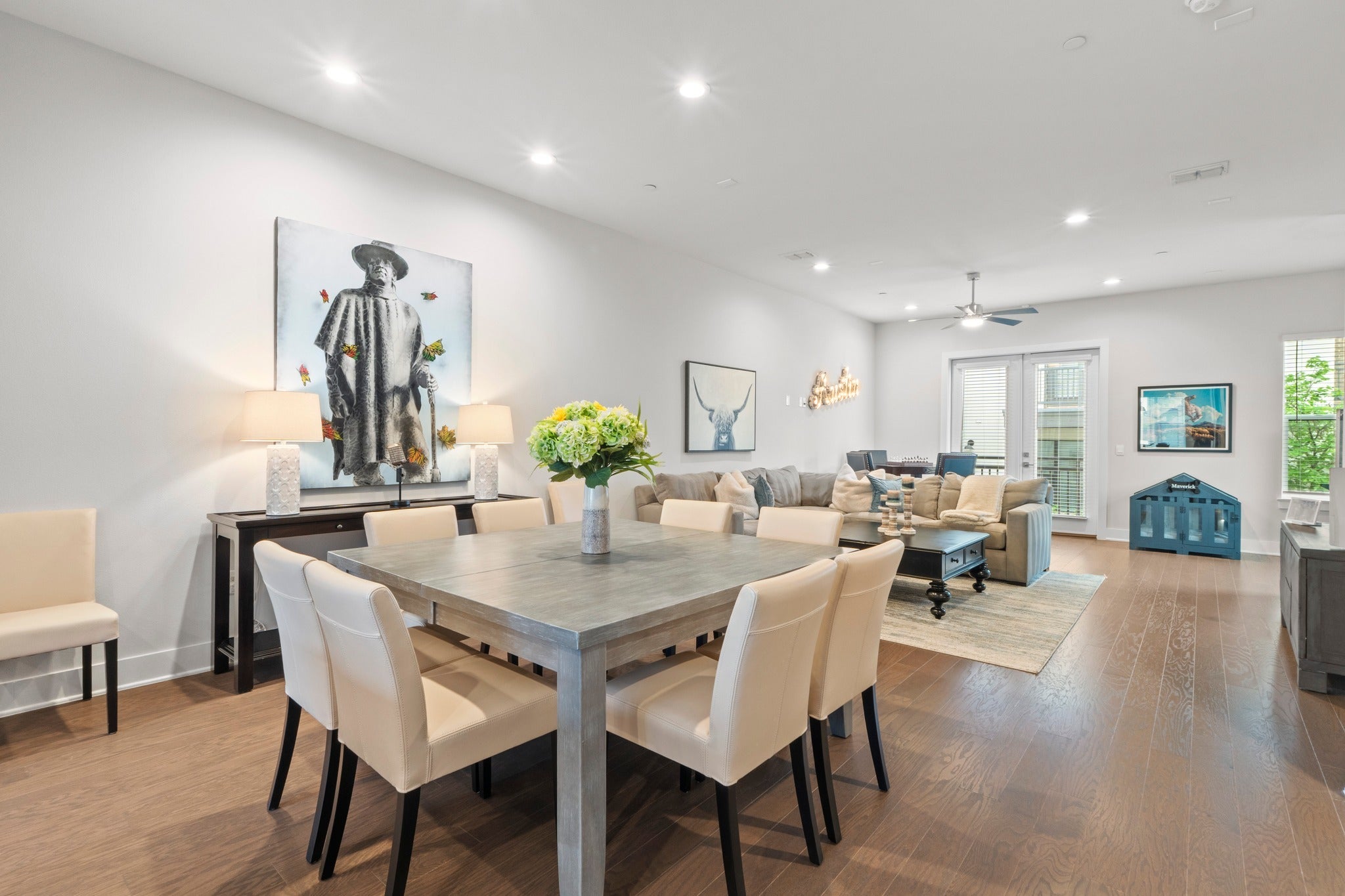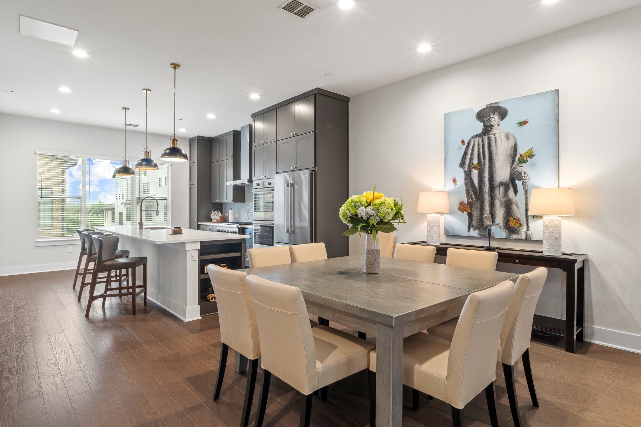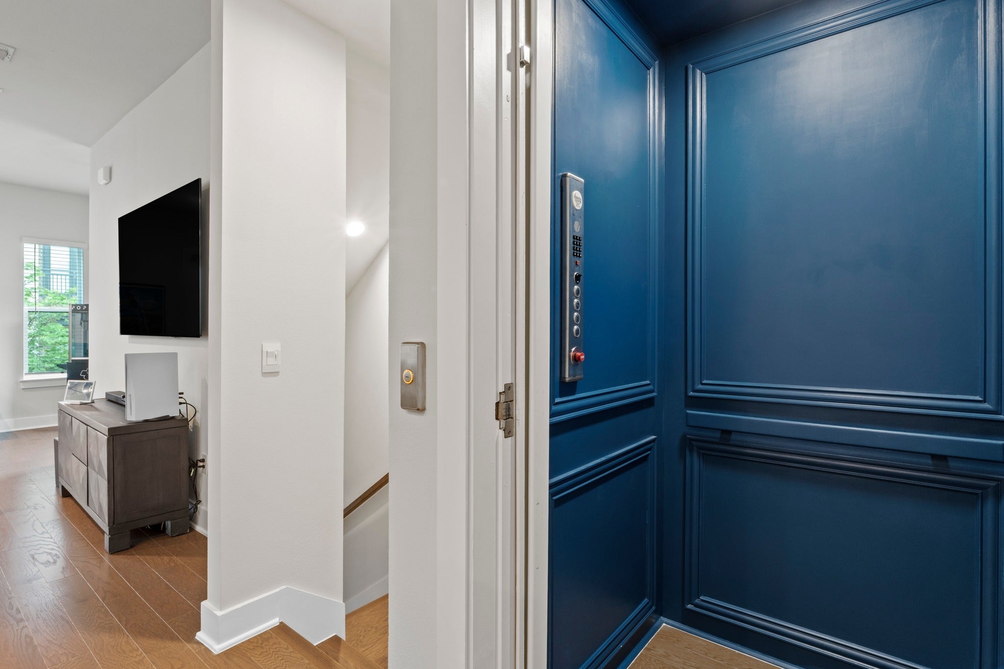 Experience elevated lock-and-leave living in Austin’s highly sought-after Grove community. This impeccably designed townhome blends modern luxury with effortless functionality. Clean architectural lines, soaring ceilings, and rich wood flooring set the tone for refined, contemporary living. The open-concept main level is designed for both entertaining and everyday comfort, featuring a stunning chef’s kitchen with quartz countertops, custom cabinetry, gas cooktop, double ovens, and an oversized island that anchors the space beautifully. The designer beverage center and coffee bar is an inviting, built-in feature with custom cabinetry, striking metallic tile backsplash, open wood shelving, and a dedicated wine refrigerator. Whether starting your morning with espresso or hosting evening cocktails, this thoughtfully designed space adds both style and function, elevating everyday living. The spacious living and dining areas flow seamlessly, filled with natural light and designed to accommodate gatherings of any size. Upstairs, the primary suite offers a true retreat, complete with a spa-inspired bath featuring dual vanities, a soaking tub, walk-in shower, and generous closet space. Secondary bedrooms are well-proportioned, offering flexibility for guests, office, or fitness needs. The private, fenced courtyard and patio is an inviting outdoor space ideal for pets or entertaining, all with minimal maintenance. Additional features include an attached alley-entry garage, smart home capabilities, central vacuum, and a private elevator providing convenient access across all levels. Situated just steps from The Grove’s signature green spaces, walking trails, and vibrant retail district—this home offers a truly connected lifestyle just minutes from Downtown, The Domain, UT, and Austin’s medical district. This is a rare opportunity to own a turn-key, luxury residence in one of Austin’s most dynamic and walkable communities.