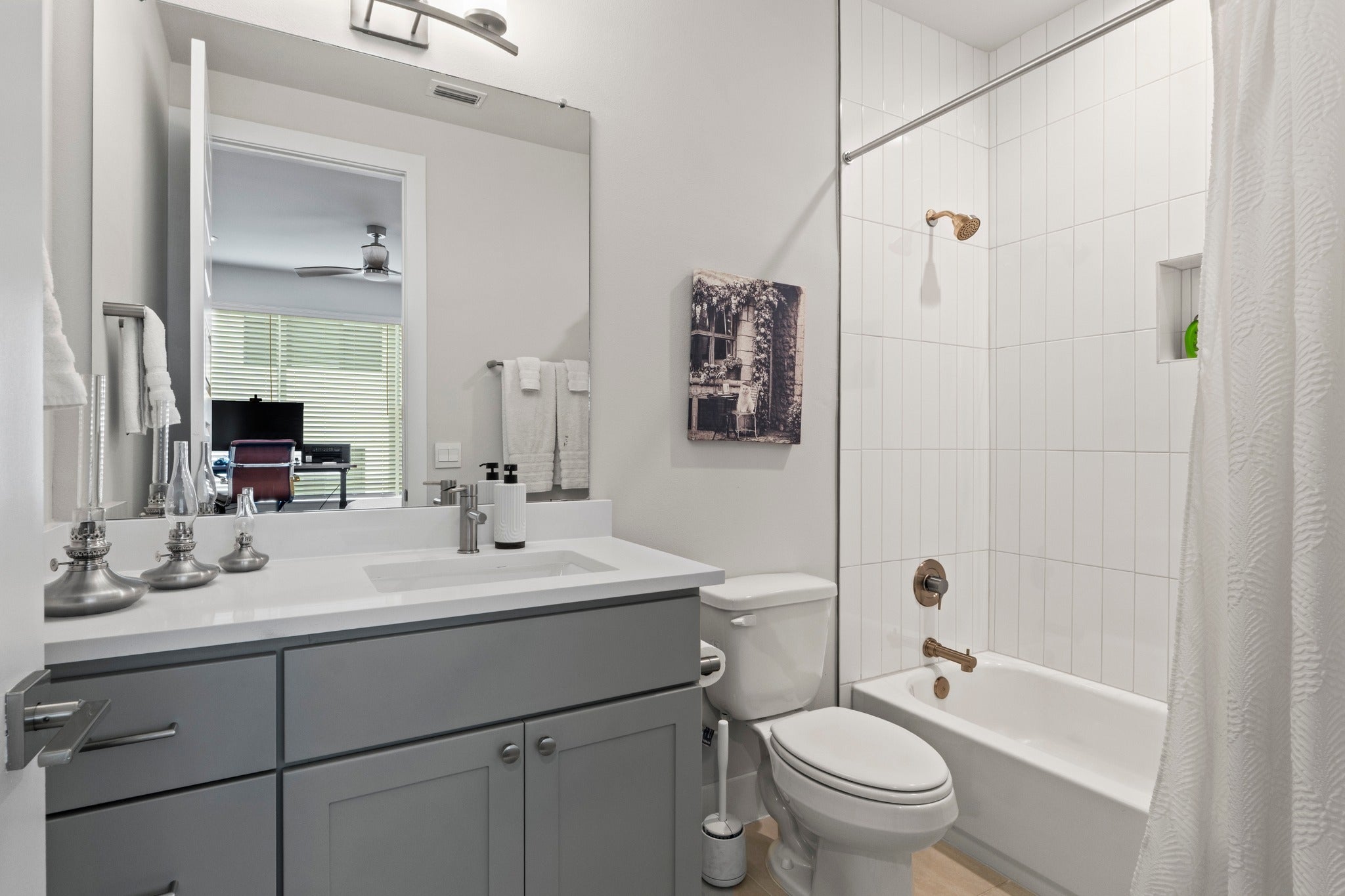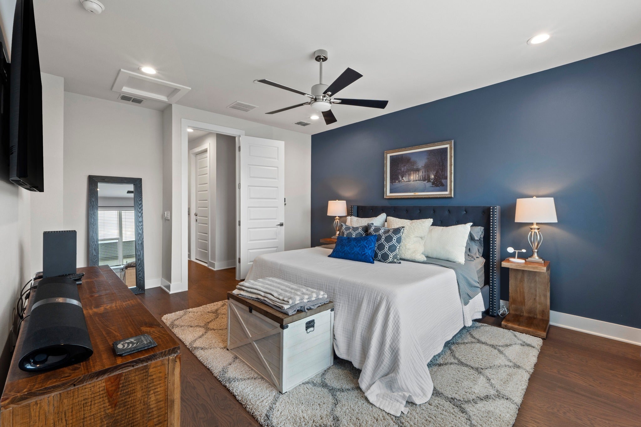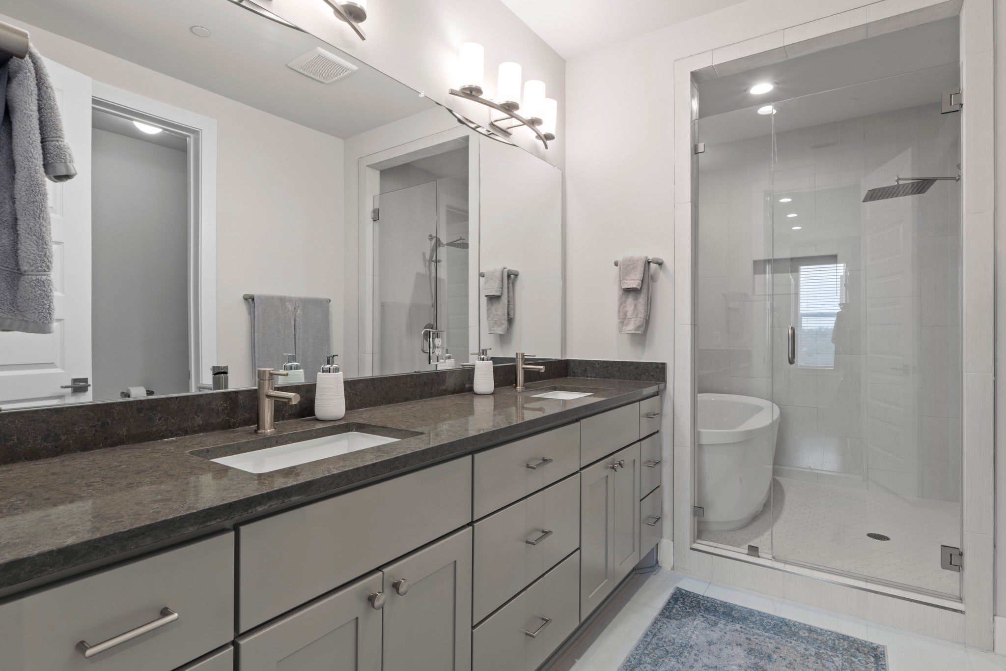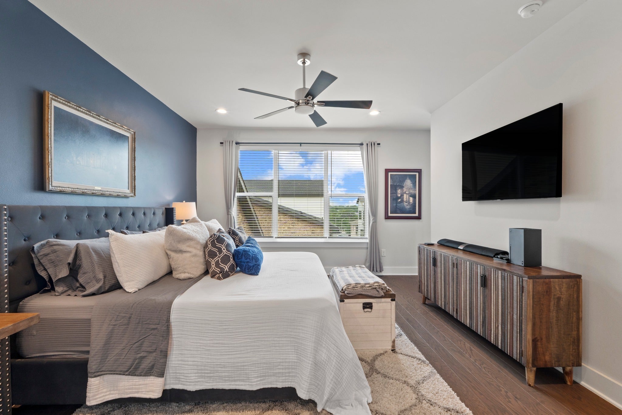 Experience elevated lock-and-leave living in Austin’s highly sought-after Grove community. This impeccably designed townhome blends modern luxury with effortless functionality. Clean architectural lines, soaring ceilings, and rich wood flooring set the tone for refined, contemporary living. The open-concept main level is designed for both entertaining and everyday comfort, featuring a stunning chef’s kitchen with quartz countertops, custom cabinetry, gas cooktop, double ovens, and an oversized island that anchors the space beautifully. The designer beverage center and coffee bar is an inviting, built-in feature with custom cabinetry, striking metallic tile backsplash, open wood shelving, and a dedicated wine refrigerator. Whether starting your morning with espresso or hosting evening cocktails, this thoughtfully designed space adds both style and function, elevating everyday living. The spacious living and dining areas flow seamlessly, filled with natural light and designed to accommodate gatherings of any size. Upstairs, the primary suite offers a true retreat, complete with a spa-inspired bath featuring dual vanities, a soaking tub, walk-in shower, and generous closet space. Secondary bedrooms are well-proportioned, offering flexibility for guests, office, or fitness needs. The private, fenced courtyard and patio is an inviting outdoor space ideal for pets or entertaining, all with minimal maintenance. Additional features include an attached alley-entry garage, smart home capabilities, central vacuum, and a private elevator providing convenient access across all levels. Situated just steps from The Grove’s signature green spaces, walking trails, and vibrant retail district—this home offers a truly connected lifestyle just minutes from Downtown, The Domain, UT, and Austin’s medical district. This is a rare opportunity to own a turn-key, luxury residence in one of Austin’s most dynamic and walkable communities.