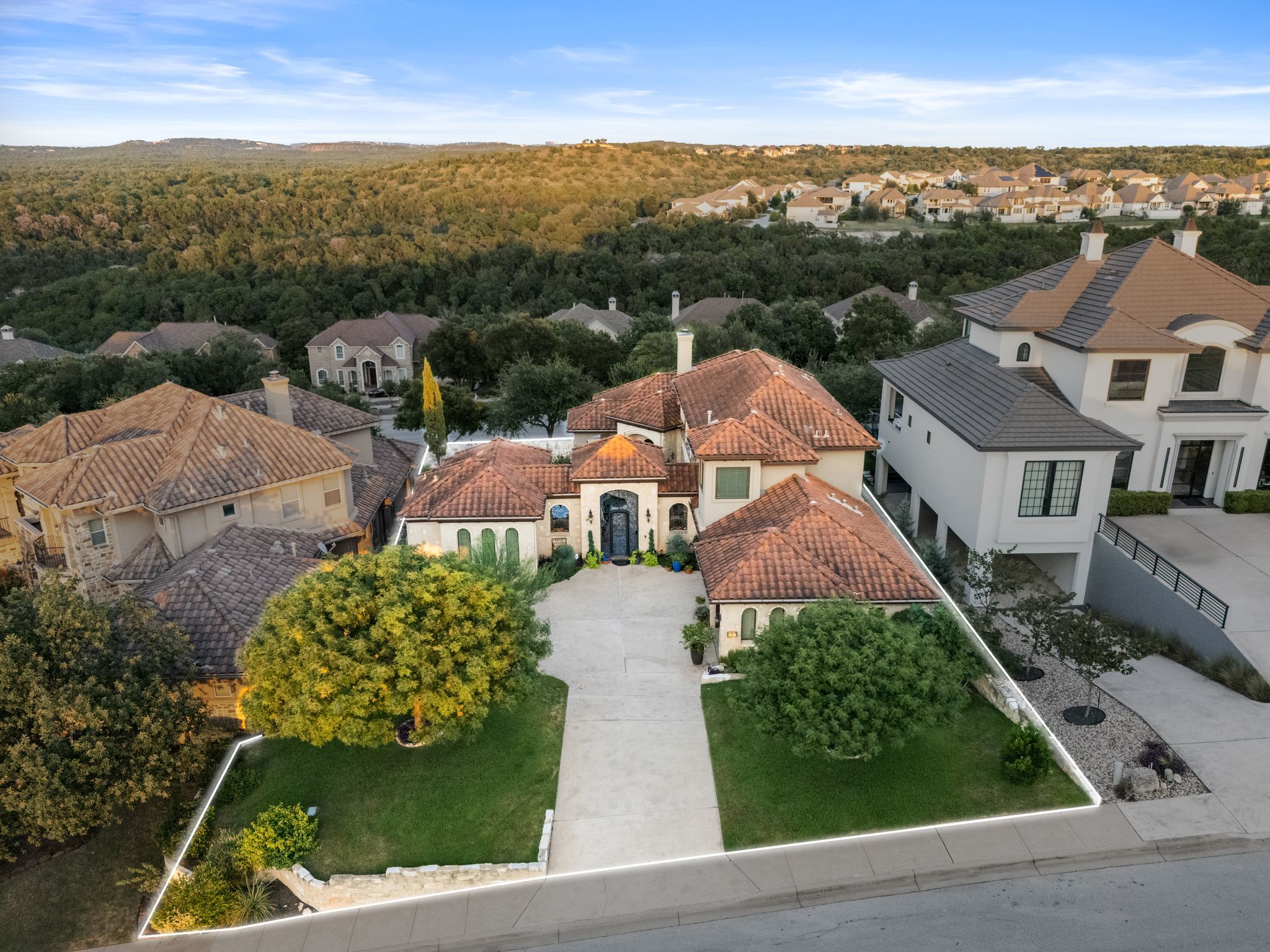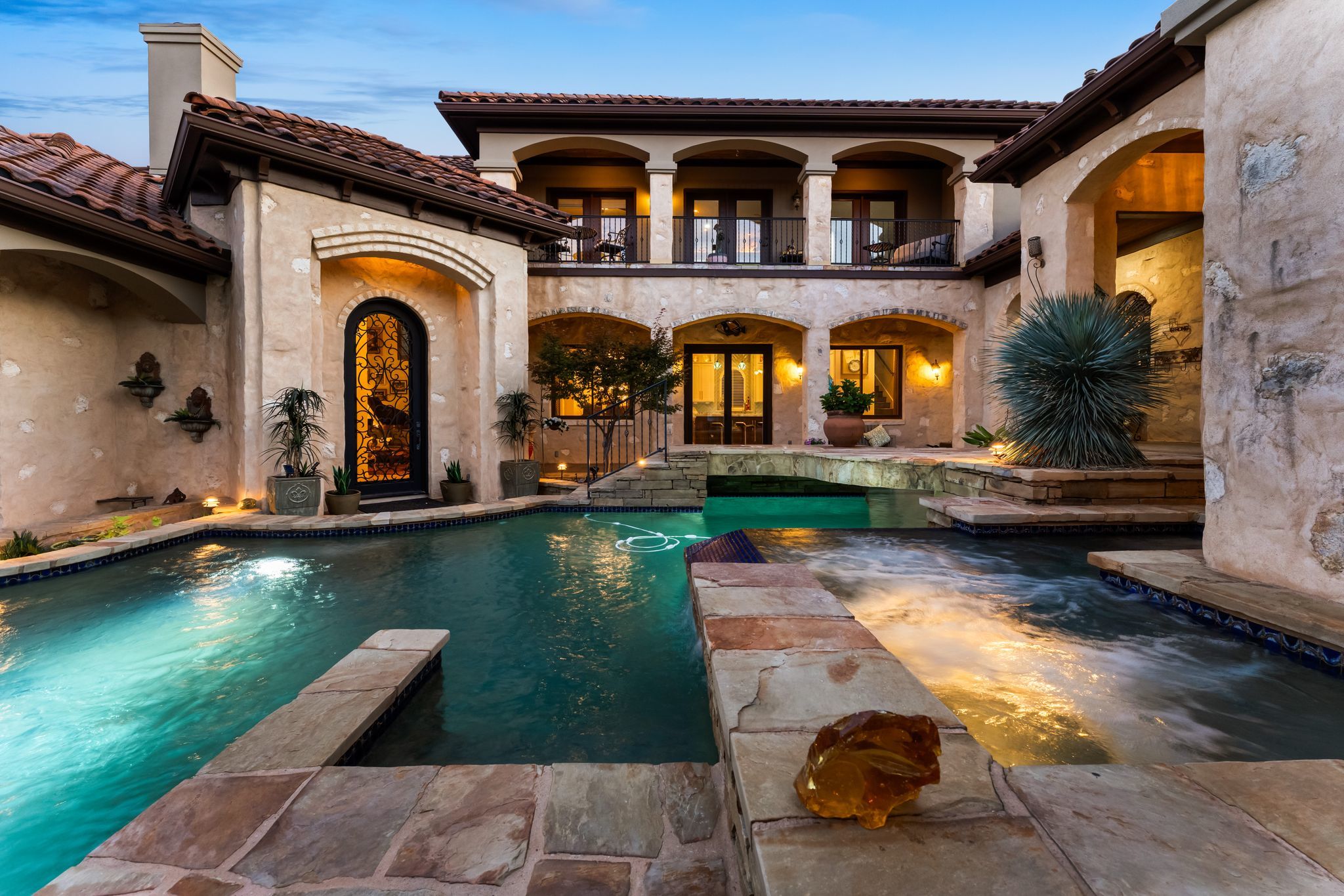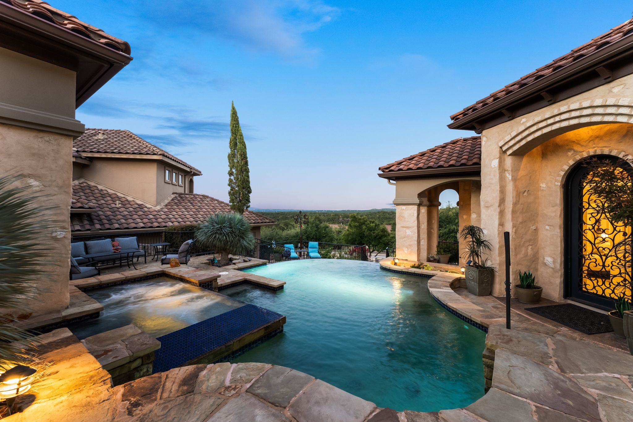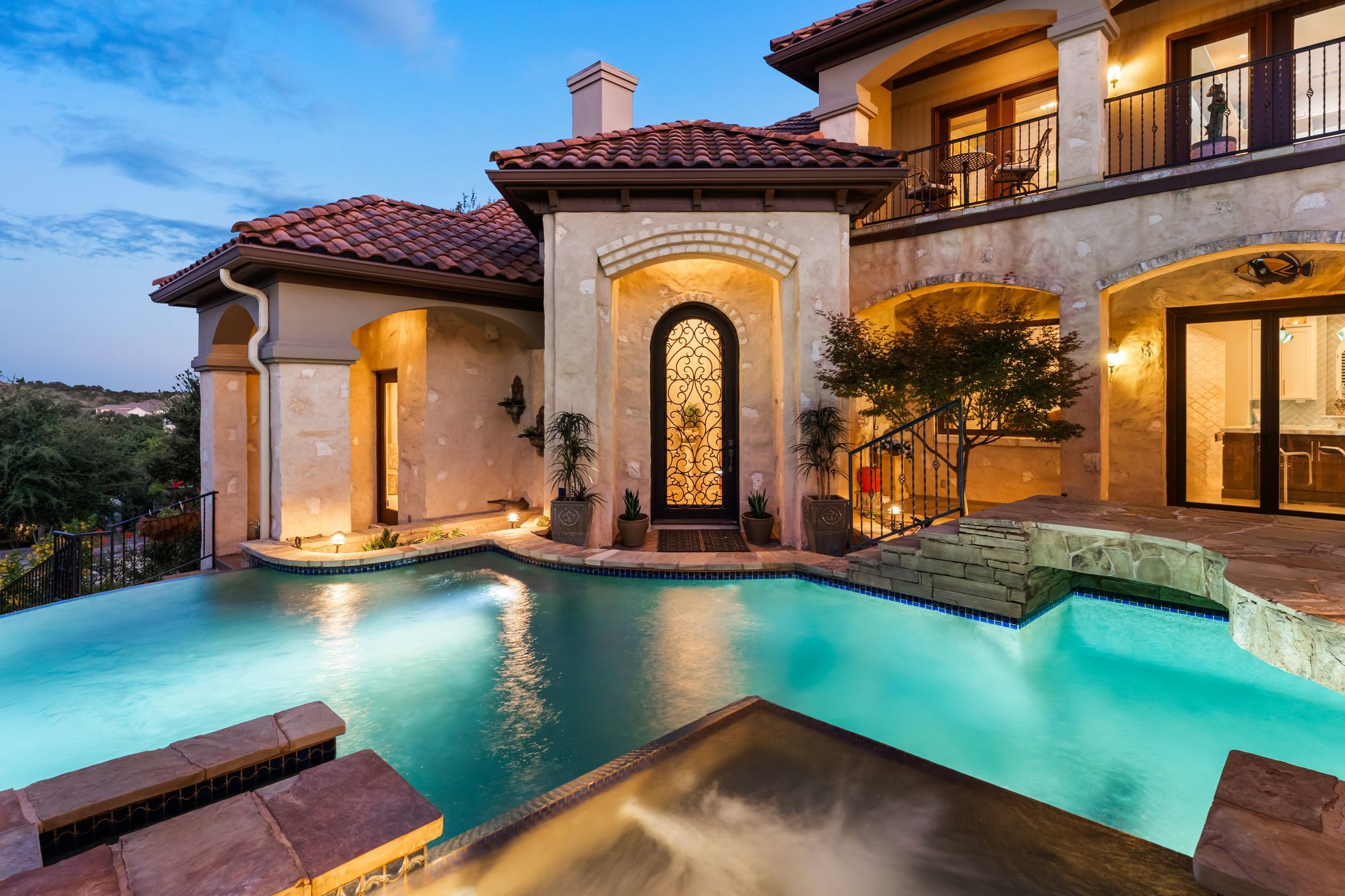 What if your backyard felt like a private resort - and Lake Austin was just a golf cart ride away? Set on a beautifully landscaped 0.4-acre lot in the coveted Lake Pointe community, this Mediterranean-inspired 4-bedroom, 4.5-bath villa pairs timeless architecture with a poolside lifestyle rarely found this close to the water. Inside, soaring ceilings, travertine floors, arched passageways, and a striking domed ceiling give the home a sense of character and warmth. The 2024-remodeled chef’s kitchen is both dramatic and functional, featuring backlit quartzite countertops, custom cabinetry, and an induction cooktop. A well-appointed utility room adds convenience with an ice maker, wine fridge, and additional storage. Designed for entertaining and everyday relaxation, the backyard feels like a private retreat with a heated infinity-edge pool and spa, outdoor kitchen, multiple patios, and mature trees providing privacy and shade. A detached casita with its own en suite bath offers ideal space for guests, extended family, or a quiet home office. Additional highlights include three fireplaces, automatic shades, plantation shutters, Renewal by Andersen windows and doors, zoned HVAC with newer systems (2017 & 2023), a 3-car garage with epoxy floors and built-ins, and a private basketball half-court. Lake Pointe residents enjoy private access to Lake Austin, scenic hiking trails, and Freedom Boat Club dock service, where your boat of choice is delivered directly to the community dock. The neighborhood is also adding two new docks, including a day dock with boat slips and a double-decker swim platform with sunning areas and a trapeze into the lake. Just one mile to Lake Pointe Elementary, a quick golf cart or e-bike ride to the lake, five minutes to Whole Foods, H-E-B, and the Hill Country Galleria, and approximately 20 minutes to Downtown Austin. Homes that combine this level of privacy, outdoor living, and lake lifestyle in Lake Pointe rarely come along.